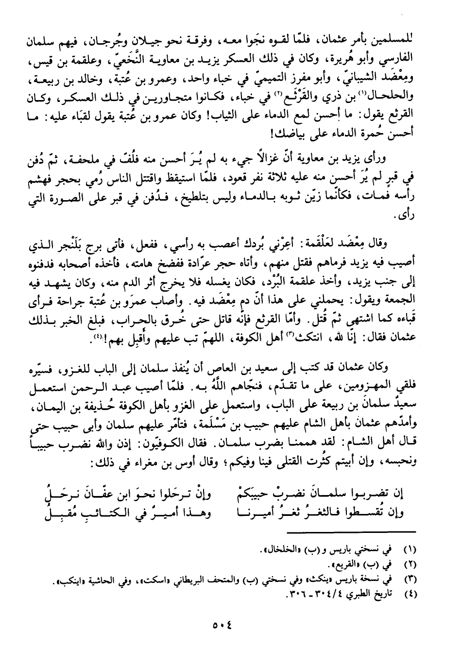 لِلْمُسْلِمِينَ بِأَمْرِ عُثْمَانَ، فَلَمَّا لَقُوهُ نَجَوْا مَعَهُ، وَفِرْقَةً نَحْوَ جِيلَانَ وَجُرْجَانَ، فِيهِمْ سَلْمَانُ الْفَارِسِيُّ وَأَبُو هُرَيْرَةَ، وَكَانَ فِي ذَلِكَ الْعَسْكَرِ يَزِيدُ بْنُ مُعَاوِيَةَ النَّخَعِيُّ، وَعَلْقَمَةُ بْنُ قَيْسٍ، وَمِعْضَدٌ الشَّيْبَانِيُّ، وَأَبُو مُفْرَزٍ التَّمِيمِيُّ فِي خِبَاءٍ وَاحِدٍ، وَعَمْرُو بْنُ عُتْبَةَ، وَخَالِدُ بْنُ رَبِيعَةَ، وَالْحِلْحَالُ بْنُ ذَرِيٍّ، وَالْقَرْثَعُ فِي خِبَاءٍ، فَكَانُوا مُتَجَاوِرِينَ فِي ذَلِكَ الْعَسْكَرِ، وَكَانَ الْقَرْثَعُ يَقُولُ: مَا أَحْسَنَ لَمْعَ الدِّمَاءِ عَلَى الثِّيَابِ! وَكَانَ عَمْرُو بْنُ عُتْبَةَ يَقُولُ لِقَبَاءٍ عَلَيْهِ: مَا أَحْسَنَ حُمْرَةَ الدِّمَاءِ عَلَى بَيَاضِكَ!