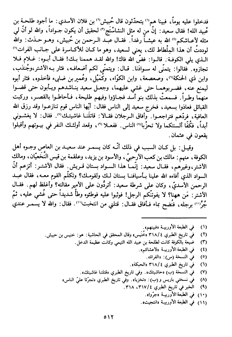 فَدَخَلُوا عَلَيْهِ يَوْمًا، فَبَيْنَا هُمْ يَتَحَدَّثُونَ قَالَ حُبَيْشُ بْنُ فُلَانٍ الْأَسَدِيُّ: مَا أَجْوَدَ طَلْحَةَ بْنَ عُبَيْدِ اللَّهِ! فَقَالَ سَعِيدٌ: إِنَّ مَنْ لَهُ مِثْلُ النَّشَاسْتَجِ لَحَقِيقٌ أَنْ يَكُونَ جَوَادًا، وَاللَّهِ لَوْ أَنَّ لِي مِثْلَهُ لَأَعَاشَكُمُ اللَّهُ بِهِ عَيْشًا رَغَدًا. فَقَالَ عَبْدُ الرَّحْمَنِ بْنُ حُبَيْشٍ، وَهُوَ حَدَثٌ: وَاللَّهِ لَوَدِدْتُ أَنَّ هَذَا الْمِلْطَاطَ لَكَ، يَعْنِي لِسَعِيدٍ، وَهُوَ مَا كَانَ لِلْأَكَاسِرَةِ عَلَى جَانِبِ الْفُرَاتِ الَّذِي يَلِي الْكُوفَةَ. قَالُوا: فَضَّ اللَّهُ فَاكَ! وَاللَّهِ لَقَدْ هَمَمْنَا بِكَ! فَقَالَ أَبُوهُ: غُلَامٌ فَلَا تَجَاوَزُهُ. فَقَالُوا: يَتَمَنَّى لَهُ سَوَادَنَا. قَالَ: وَيَتَمَنَّى لَكُمْ أَضْعَافَهُ، فَثَارَ بِهِ الْأَشْتَرُ، وَجُنْدَبٌ، وَابْنُ ذِي الْحِنْكَةِ، وَصَعْصَعَةُ، وَابْنُ الْكَوَّاءِ، وَكُمَيْلٌ، وَعُمَيْرُ بْنُ ضَابِئٍ فَأَخَذُوهُ، فَثَارَ أَبُوهُ لِيَمْنَعَ عَنْهُ، فَضَرَبُوهُمَا حَتَّى غُشِيَ عَلَيْهِمَا، وَجَعَلَ سَعِيدٌ يُنَاشِدُهُمْ وَيَأْبَوْنَ حَتَّى قَضَوْا مِنْهُمَا وَطَرًا. فَسَمِعَتْ بِذَلِكَ بَنُو أَسَدٍ فَجَاءُوا وَفِيهِمْ طُلَيْحَةُ، فَأَحَاطُوا بِالْقَصْرِ، وَرَكِبَتِ الْقَبَائِلُ فَعَاذُوا بِسَعِيدٍ، فَخَرَجَ سَعِيدٌ إِلَى النَّاسِ فَقَالَ: أَيُّهَا النَّاسُ قَوْمٌ تَنَازَعُوا وَقَدْ رَزَقَ اللَّهُ الْعَافِيَةَ، فَرَدَّهُمْ فَتَرَاجَعُوا. وَأَفَاقَ الرَّجُلَانِ فَقَالَا: قَاتَلَنَا غَاشِيَتُكَ. فَقَالَ: لَا يَغْشَوْنِي أَبَدًا، فَكُفَّا أَلْسِنَتَكُمَا وَلَا تُحَزِّبَا النَّاسَ. فَفَعَلَا، وَقَعَدَ أُولَئِكَ النَّفَرُ فِي بُيُوتِهِمْ وَأَقْبَلُوا يَقَعُونَ فِي عُثْمَانَ.