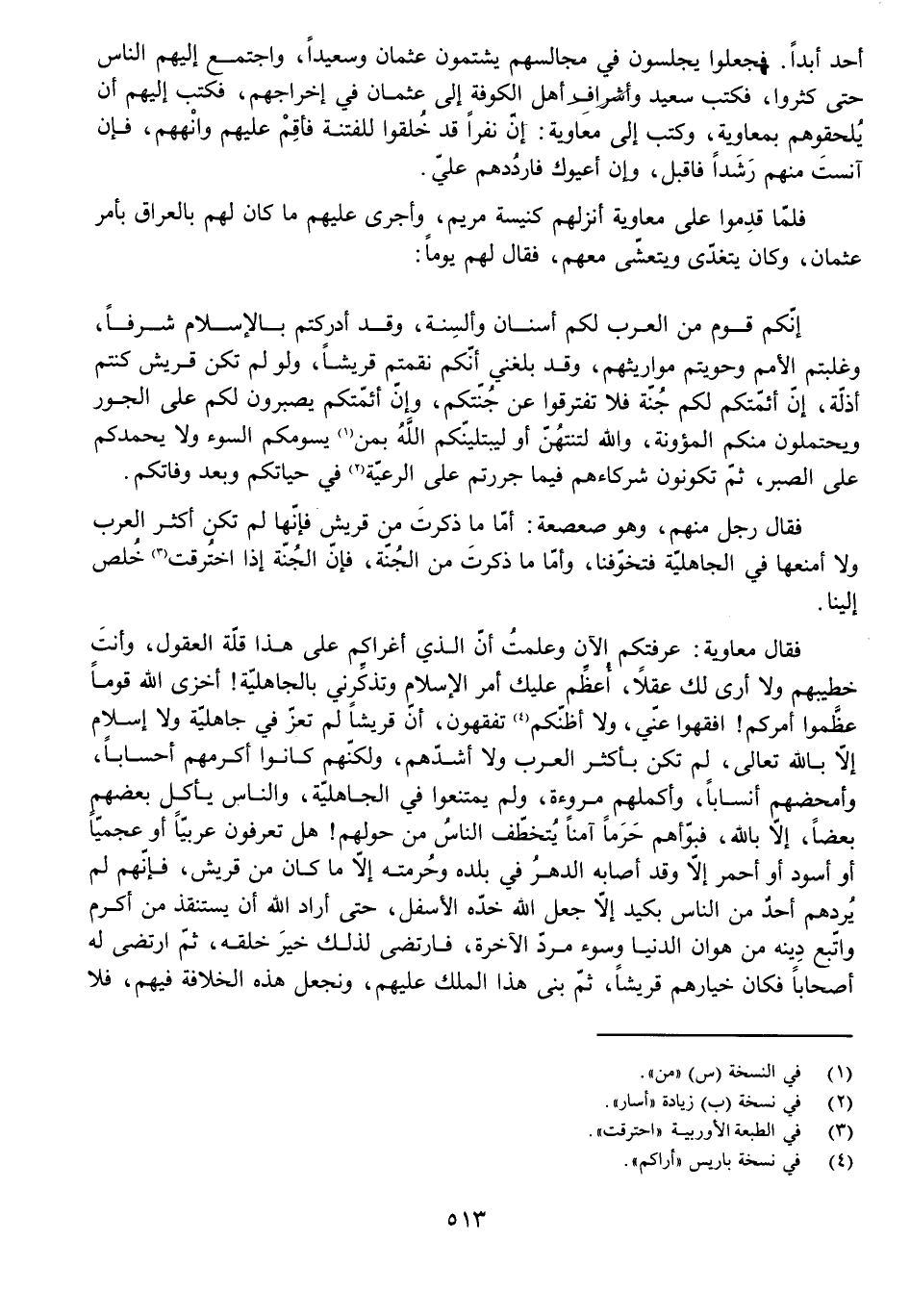 فَقَالَ مُعَاوِيَةُ: عَرَفْتُكُمُ الْآنَ وَعَلِمْتُ أَنَّ الَّذِي أَغْرَاكُمْ عَلَى هَذَا قِلَّةُ الْعُقُولِ، وَأَنْتَ خَطِيبُهُمْ وَلَا أَرَى لَكَ عَقْلًا، أُعَظِّمُ عَلَيْكَ أَمْرَ الْإِسْلَامِ وَتُذَكِّرُنِي بِالْجَاهِلِيَّةِ! أَخْزَى اللَّهُ قَوْمًا عَظَّمُوا أَمْرَكُمْ! افْقَهُوا عَنِّي، وَلَا أَظُنُّكُمْ تَفْقَهُونَ أَنَّ قُرَيْشًا لَمْ تُعَزَّ فِي جَاهِلِيَّةٍ وَلَا إِسْلَامٍ إِلَّا بِاللَّهِ تَعَالَى، لَمْ تَكُنْ بِأَكْثَرِ الْعَرَبِ وَلَا أَشَدِّهِمْ، وَلَكِنَّهُمْ كَانُوا أَكْرَمَهُمْ أَحْسَابًا، وَأَمْحَضَهُمْ أَنْسَابًا، وَأَكْمَلَهُمْ مُرُوءَةً، وَلَمْ يَمْتَنِعُوا فِي الْجَاهِلِيَّةِ، وَالنَّاسُ يَأْكُلُ بَعْضُهُمْ بَعْضًا، إِلَّا بِاللَّهِ، فَبَوَّأَهُمْ حَرَمًا آمِنًا يُتَخَطَّفُ النَّاسُ مِنْ حَوْلِهِمْ! هَلْ تَعْرِفُونَ عَرَبِيًّا أَوْ عَجَمِيًّا أَوْ أَسْوَدَ أَوْ أَحْمَرَ إِلَّا وَقَدْ أَصَابَهُ الدَّهْرُ فِي بَلَدِهِ وَحُرْمَتِهِ إِلَّا مَا كَانَ مِنْ قُرَيْشٍ، فَإِنَّهُمْ لَمْ يُرِدْهُمْ أَحَدٌ مِنَ النَّاسِ بِكَيْدٍ إِلَّا جَعَلَ اللَّهُ خَدَّهُ الْأَسْفَلَ، حَتَّى أَرَادَ اللَّهُ أَنْ يَسْتَنْقِذَ مَنْ أَكْرَمَ وَاتَّبَعَ دِينَهُ مِنْ هَوَانِ الدُّنْيَا وَسُوءِ مَرَدِّ الْآخِرَةِ، فَارْتَضَى لِذَلِكَ خَيْرَ خَيْرِ خَلْقِهِ، ثُمَّ ارْتَضَى لَهُ أَصْحَابًا فَكَانَ خِيَارُهُمْ قُرَيْشًا، ثُمَّ بَنَى هَذَا الْمُلْكَ عَلَيْهِمْ، وَنَجْعَلُ هَذِهِ الْخِلَافَةَ فِيهِمْ، فَلَا