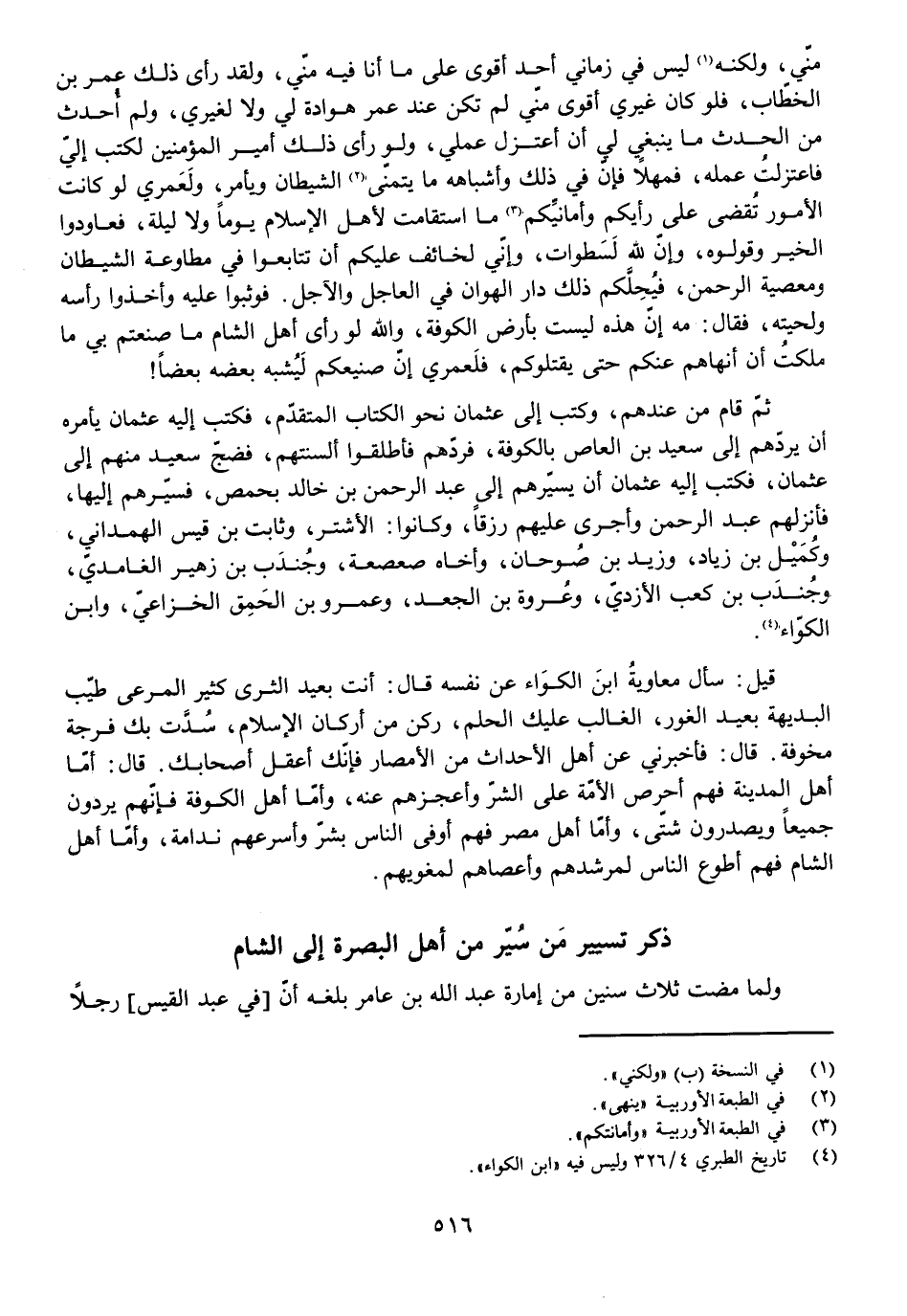 ثُمَّ قَامَ مِنْ عِنْدِهِمْ، وَكَتَبَ إِلَى عُثْمَانَ نَحْوَ الْكِتَابِ الْمُتَقَدِّمِ، فَكَتَبَ إِلَيْهِ عُثْمَانُ يَأْمُرُهُ أَنْ يَرُدَّهُمْ إِلَى سَعِيدِ بْنِ الْعَاصِ بِالْكُوفَةِ، فَرَدَّهُمْ فَأَطْلَقُوا أَلْسِنَتَهُمْ، فَضَجَّ سَعِيدٌ مِنْهُمْ إِلَى عُثْمَانَ، فَكَتَبَ إِلَيْهِ عُثْمَانُ أَنْ يُسَيِّرَهُمْ إِلَى عَبْدِ الرَّحْمَنِ بْنِ خَالِدٍ بِحِمْصَ، فَسَيَّرَهُمْ إِلَيْهَا، فَأَنْزَلَهُمْ عَبْدُ الرَّحْمَنِ وَأَجْرَى عَلَيْهِمْ رِزْقًا، وَكَانُوا: الْأَشْتَرَ، وَثَابِتَ بْنَ قَيْسٍ الْهَمْدَانِيَّ، وَكُمَيْلَ بْنَ زِيَادٍ، وَزَيْدَ بْنَ صُوحَانَ، وَأَخَاهُ صَعْصَعَةَ، وَجُنْدَبَ بْنَ زُهَيْرٍ الْغَامِدِيَّ، وَجُنْدَبَ بْنَ كَعْبٍ الْأَزْدِيَّ، وَعُرْوَةَ بْنَ الْجَعْدِ، وَعَمْرَو بْنَ الْحَمِقِ الْخُزَاعِيَّ، وَابْنَ الْكَوَّاءِ.