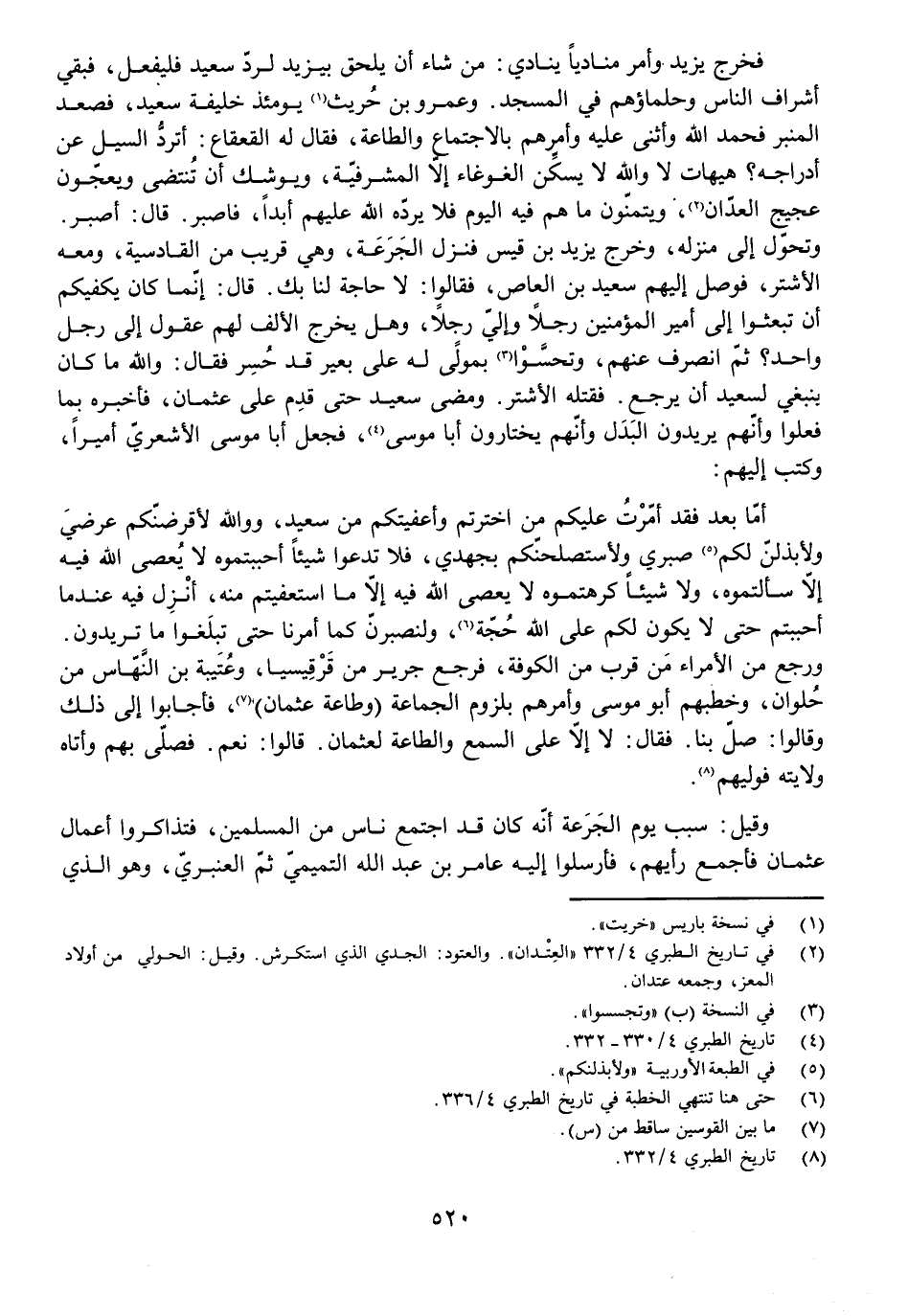 فَخَرَجَ يَزِيدُ وَأَمَرَ مُنَادِيًا يُنَادِي: مَنْ شَاءَ أَنْ يَلْحَقَ بِيَزِيدَ لِرَدِّ سَعِيدٍ فَلْيَفْعَلْ، فَبَقِيَ أَشْرَافُ النَّاسِ وَحُلَمَاؤُهُمْ فِي الْمَسْجِدِ. وَعَمْرُو بْنُ حُرَيْثٍ يَوْمَئِذٍ خَلِيفَةُ سَعِيدٍ، فَصَعِدَ الْمِنْبَرَ فَحَمِدَ اللَّهَ وَأَثْنَى عَلَيْهِ وَأَمَرَهُمْ بِالِاجْتِمَاعِ وَالطَّاعَةِ، فَقَالَ لَهُ الْقَعْقَاعُ: أَتَرُدُّ السَّيْلَ عَنْ أَدْرَاجِهِ؟ هَيْهَاتَ لَا وَاللَّهِ لَا يُسْكِنُ الْغَوْغَاءَ إِلَّا الْمَشْرَفِيَّةُ، وَيُوشِكُ أَنْ تُنْتَضَى وَيَعُجُّونَ عَجِيجَ الْعَدَّانِ، وَيَتَمَنَّوْنَ مَا هُمْ فِيهِ الْيَوْمَ فَلَا يَرُدُّهُ اللَّهُ عَلَيْهِمْ أَبَدًا، فَاصْبِرْ. قَالَ: أَصْبِرُ. وَتَحَوَّلَ إِلَى مَنْزِلِهِ، وَخَرَجَ يَزِيدُ بْنُ قَيْسٍ فَنَزَلَ الْجَرَعَةَ، وَهِيَ قَرِيبٌ مِنَ الْقَادِسِيَّةِ، وَمَعَهُ الْأَشْتَرُ، فَوَصَلَ إِلَيْهِمْ سَعِيدُ بْنُ الْعَاصِ، فَقَالُوا: لَا حَاجَةَ لَنَا بِكَ. قَالَ: إِنَّمَا كَانَ يَكْفِيكُمْ أَنْ تَبْعَثُوا إِلَى أَمِيرِ الْمُؤْمِنِينَ رَجُلًا وَإِلَيَّ رَجُلًا، وَهَلْ يَخْرُجُ الْأَلْفُ لَهُمْ عُقُولٌ إِلَى رَجُلٍ وَاحِدٍ؟ ثُمَّ انْصَرَفَ عَنْهُمْ، وَتَحَسَّوْا بِمَوْلًى لَهُ عَلَى بَعِيرٍ قَدْ حُسِرَ فَقَالَ: وَاللَّهِ مَا كَانَ يَنْبَغِي لِسَعِيدٍ أَنْ يَرْجِعَ. فَقَتَلَهُ الْأَشْتَرُ. وَمَضَى سَعِيدٌ حَتَّى قَدِمَ عَلَى عُثْمَانَ، فَأَخْبَرَهُ بِمَا فَعَلُوا وَأَنَّهُمْ يُرِيدُونَ الْبَدَلَ وَأَنَّهُمْ يَخْتَارُونَ أَبَا مُوسَى، فَجَعَلَ أَبَا مُوسَى الْأَشْعَرِيَّ أَمِيرًا، وَكَتَبَ إِلَيْهِمْ: