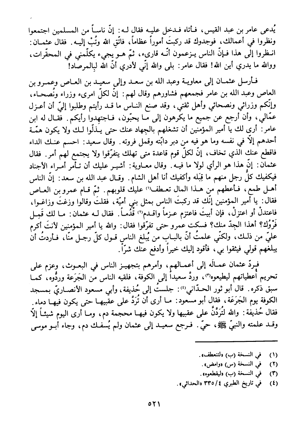 فَأَرْسَلَ عُثْمَانُ إِلَى مُعَاوِيَةَ وَعَبْدِ اللَّهِ بْنِ سَعْدٍ وَإِلَى سَعِيدِ بْنِ الْعَاصِ وَعَمْرِو بْنِ الْعَاصِ وَعَبْدِ اللَّهِ بْنِ عَامِرٍ فَجَمَعَهُمْ فَشَاوَرَهُمْ وَقَالَ لَهُمْ: إِنَّ لِكُلِّ امْرِئٍ وُزَرَاءٌ وَنُصَحَاءُ، وَإِنَّكُمْ وُزَرَائِي وَنُصَحَائِي وَأَهْلُ ثِقَتِي، وَقَدْ صَنَعَ النَّاسُ مَا قَدْ رَأَيْتُمْ وَطَلَبُوا إِلَيَّ أَنْ أَعْزِلَ عُمَّالِي، وَأَنْ أَرْجِعَ عَنْ جَمِيعِ مَا يَكْرَهُونَ إِلَى مَا يُحِبُّونَ، فَاجْتَهِدُوا رَأْيَكُمْ. فَقَالَ لَهُ ابْنُ عَامِرٍ: أَرَى لَكَ يَا أَمِيرَ الْمُؤْمِنِينَ أَنْ تَشْغَلَهُمْ بِالْجِهَادِ عَنْكَ حَتَّى يَذِلُّوا لَكَ وَلَا يَكُونَ هِمَّةُ أَحَدِهِمْ إِلَّا فِي نَفْسِهِ وَمَا هُوَ فِيهِ مِنْ دُبُرِ دَابَّتِهِ وَقَمْلِ فَرْوَتِهُ. وَقَالَ سَعِيدٌ: احْسِمْ عَنْكَ الدَّاءَ فَاقْطَعْ عَنْكَ الَّذِي تَخَافُ، إِنَّ لِكُلِّ قَوْمٍ قَاعِدَةً مَتَى تَهْلِكْ يَتَفَرَّقُوا وَلَا يَجْتَمِعْ لَهُمْ أَمْرٌ. فَقَالَ عُثْمَانُ: إِنَّ هَذَا هُوَ الرَّأْيُ لَوْلَا مَا فِيهِ. وَقَالَ مُعَاوِيَةُ: أُشِيرُ عَلَيْكَ أَنْ تَأْمُرَ أُمَرَاءَ الْأَجْنَادِ فَيَكْفِيَكَ كُلُّ رَجُلٍ مِنْهُمْ مَا قِبَلَهُ وَأَكْفِيَكَ أَنَا أَهْلَ الشَّامِ. وَقَالَ عَبْدُ اللَّهِ بْنُ سَعْدٍ: إِنَّ النَّاسَ أَهْلُ طَمَعٍ، فَأَعْطِهِمْ مِنْ هَذَا الْمَالِ تَعْطِفْ عَلَيْكَ قُلُوبُهُمْ. ثُمَّ قَامَ عَمْرُو بْنُ الْعَاصِ فَقَالَ: يَا أَمِيرَ الْمُؤْمِنِينَ إِنَّكَ قَدْ رَكِبْتَ النَّاسَ بِمِثْلِ بَنِي أُمَيَّةَ، فَقُلْتَ وَقَالُوا وَزُغْتَ وَزَاغُوا، فَاعْتَدِلْ أَوِ اعْتَزِلْ، فَإِنْ أَبَيْتَ فَاعْتَزِمْ عَزْمًا وَاقْدُمْ قُدُمًا. فَقَالَ لَهُ عُثْمَانُ: مَا لَكَ قَمِلَ فَرْوُكَ؟ أَهَذَا الْجِدُّ مِنْكَ؟ فَسَكَتَ عَمْرٌو حَتَّى تَفَرَّقُوا فَقَالَ: وَاللَّهِ يَا أَمِيرَ الْمُؤْمِنِينَ لَأَنْتَ أَكْرَمُ عَلَيَّ مِنْ ذَلِكَ، وَلَكِنِّي عَلِمْتُ أَنَّ بِالْبَابِ مَنْ يُبَلِّغُ النَّاسَ قَوْلَ كُلِّ رَجُلٍ مِنَّا، فَأَرَدْتُ أَنْ يَبْلُغَهُمْ قَوْلِي فَيَثِقُوا بِي، فَأَقُودَ إِلَيْكَ خَيْرًا وَأَدْفَعَ عَنْكَ شَرًّا.