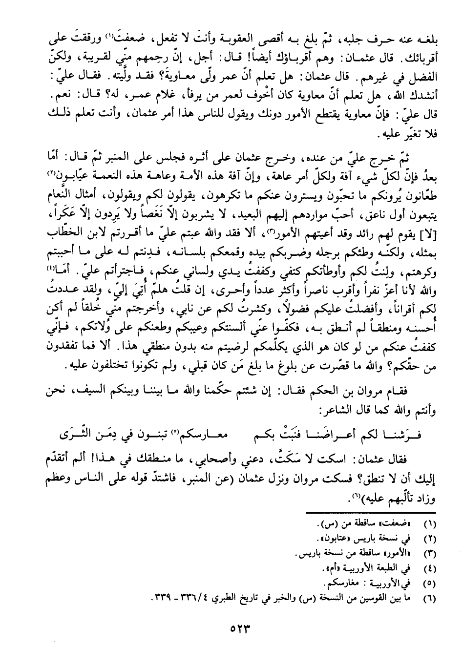 فَقَالَ عُثْمَانُ: اسْكُتْ لَا سَكَتَّ، دَعْنِي وَأَصْحَابِي، مَا مَنْطِقُكَ فِي هَذَا! أَلَمْ أَتَقَدَّمْ إِلَيْكَ أَنْ لَا تَنْطِقَ؟ فَسَكَتَ مَرْوَانُ وَنَزَلَ عُثْمَانُ. (عَنِ الْمِنْبَرِ، فَاشْتَدَّ قَوْلُهُ عَلَى النَّاسِ وَعَظُمَ وَزَادَ تَأَلُّبُهُمْ عَلَيْهِ) .
