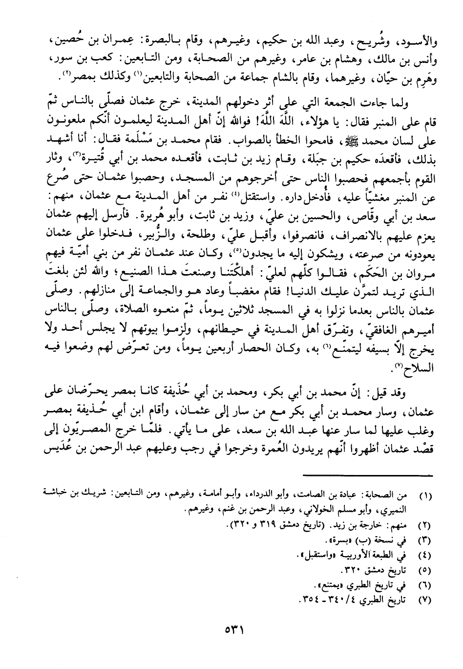 وَلَمَّا جَاءَتِ الْجُمُعَةُ الَّتِي عَلَى أَثَرِ دُخُولِهِمُ الْمَدِينَةَ، خَرَجَ عُثْمَانُ فَصَلَّى بِالنَّاسِ ثُمَّ قَامَ عَلَى الْمِنْبَرِ فَقَالَ: يَا هَؤُلَاءِ، اللَّهَ اللَّهَ! فَوَاللَّهِ إِنَّ أَهْلَ الْمَدِينَةِ لَيَعْلَمُونَ أَنَّكُمْ مَلْعُونُونَ عَلَى لِسَانِ مُحَمَّدٍ - صَلَّى اللَّهُ عَلَيْهِ وَآلِهِ وَسَلَّمَ - فَامْحُوا الْخَطَأَ بِالصَّوَابِ. فَقَامَ مُحَمَّدُ بْنُ مَسْلَمَةَ فَقَالَ: أَنَا أَشْهَدُ بِذَلِكَ، فَأَقْعَدَهُ حَكِيمُ بْنُ جَبَلَةَ، وَقَامَ زَيْدُ بْنُ ثَابِتٍ، فَأَقْعَدَهُ مُحَمَّدُ بْنُ أَبِي قُتَيْرَةَ، وَثَارَ الْقَوْمُ بِأَجْمَعِهِمْ فَحَصَبُوا النَّاسَ حَتَّى أَخْرَجُوهُمْ مِنَ الْمَسْجِدِ، وَحَصَبُوا عُثْمَانَ حَتَّى صُرِعَ عَنِ الْمِنْبَرِ مَغْشِيًّا عَلَيْهِ، فَأُدْخِلَ دَارَهُ وَاسْتَقْتَلَ نَفَرٌ مِنْ أَهْلِ الْمَدِينَةِ مَعَ عُثْمَانَ، مِنْهُمْ: سَعْدُ بْنُ أَبِي وَقَّاصٍ، وَالْحُسَيْنُ بْنُ عَلِيٍّ، وَزَيْدُ بْنُ ثَابِتٍ، وَأَبُو هُرَيْرَةَ. فَأَرْسَلَ إِلَيْهِمْ عُثْمَانُ يَعْزِمُ عَلَيْهِمْ بِالِانْصِرَافِ، فَانْصَرَفُوا، وَأَقْبَلَ عَلِيٌّ، وَطَلْحَةُ، وَالزُّبَيْرُ، فَدَخَلُوا عَلَى عُثْمَانَ يَعُودُونَهُ مِنْ صَرْعَتِهِ، وَيَشْكُونَ إِلَيْهِ مَا يَجِدُونَ، وَكَانَ عِنْدَ عُثْمَانَ نَفَرٌ مِنْ بَنِي أُمَيَّةَ فِيهِمْ مَرْوَانُ بْنُ الْحَكَمِ، فَقَالُوا كُلُّهُمْ لِعَلِيٍّ: أَهْلَكْتَنَا وَصَنَعْتَ هَذَا الصَّنِيعَ، وَاللَّهِ لَئِنْ بَلَغْتَ الَّذِي تُرِيدُ لَتَمُرَّنَ عَلَيْكَ الدُّنْيَا! فَقَامَ مُغْضَبًا وَعَادَ هُوَ وَالْجَمَاعَةُ إِلَى مَنَازِلِهِمْ. وَصَلَّى عُثْمَانُ بِالنَّاسِ بَعْدَمَا نَزَلُوا بِهِ فِي الْمَسْجِدِ ثَلَاثِينَ يَوْمًا، ثُمَّ مَنَعُوهُ الصَّلَاةَ، وَصَلَّى بِالنَّاسِ أَمِيرُهُمُ الْغَافِقِيُّ، وَتَفَرَّقَ أَهْلُ الْمَدِينَةِ فِي حِيطَانِهِمْ وَلَزِمُوا بُيُوتَهُمْ لَا يَجْلِسُ أَحَدٌ وَلَا يَخْرُجُ إِلَّا بِسَيْفِهِ لِيَتَمَنَّعَ بِهِ، وَكَانَ الْحِصَارُ أَرْبَعِينَ يَوْمًا وَمَنْ تَعَرَّضَ لَهُمْ وَضَعُوا فِيهِ السِّلَاحَ.