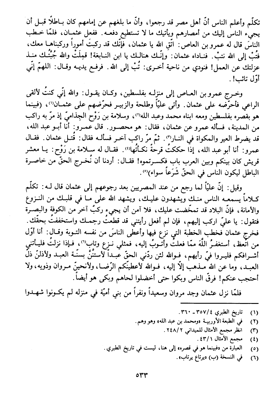تَكَلَّمْ وَأَعْلِمِ النَّاسَ أَنَّ أَهْلَ مِصْرَ قَدْ رَجَعُوا، وَأَنَّ مَا بَلَغَهُمْ عَنْ إِمَامِهِمْ كَانَ بَاطِلًا قَبْلَ أَنْ يَجِيءَ النَّاسُ إِلَيْكَ مِنْ أَمْصَارِهِمْ وَيَأْتِيَكَ مَا لَا تَسْتَطِيعُ دَفْعَهُ. فَفَعَلَ عُثْمَانُ، فَلَمَّا خَطَبَ النَّاسَ قَالَ لَهُ عَمْرُو بْنُ الْعَاصِ: اتَّقِ اللَّهَ يَا عُثْمَانُ، فَإِنَّكَ قَدْ رَكِبْتَ أُمُورًا وَرَكِبْنَاهَا مَعَكَ، فَتُبْ إِلَى اللَّهِ نَتُبْ. فَنَادَاهُ عُثْمَانُ: وَإِنَّكَ هُنَالِكَ يَا ابْنَ النَّابِغَةِ! قَمِلَتْ وَاللَّهِ جُبَّتُكَ مُنْذُ عَزَلْتُكَ عَنِ الْعَمَلِ! فَنُودِيَ مِنْ نَاحِيَةٍ أُخْرَى: تُبْ إِلَى اللَّهِ. فَرَفَعَ يَدَيْهِ وَقَالَ: اللَّهُمَّ إِنِّي أَوَّلُ تَائِبٍ!