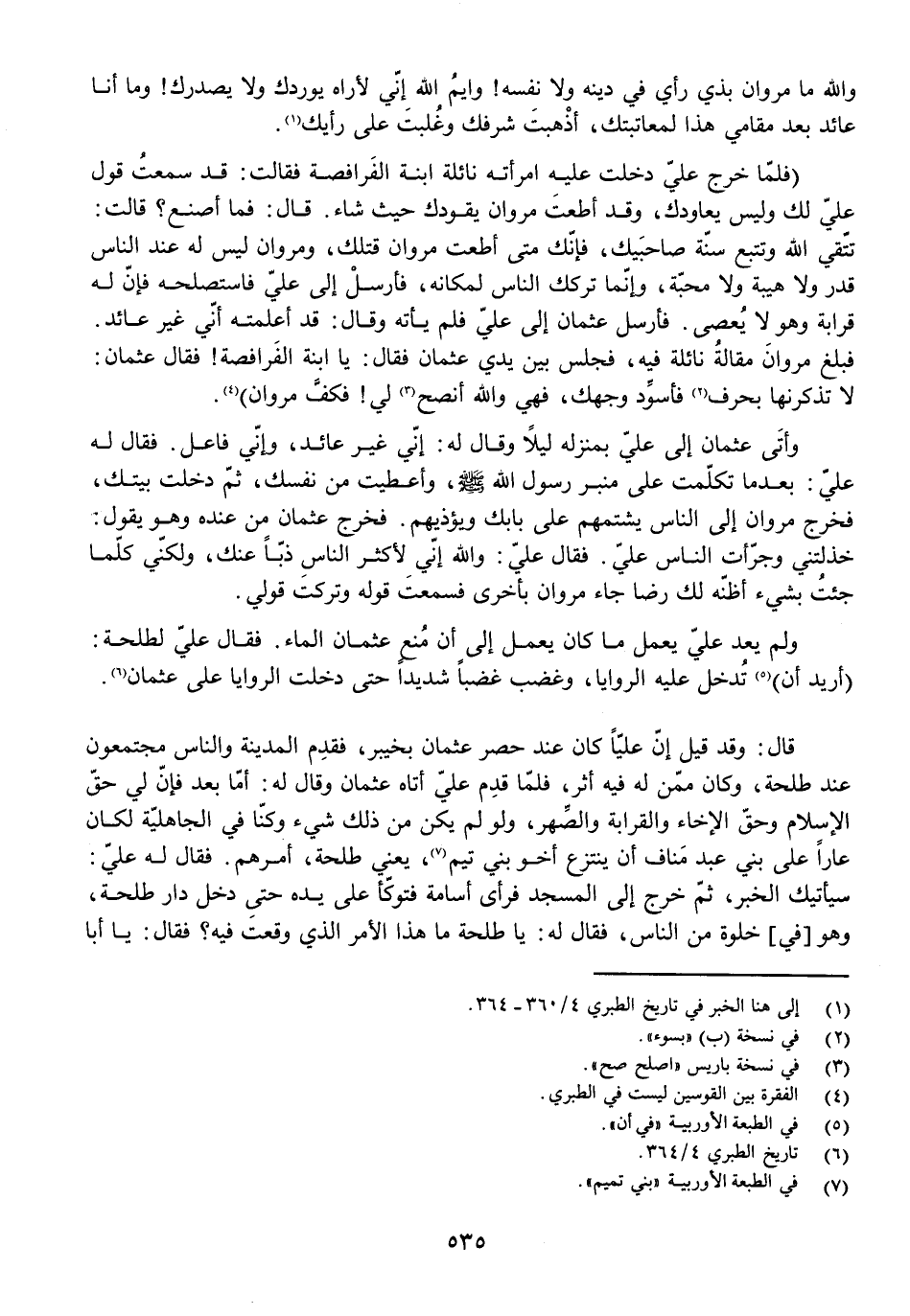 (فَلَمَّا خَرَجَ عَلِيٌّ دَخَلَتْ عَلَيْهِ امْرَأَتُهُ نَائِلَةُ ابْنَةُ الْفَرَافِصَةِ فَقَالَتْ: قَدْ سَمِعْتُ قَوْلَ عَلِيٍّ وَلَيْسَ يُعَاوِدُكَ، وَقَدْ أَطَعْتَ مَرْوَانَ يَقُودُكَ حَيْثُ شَاءَ. قَالَ: فَمَا أَصْنَعُ؟ قَالَتْ: تَتَّقِي اللَّهَ وَتَتَّبِعُ سُنَّةَ صَاحِبَيْكَ، فَإِنَّكَ مَتَى أَطَعْتَ مَرْوَانَ قَتَلَكَ، وَمَرْوَانُ لَيْسَ لَهُ عِنْدَ النَّاسِ قَدْرٌ وَلَا هَيْبَةٌ وَلَا مَحَبَّةٌ، وَإِنَّمَا تَرَكَكَ النَّاسُ لِمَكَانِهِ، فَأَرْسِلْ إِلَى عَلِيٍّ فَاسْتَصْلِحْهُ فَإِنَّ لَهُ قَرَابَةً وَهُوَ لَا يُعْصَى. فَأَرْسَلَ عُثْمَانُ إِلَى عَلِيٍّ فَلَمْ يَأْتِهِ وَقَالَ: قَدْ أَعْلَمْتُهُ أَنِّي غَيْرُ عَائِدٍ. فَبَلَغَ مَرْوَانَ مَقَالَةُ نَائِلَةَ فِيهِ، فَجَلَسَ بَيْنَ يَدَيْ عُثْمَانَ فَقَالَ: يَا ابْنَةَ الْفَرَافِصَةِ! فَقَالَ عُثْمَانُ: لَا تَذْكُرَنَّهَا بِحَرْفٍ فَأُسَوِّدَ وَجْهَكَ، فَهِيَ وَاللَّهِ أَنْصَحُ لِي! فَكَفَّ مَرْوَانُ) .