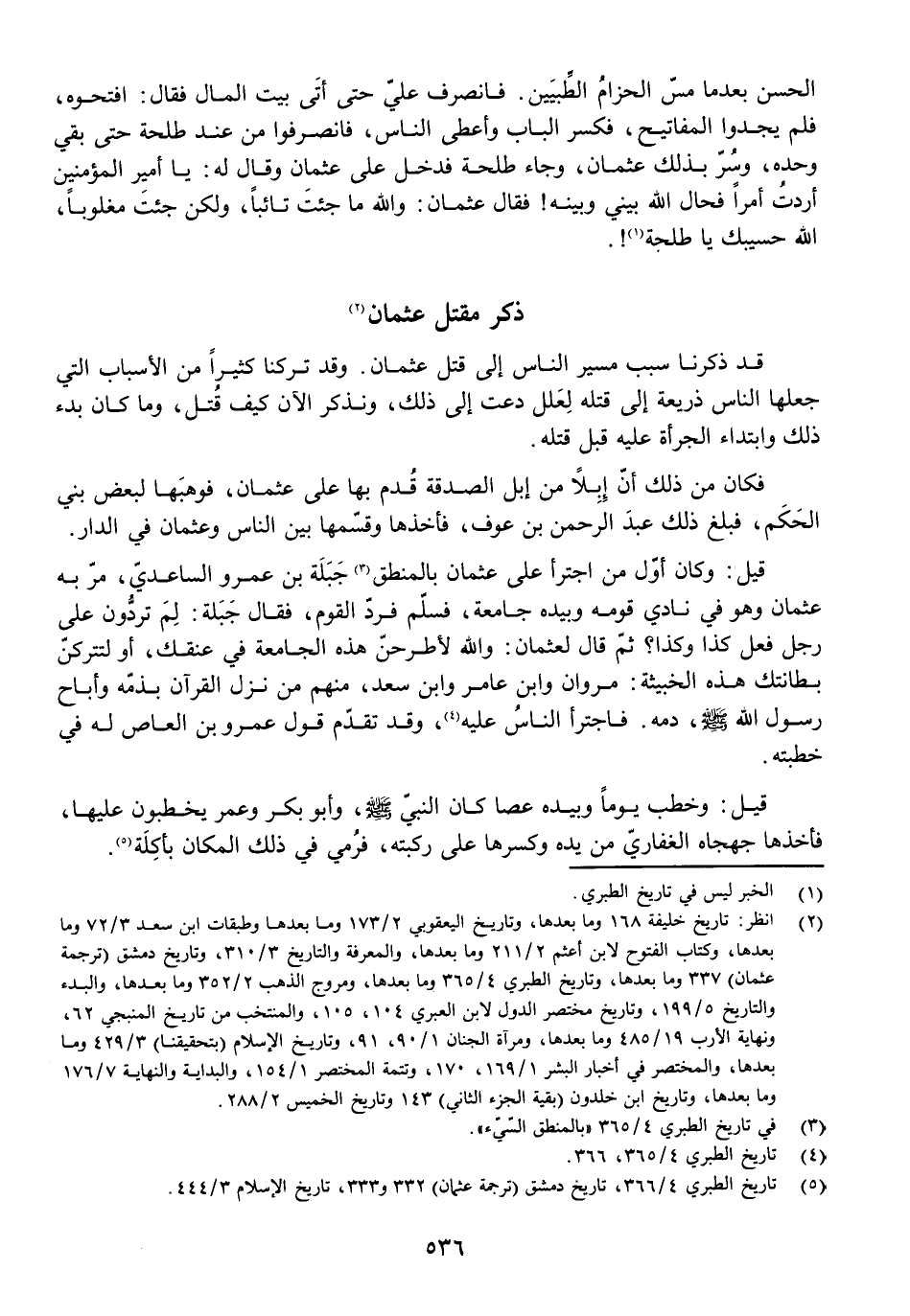 الْحَسَنِ بَعْدَمَا مَسَّ الْحِزَامُ الطِّبْيَيْنِ. فَانْصَرَفَ عَلِيٌّ حَتَّى أَتَى بَيْتَ الْمَالِ فَقَالَ: افْتَحُوهُ، فَلَمْ يَجِدُوا الْمَفَاتِيحَ، فَكَسَرَ الْبَابَ وَأَعْطَى النَّاسَ، فَانْصَرَفُوا مِنْ عِنْدِ طَلْحَةَ حَتَّى بَقِيَ وَحْدَهُ، وَسُرَّ بِذَلِكَ عُثْمَانُ، وَجَاءَ طَلْحَةُ فَدَخَلَ عَلَى عُثْمَانَ وَقَالَ لَهُ: يَا أَمِيرَ الْمُؤْمِنِينَ أَرَدْتُ أَمْرًا فَحَالَ اللَّهُ بَيْنِي وَبَيْنَهُ! فَقَالَ عُثْمَانُ: وَاللَّهِ مَا جِئْتَ تَائِبًا، وَلَكِنْ جِئْتَ مَغْلُوبًا، اللَّهُ حَسِيبُكَ يَا طَلْحَةُ!