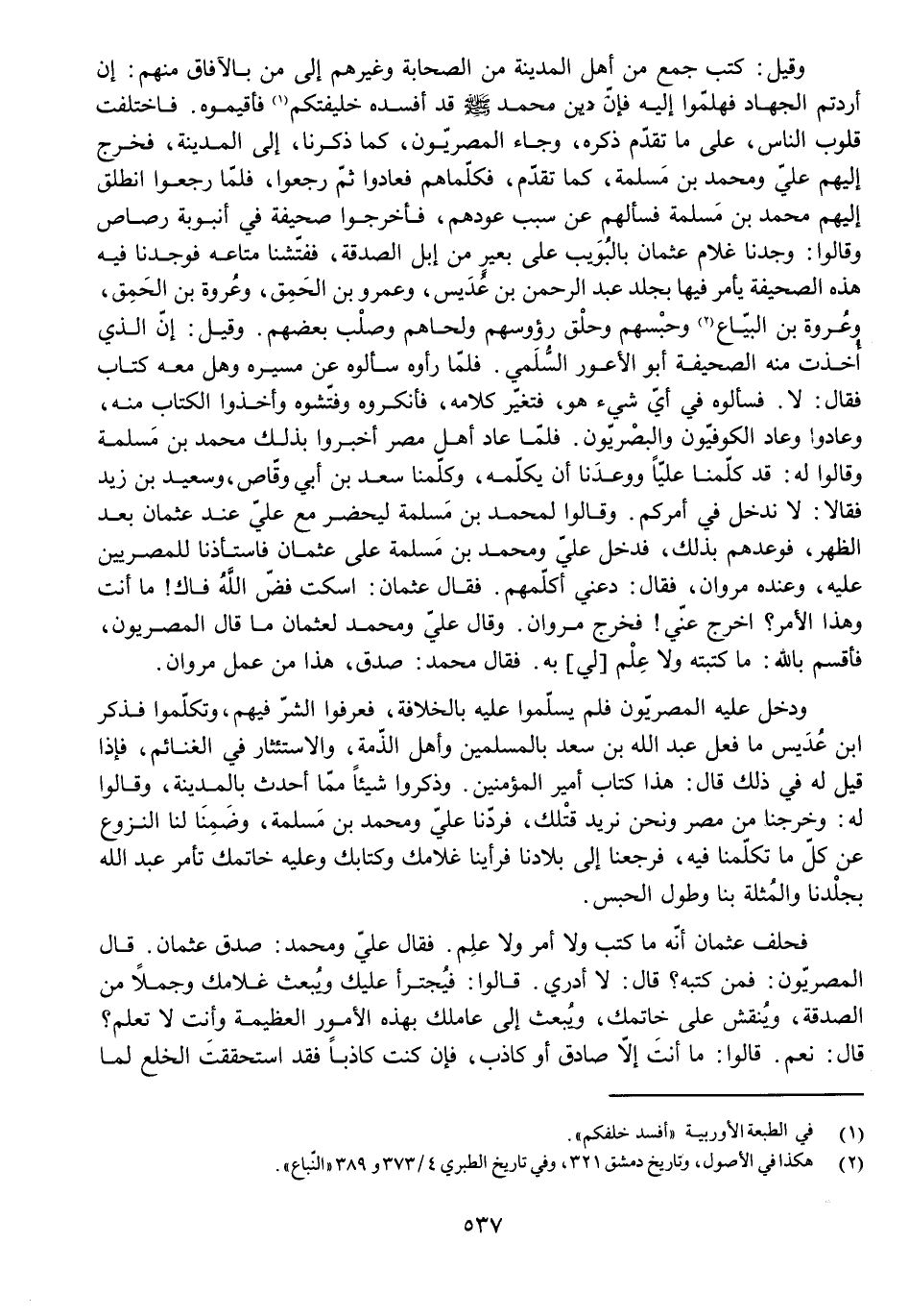 فَحَلَفَ عُثْمَانُ أَنَّهُ مَا كَتَبَ وَلَا أَمَرَ وَلَا عَلِمَ. فَقَالَ عَلِيٌّ وَمُحَمَّدٌ: صَدَقَ عُثْمَانُ. قَالَ الْمِصْرِيُّونَ: فَمَنْ كَتَبَهُ؟ قَالَ: لَا أَدْرِي. قَالُوا: فَيَجْتَرِأُ عَلَيْكَ وَيَبْعَثُ غُلَامَكَ وَجَمَلًا مِنَ الصَّدَقَةِ، وَيَنْقُشُ عَلَى خَاتَمِكَ، وَيَبْعَثُ إِلَى عَامِلِكَ بِهَذِهِ الْأُمُورِ الْعَظِيمَةِ وَأَنْتَ لَا تَعْلَمُ؟ قَالَ: نَعَمْ. قَالُوا: مَا أَنْتَ إِلَّا صَادِقٌ أَوْ كَاذِبٌ، فَإِنْ كُنْتَ كَاذِبًا فَقَدِ اسْتَحْقَقْتَ الْخَلْعَ لِمَا