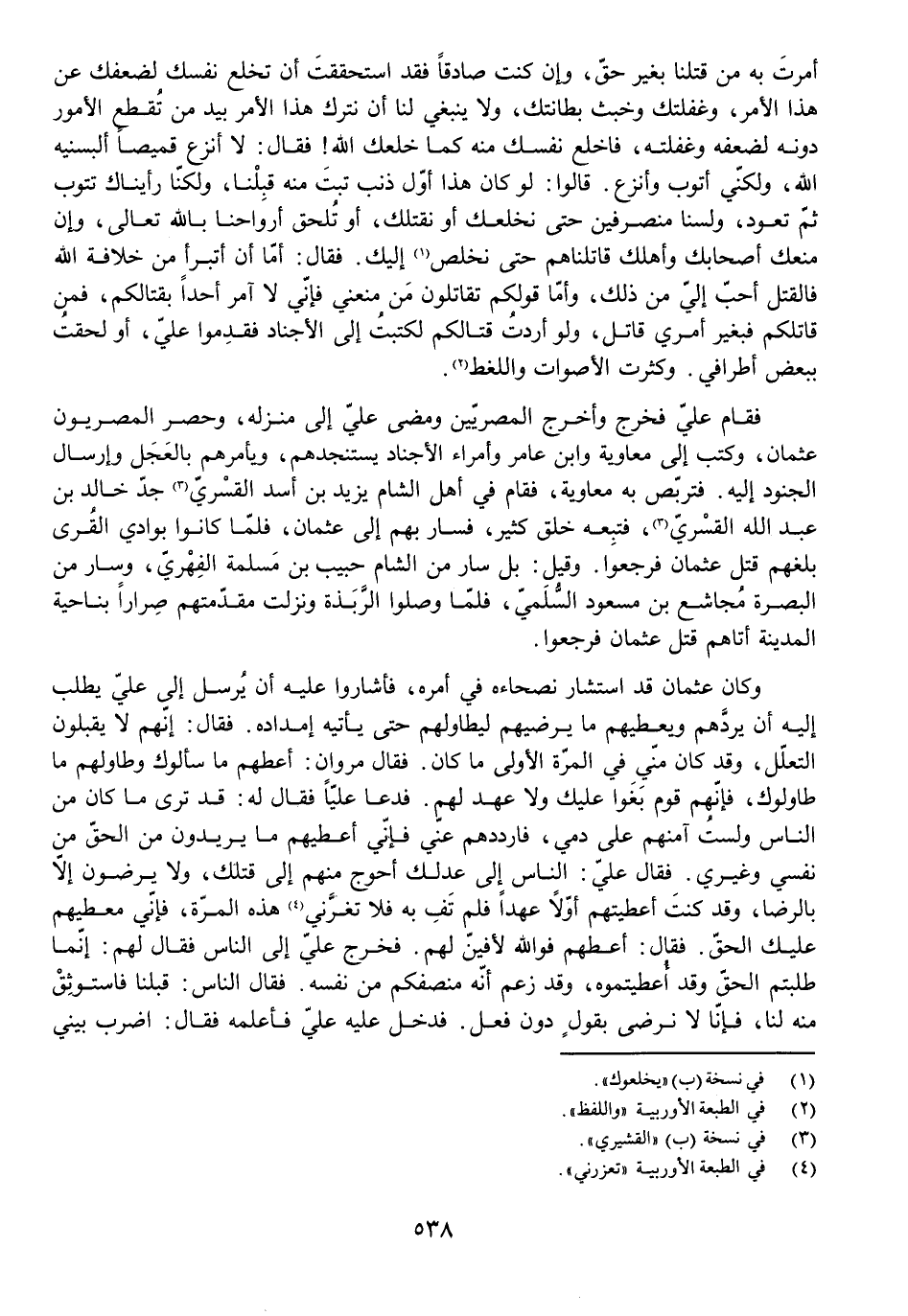 أَمَرْتَ بِهِ مَنْ قَتْلِنَا بِغَيْرِ حَقٍّ، وَإِنْ كُنْتَ صَادِقًا فَقَدِ اسْتَحْقَقْتَ أَنْ تَخْلَعَ نَفْسَكَ لِضَعْفِكَ عَنْ هَذَا الْأَمْرِ، وَغَفْلَتِكَ وَخُبْثِ بِطَانَتِكَ، وَلَا يَنْبَغِي لَنَا أَنْ نَتْرُكَ هَذَا الْأَمْرَ بِيَدِ مَنْ تُقْطَعُ الْأُمُورُ دُونَهُ لِضَعْفِهِ وَغَفْلَتِهِ، فَاخْلَعْ نَفْسَكَ مِنْهُ كَمَا خَلَعَكَ اللَّهُ! فَقَالَ: لَا أَنْزِعُ قَمِيصًا أَلْبَسَنِيهِ اللَّهُ، وَلَكِنِّي أَتُوبُ وَأَنْزِعُ. قَالُوا: لَوْ كَانَ هَذَا أَوَّلَ ذَنْبٍ تُبْتَ مِنْهُ قَبِلْنَا، وَلَكِنَّا رَأَيْنَاكَ تَتُوبُ ثُمَّ تَعُودُ، وَلَسْنَا مُنْصَرِفِينَ حَتَّى نَخْلَعَكَ أَوْ نَقْتُلَكَ أَوْ تَلْحَقَ أَرْوَاحُنَا بِاللَّهِ تَعَالَى، وَإِنْ مَنَعَكَ أَصْحَابُكَ وَأَهْلُكَ قَاتَلْنَاهُمْ حَتَّى نَخْلُصَ إِلَيْكَ. فَقَالَ: أَمَّا أَنْ أَتَبَرَّأَ مِنْ خِلَافَةِ اللَّهِ فَالْقَتْلُ أَحَبُّ إِلَيَّ مِنْ ذَلِكَ، وَأَمَّا قَوْلُكُمْ تُقَاتِلُونَ مَنْ مَنَعَنِي فَإِنِّي لَا آمُرُ أَحَدًا بِقِتَالِكُمْ، فَمَنْ قَاتَلَكُمْ فَبِغَيْرِ أَمْرِي قَاتَلَ، وَلَوْ أَرَدْتُ قِتَالَكُمْ لَكَتَبْتُ إِلَى الْأَجْنَادِ فَقَدِمُوا عَلَيَّ أَوْ لَحِقْتُ بِبَعْضِ أَطْرَافِي. وَكَثُرَتِ الْأَصْوَاتُ وَاللَّغَطُ.