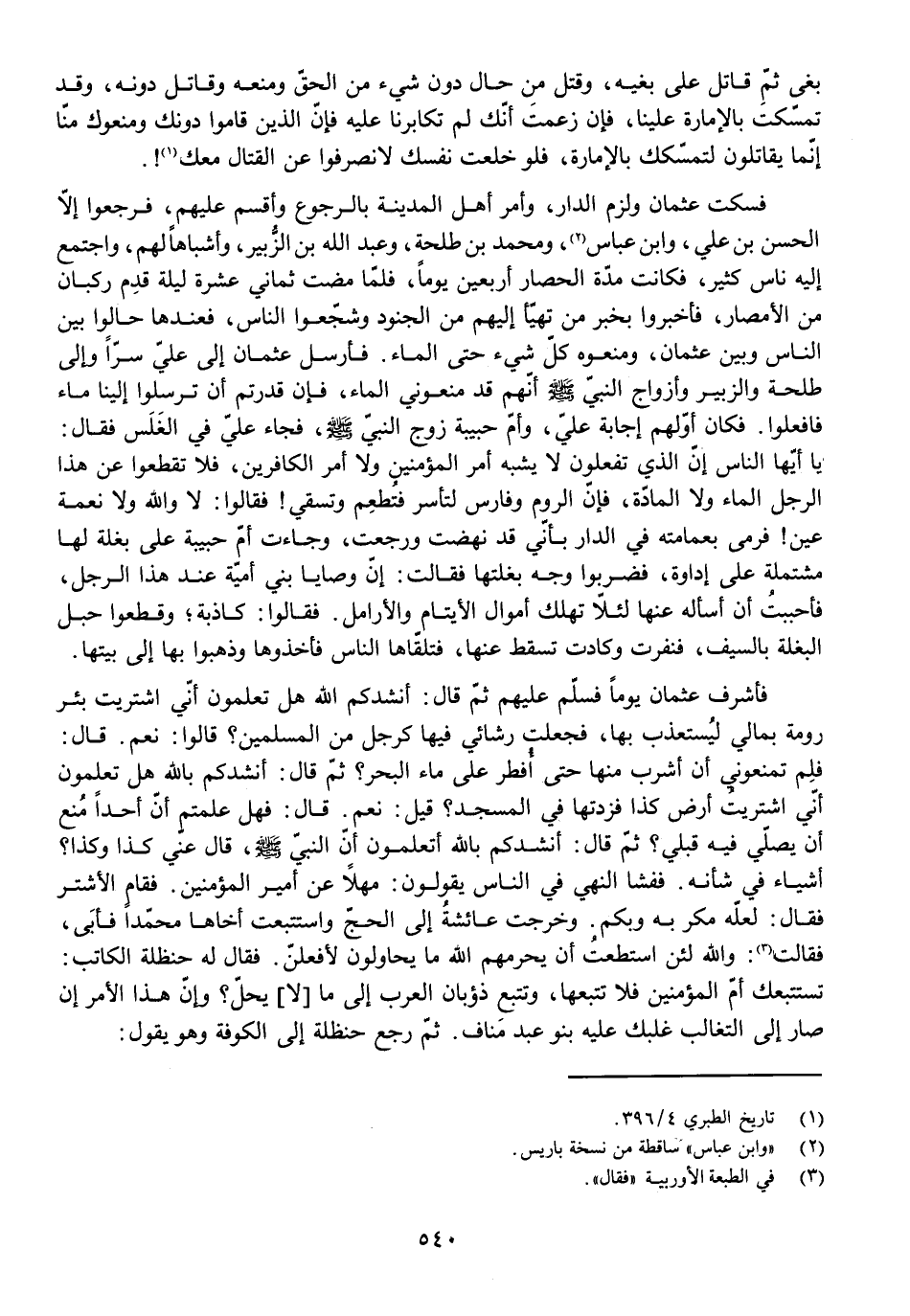 فَسَكَتَ عُثْمَانُ وَلَزِمَ الدَّارَ، وَأَمَرَ أَهْلَ الْمَدِينَةِ بِالرُّجُوعِ وَأَقْسَمَ عَلَيْهِمْ، فَرَجَعُوا إِلَّا الْحَسَنَ بْنَ عَلِيٍّ، وَابْنَ عَبَّاسٍ، وَمُحَمَّدَ بْنَ طَلْحَةَ، وَعَبْدَ اللَّهِ بْنَ الزُّبَيْرِ، وَأَشْبَاهًا لَهُمْ، وَاجْتَمَعَ إِلَيْهِ نَاسٌ كَثِيرٌ، فَكَانَتْ مُدَّةُ الْحِصَارِ أَرْبَعِينَ يَوْمًا، فَلَمَّا مَضَتْ ثَمَانِيَ عَشْرَةَ لَيْلَةً قَدِمَ رُكْبَانٌ مِنَ الْأَمْصَارِ، فَأَخْبَرُوا بِخَبَرِ مَنْ تَهَيَّأَ إِلَيْهِمْ مِنَ الْجُنُودِ وَشَجَّعُوا النَّاسَ، فَعِنْدَهَا حَالُوا بَيْنَ النَّاسِ وَبَيْنَ عُثْمَانَ، وَمَنَعُوهُ كُلَّ شَيْءٍ حَتَّى الْمَاءَ. فَأَرْسَلَ عُثْمَانُ إِلَى عَلِيٍّ سِرًّا وَإِلَى طَلْحَةَ وَالزُّبَيْرِ وَأَزْوَاجِ النَّبِيِّ - صَلَّى اللَّهُ عَلَيْهِ وَسَلَّمَ -: أَنَّهُمْ قَدْ مَنَعُونِي الْمَاءَ، فَإِنْ قَدَرْتُمْ أَنْ تُرْسِلُوا إِلَيْنَا مَاءً فَافْعَلُوا. فَكَانَ أَوَّلَهُمْ إِجَابَةً عَلِيٌّ، وَأُمُّ حَبِيبَةَ زَوْجُ النَّبِيِّ - صَلَّى اللَّهُ عَلَيْهِ وَسَلَّمَ -، فَجَاءَ عَلِيٌّ فِي الْغَلَسِ فَقَالَ: يَا أَيُّهَا النَّاسُ إِنَّ الَّذِي تَفْعَلُونَ لَا يُشْبِهُ أَمْرَ الْمُؤْمِنِينَ وَلَا أَمْرَ الْكَافِرِينَ، فَلَا تَقْطَعُوا عَنْ هَذَا الرَّجُلِ الْمَاءَ وَلَا الْمَادَّةَ، فَإِنَّ الرُّومَ وَفَارِسَ لَتَأْسِرُ فَتُطْعِمُ وَتَسْقِي! فَقَالُوا: لَا وَاللَّهِ وَلَا نُعْمَةَ عَيْنٍ! فَرَمَى بِعِمَامَتِهِ فِي الدَّارِ بِأَنِّي قَدْ نَهَضْتُ وَرَجَعْتُ، وَجَاءَتْ أُمُّ حَبِيبَةَ عَلَى بَغْلَةٍ لَهَا مُشْتَمِلَةً عَلَى إِدَاوَةٍ، فَضَرَبُوا وَجْهَ بَغْلَتِهَا فَقَالَتْ: إِنَّ وَصَايَا بَنِي أُمَيَّةَ عِنْدَ هَذَا الرَّجُلِ، فَأَحْبَبْتُ أَنْ أَسْأَلَهُ عَنْهَا لِئَلَّا تَهْلِكَ أَمْوَالُ الْأَيْتَامِ وَالْأَرَامِلِ. فَقَالُوا: كَاذِبَةٌ، وَقَطَعُوا حَبْلَ الْبَغْلَةِ بِالسَّيْفِ، فَنَفَرَتْ وَكَادَتْ تَسْقُطُ عَنْهَا، فَتَلَقَّاهَا النَّاسُ فَأَخَذُوهَا وَذَهَبُوا بِهَا إِلَى بَيْتِهَا.