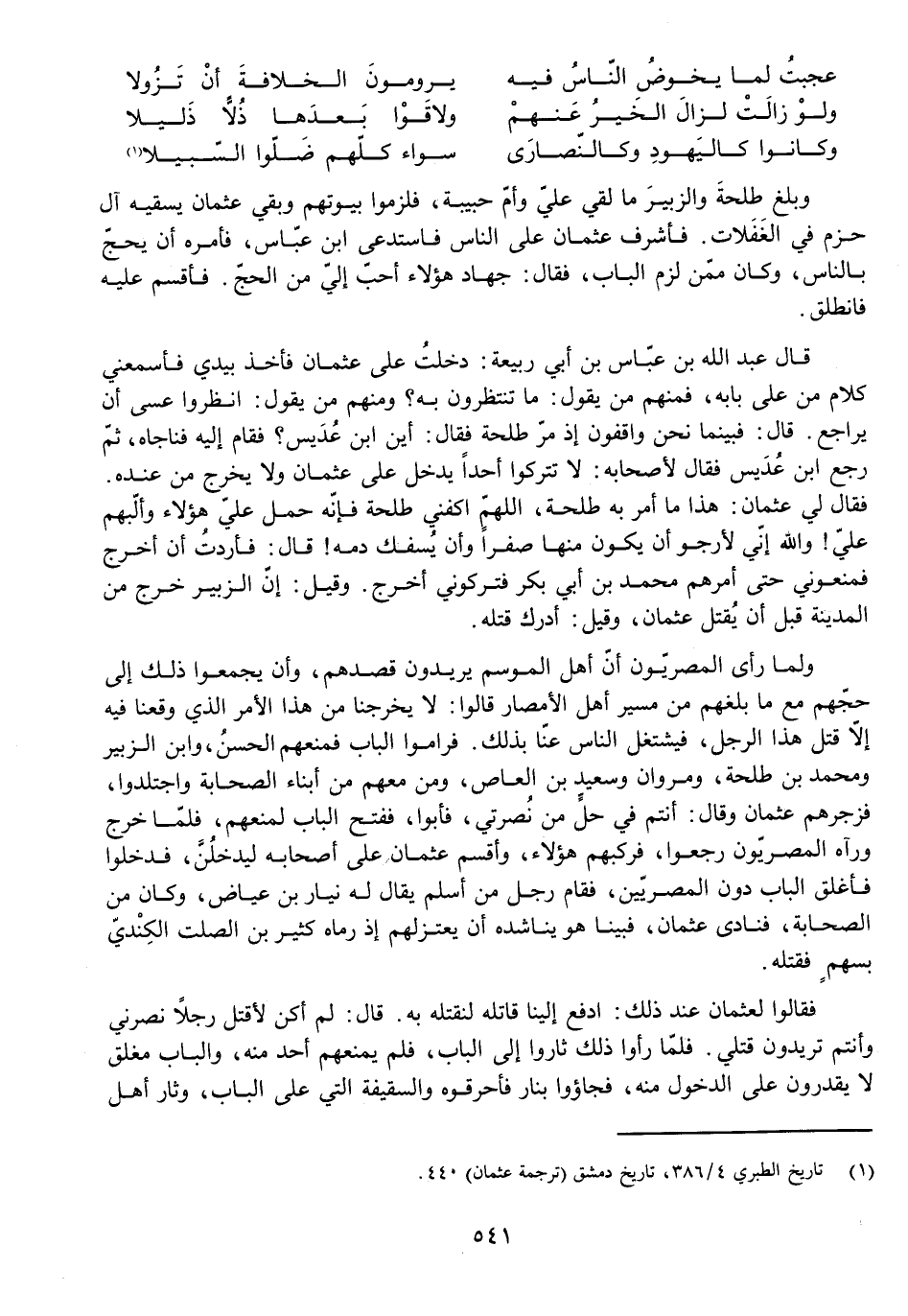 قَالَ عَبْدُ اللَّهِ بْنُ عَبَّاسِ بْنِ أَبِي رَبِيعَةَ: دَخَلْتُ عَلَى عُثْمَانَ فَأَخَذَ بِيَدِي فَأَسْمَعَنِي كَلَامَ مَنْ عَلَى بَابِهِ، فَمِنْهُمْ مَنْ يَقُولُ: مَا تَنْتَظِرُونَ بِهِ؟ وَمِنْهُمْ مَنْ يَقُولُ: انْظُرُوا عَسَى أَنْ يُرَاجِعَ. قَالَ: فَبَيْنَمَا نَحْنُ وَاقِفُونَ إِذْ مَرَّ طَلْحَةُ فَقَالَ: أَيْنَ ابْنُ عُدَيْسٍ؟ فَقَامَ إِلَيْهِ فَنَاجَاهُ، ثُمَّ رَجَعَ ابْنُ عُدَيْسٍ فَقَالَ لِأَصْحَابِهِ: لَا تَتْرُكُوا أَحَدًا يَدْخُلُ عَلَى عُثْمَانَ وَلَا يَخْرُجُ مِنْ عِنْدِهِ. فَقَالَ لِي عُثْمَانُ: هَذَا مَا أَمَرَ بِهِ طَلْحَةُ، اللَّهُمَّ اكْفِنِي طَلْحَةَ فَإِنَّهُ حَمَلَ عَلَيَّ هَؤُلَاءِ وَأَلَّبَهُمْ عَلَيَّ! وَاللَّهِ إِنِّي لَأَرْجُو أَنْ يَكُونَ مِنْهَا صِفْرًا وَأَنْ يُسْفَكَ دَمُهُ! قَالَ: فَأَرَدْتُ أَنْ أَخْرُجَ فَمَنَعُونِي حَتَّى أَمَرَهُمْ مُحَمَّدُ بْنُ أَبِي بَكْرٍ فَتَرَكُونِي أَخْرُجُ. وَقِيلَ: إِنَّ الزُّبَيْرَ خَرَجَ مِنَ الْمَدِينَةِ قَبْلَ أَنْ يُقْتَلَ عُثْمَانُ، وَقِيلَ: أَدْرَكَ قَتْلَهُ.