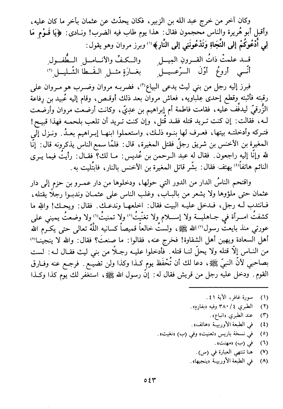 وَاقْتَحَمَ النَّاسُ الدَّارَ مِنَ الدُّورِ الَّتِي حَوْلَهَا، وَدَخَلُوهَا مِنْ دَارِ عَمْرِو بْنِ حَزْمٍ إِلَى دَارِ عُثْمَانَ حَتَّى مَلَؤُهَا وَلَا يَشْعُرُ مَنْ بِالْبَابِ، وَغَلَبَ النَّاسُ عَلَى عُثْمَانَ وَنَدَبُوا رَجُلًا يَقْتُلُهُ، فَانْتُدِبَ لَهُ رَجُلٌ، فَدَخَلَ عَلَيْهِ الْبَيْتَ فَقَالَ: اخْلَعْهَا وَنَدَعَكَ. فَقَالَ: وَيْحَكَ! وَاللَّهِ مَا كَشَفْتُ امْرَأَةً فِي جَاهِلِيَّةٍ وَلَا إِسْلَامٍ وَلَا تَغَنَّيْتُ وَلَا تَمَنَّيْتُ وَلَا وَضَعْتُ يَمِينِي عَلَى عَوْرَتِي مُنْذُ بَايَعْتُ رَسُولَ اللَّهِ - صَلَّى اللَّهُ عَلَيْهِ وَسَلَّمَ - وَلَسْتُ خَالِعًا قَمِيصًا كَسَانِيهِ اللَّهُ تَعَالَى حَتَّى يُكْرِمَ اللَّهُ أَهْلَ السَّعَادَةِ وَيُهِينَ أَهْلَ الشَّقَاوَةِ! فَخَرَجَ عَنْهُ، فَقَالُوا: مَا صَنَعْتَ؟ فَقَالَ: وَاللَّهِ لَا يُنْجِينَا مِنَ النَّاسِ إِلَّا قَتْلُهُ وَلَا يَحِلُّ لَنَا قَتْلُهُ. فَأَدْخَلُوا عَلَيْهِ رَجُلًا مِنْ بَنِي لَيْثٍ فَقَالَ لَهُ: لَسْتَ بِصَاحِبِي لِأَنَّ النَّبِيَّ - صَلَّى اللَّهُ عَلَيْهِ وَسَلَّمَ - دَعَا لَكَ أَنْ تُحْفَظَ يَوْمَ كَذَا وَكَذَا وَلَنْ تَضِيعَ. فَرَجَعَ عَنْهُ وَفَارَقَ الْقَوْمَ. وَدَخَلَ عَلَيْهِ رَجُلٌ مِنْ قُرَيْشٍ فَقَالَ لَهُ: إِنَّ رَسُولَ اللَّهِ - صَلَّى اللَّهُ عَلَيْهِ وَسَلَّمَ - اسْتَغْفَرَ لَكَ يَوْمَ كَذَا وَكَذَا