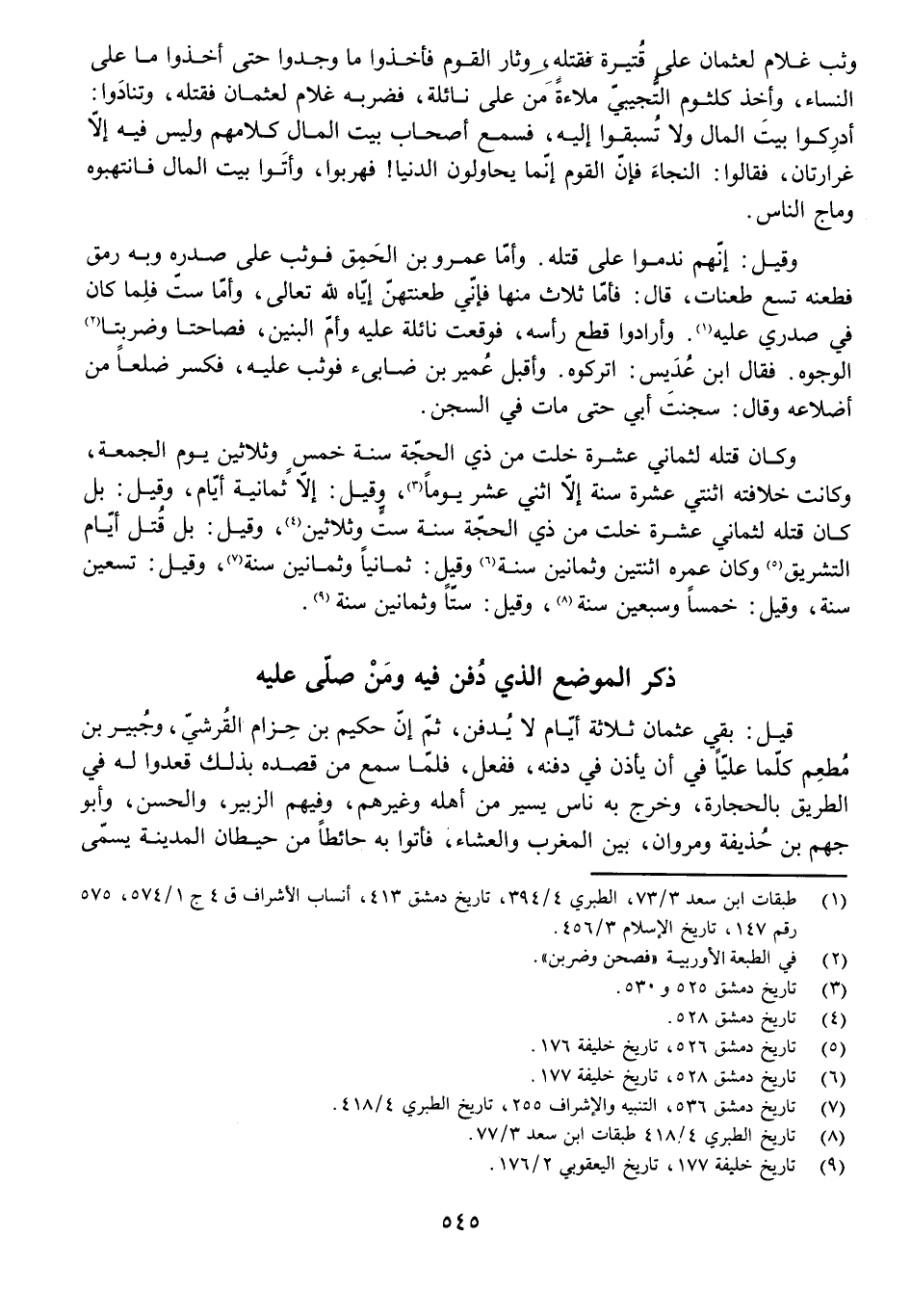 وَقِيلَ إِنَّهُمْ نَدِمُوا عَلَى قَتْلِهِ. وَأَمَّا عَمْرُو بْنُ الْحَمِقِ فَوَثَبَ عَلَى صَدْرِهِ وَبِهِ رَمَقٌ فَطَعَنَهُ تِسْعَ طَعَنَاتٍ، قَالَ: فَأَمَّا ثَلَاثٌ مِنْهَا فَإِنِّي طَعَنْتُهُنَّ إِيَّاهُ لِلَّهِ - تَعَالَى - وَأَمَّا سِتٌّ فَلِمَا كَانَ فِي صَدْرِي عَلَيْهِ. وَأَرَادُوا قَطْعَ رَأْسِهِ فَوَقَعَتْ نَائِلَةُ عَلَيْهِ وَأُمُّ الْبَنِينَ، فَصَاحَتَا وَضَرَبَتَا الْوُجُوهَ. فَقَالَ ابْنُ عُدَيْسٍ: اتْرُكُوهُ. وَأَقْبَلَ عُمَيْرُ بْنُ ضَابِئٍ فَوَثَبَ عَلَيْهِ، فَكَسَرَ ضِلَعًا مِنْ أَضْلَاعِهِ وَقَالَ: سَجَنْتَ أَبِي حَتَّى مَاتَ فِي السِّجْنِ.