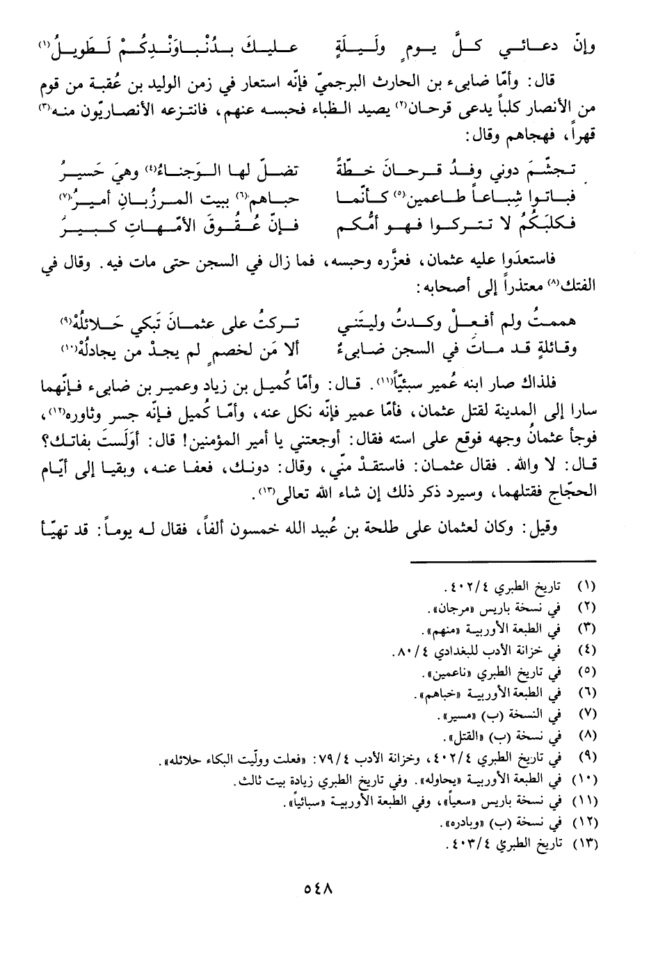 هَمَمْتُ وَلَمْ أَفْعَلْ وَكِدْتُ وَلَيْتَنِي ... تَرَكْتُ عَلَى عُثْمَانَ تَبْكِي حَلَائِلُهْ
