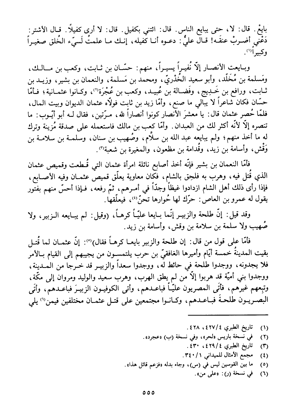 وَبَايَعَتِ الْأَنْصَارُ إِلَّا نُفَيْرًا يَسِيرًا، مِنْهُمْ: حَسَّانُ بْنُ ثَابِتٍ، وَكَعْبُ بْنُ مَالِكٍ، وَمَسْلَمَةُ بْنُ مُخَلَّدٍ، وَأَبُو سَعِيدٍ الْخُدْرِيُّ، وَمُحَمَّدُ بْنُ مَسْلَمَةَ، وَالنُّعْمَانُ بْنُ بَشِيرٍ، وَزَيْدُ بْنُ ثَابِتٍ، وَرَافِعُ بْنُ خَدِيجٍ، وَفَضَالَةُ بْنُ عُبَيْدٍ، وَكَعْبُ بْنُ عُجْرَةَ، وَكَانُوا عُثْمَانِيَّةً، فَأَمَّا حَسَّانُ فَكَانَ شَاعِرًا لَا يُبَالِي مَا يَصْنَعُ، وَأَمَّا زَيْدُ بْنُ ثَابِتٍ فَوَلَّاهُ عُثْمَانُ الدِّيوَانَ وَبَيْتَ الْمَالِ، فَلَمَّا حُصِرَ عُثْمَانُ قَالَ: يَا مَعْشَرَ الْأَنْصَارِ كُونُوا أَنْصَارًا لِلَّهِ، مَرَّتَيْنِ، فَقَالَ لَهُ أَبُو أَيُّوبَ: مَا تَنْصُرُهُ إِلَّا لِأَنَّهُ أَكْثَرَ لَكَ مِنَ الْعُبْدَانِ. وَأَمَّا كَعْبُ بْنُ مَالِكٍ فَاسْتَعْمَلَهُ عَلَى صَدَقَةِ مُزَيْنَةَ وَتَرَكَ لَهُ مَا أَخَذَ مِنْهُمْ، وَلَمْ يُبَايِعْهُ عَبْدُ اللَّهِ بْنُ سَلَامٍ، وَصُهَيْبُ بْنُ سِنَانٍ، وَسَلَمَةُ بْنُ سَلَامَةَ بْنِ وَقْشٍ، وَأُسَامَةُ بْنُ زَيْدٍ، وَقُدَامَةُ بْنُ مَظْعُونٍ، وَالْمُغِيرَةُ بْنُ شُعْبَةَ.