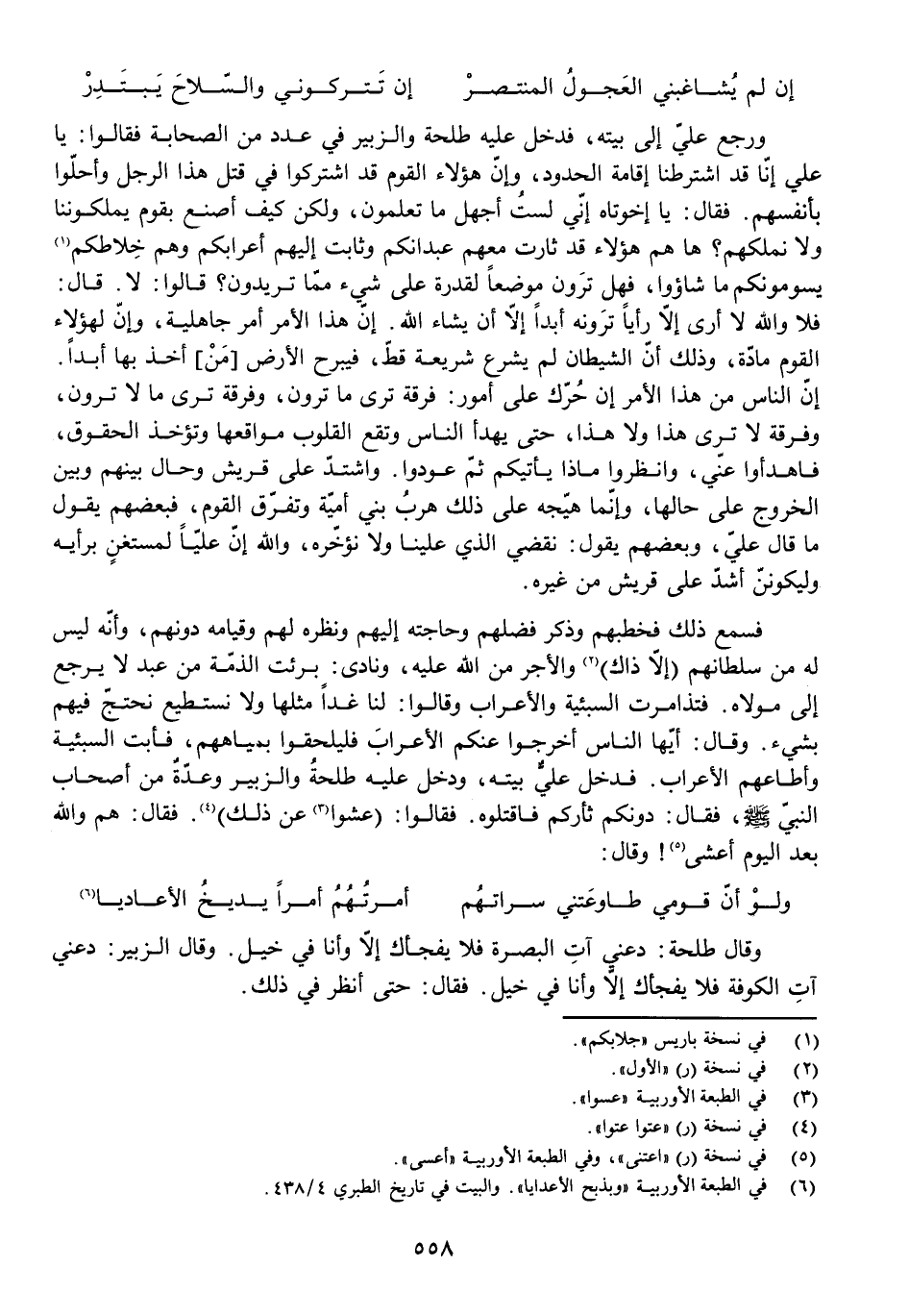 فَسَمِعَ ذَلِكَ فَخَطَبَهُمْ وَذَكَرُ فَضْلَهُمْ وَحَاجَتَهُ إِلَيْهِمْ وَنَظَرَهُ لَهُمْ وَقِيَامَهُ دُونَهُمْ، وَأَنَّهُ لَيْسَ لَهُ مِنْ سُلْطَانِهِمْ (إِلَّا ذَاكَ) وَالْأَجْرُ مِنَ اللَّهِ عَلَيْهِ، وَنَادَى: بَرِئَتِ الذِّمَّةُ مِنْ عَبْدٍ لَا يَرْجِعُ إِلَى مَوْلَاهُ. فَتَذَامَرَتِ السَّبِيئَةُ وَالْأَعْرَابُ وَقَالُوا: لَنَا غَدًا مِثْلُهَا وَلَا نَسْتَطِيعُ نَحْتَجُّ فِيهِمْ بِشَيْءٍ. وَقَالَ: أَيُّهَا النَّاسُ أَخْرِجُوا عَنْكُمُ الْأَعْرَابَ فَلْيَلْحَقُوا بِمِيَاهِهِمْ، فَأَبَتِ السَّبِيئَةُ وَأَطَاعَهُمُ الْأَعْرَابُ. فَدَخَلَ عَلِيٌّ بَيْتَهُ، وَدَخَلَ عَلَيْهِ طَلْحَةُ وَالزُّبَيْرُ وَعِدَّةٌ مِنْ أَصْحَابِ النَّبِيِّ - صَلَّى اللَّهُ عَلَيْهِ وَسَلَّمَ - فَقَالَ: دُونَكُمْ ثَأْرَكُمْ فَاقْتُلُوهُ. فَقَالَ: (عَشَوْا عَنْ ذَلِكَ) . فَقَالَ: هُمْ وَاللَّهِ بَعْدَ الْيَوْمِ أَعْشَى! وَقَالَ:
