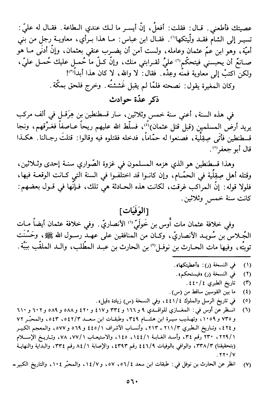 وَفِي خِلَافَةِ عُثْمَانَ مَاتَ أَوْسُ بْنُ خَوْلِيٍّ الْأَنْصَارِيُّ. وَفِي خِلَافَةِ عُثْمَانَ أَيْضًا مَاتَ الْجُلَاسُ بْنُ سُوَيْدٍ الْأَنْصَارِيُّ، وَكَانَ مِنَ الْمُنَافِقِينَ عَلَى عَهْدِ رَسُولِ اللَّهِ - صَلَّى اللَّهُ عَلَيْهِ وَسَلَّمَ - وَحَسُنَتْ تَوْبَتُهُ، وَفِيهَا مَاتَ الْحَرْثُ بْنُ نَوْفَلِ بْنِ الْحَرْثِ بْنِ عَبْدِ الْمُطَّلِبِ، وَالِدُ الْمُلَقَّبِ بِبَبَّةَ.
