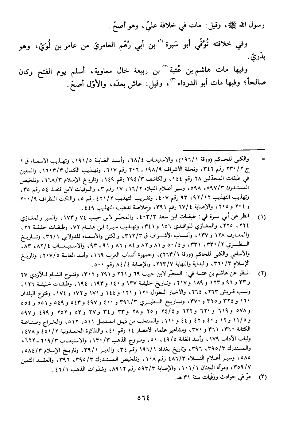 وَفِي خِلَافَتِهِ تُوَفِّي أَبُو سَبْرَةَ بْنُ أَبِي رُهْمٍ الْعَامِرِيُّ مِنْ عَامِرِ بْنِ لُؤَيٍّ - وَهُوَ بَدْرِيٌّ -