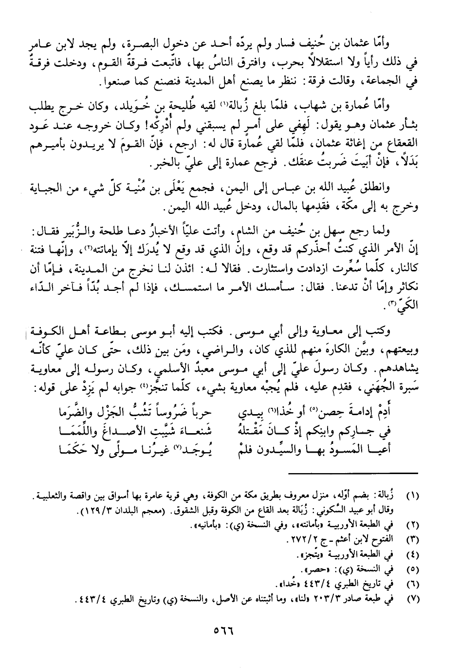 وَأَمَّا عِمَارَةُ بْنُ شِهَابٍ، فَلَمَّا بَلَغَ زُبَالَةَ لَقِيَهُ طُلَيْحَةُ بْنُ خُوَيْلِدٍ، وَكَانَ خَرَجَ يَطْلُبُ بِثَأْرِ عُثْمَانَ وَهُوَ يَقُولُ: لَهْ فِي عَلَى أَمْرٍ لَمْ يَسْبِقْنِي وَلَمْ أُدْرِكْهُ! وَكَانَ خُرُوجُهُ عِنْدَ عَوْدِ الْقَعْقَاعِ مِنْ إِغَاثَةِ عُثْمَانَ، فَلَمَّا لَقِيَ عِمَارَةَ قَالَ لَهُ: ارْجِعْ، فَإِنَّ الْقَوْمَ لَا يُرِيدُونَ بِأَمِيرِهِمْ بَدَلًا، فَإِنْ أَبَيْتَ ضُرِبَتْ عُنُقُكَ. فَرَجَعَ عِمَارَةُ إِلَى عَلِيٍّ بِالْخَبَرِ.