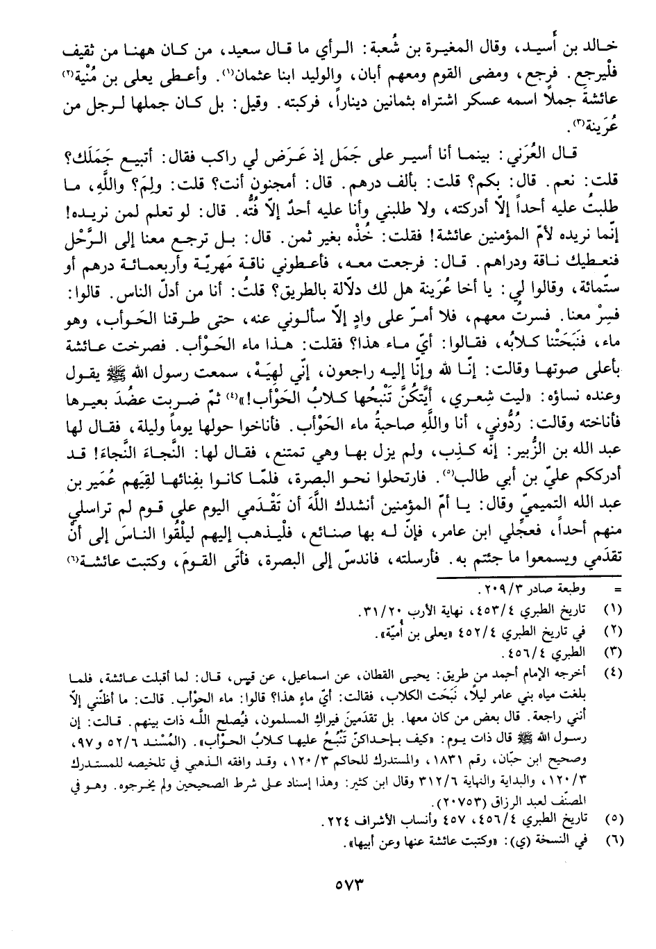 قَالَ الْعُرَنِيُّ: بَيْنَمَا أَنَا أَسِيرُ عَلَى جَمَلٍ إِذْ عَرَضَ لِي رَاكِبٌ فَقَالَ: أَتَبِيعُ جَمَلَكَ؟ قُلْتُ: نَعَمْ. قَالَ: بِكَمْ؟ قُلْتُ: بِأَلْفِ دِرْهَمٍ. قَالَ: أَمْجَنُونٌ أَنْتَ؟ قُلْتُ: وَلِمَ؟ وَاللَّهِ مَا طَلَبْتُ عَلَيْهِ أَحَدًا إِلَّا أَدْرَكْتُهُ، وَلَا طَلَبَنِي وَأَنَا عَلَيْهِ أَحَدٌ إِلَّا فُتُّهُ. قَالَ: لَوْ تَعْلَمُ لِمَنْ نُرِيدُهُ! إِنَّمَا نُرِيدُهُ لِأُمِّ الْمُؤْمِنِينَ عَائِشَةَ! فَقُلْتُ: خُذْهُ بِغَيْرِ ثَمَنٍ. قَالَ: بَلْ تَرْجِعُ مَعَنَا إِلَى الرَّحْلِ فَنُعْطِيكَ نَاقَةً وَدَرَاهِمَ. قَالَ: فَرَجَعْتُ مَعَهُ فَأَعْطَوْنِي نَاقَةً مَهْرِيَّةً وَأَرْبَعَمِائَةِ دِرْهَمٍ أَوْ سِتَّمِائَةٍ، وَقَالُوا لِي: يَا أَخَا عُرَيْنَةَ هَلْ لَكَ دِلَالَةٌ بِالطَّرِيقِ؟ قُلْتُ: أَنَا مِنْ أَدِلِّ النَّاسِ. قَالُوا: فَسِرْ مَعَنَا. فَسِرْتُ مَعَهُمْ فَلَا أَمُرُّ عَلَى وَادٍ إِلَّا سَأَلُونِي عَنْهُ، حَتَّى طَرَقْنَا الْحَوْأَبَ، وَهُوَ مَاءٌ، فَنَبَحَتْنَا كِلَابُهُ، فَقَالُوا: أَيُّ مَاءٍ هَذَا؟ فَقُلْتُ: هَذَا مَاءُ الْحَوْأَبِ. فَصَرَخَتْ عَائِشَةُ بِأَعْلَى صَوْتِهَا وَقَالَتْ: إِنَّا لِلَّهِ وَإِنَّا إِلَيْهِ رَاجِعُونَ، إِنِّي لَهِيَهْ، سَمِعْتُ رَسُولَ اللَّهِ - صَلَّى اللَّهُ عَلَيْهِ وَسَلَّمَ - «يَقُولُ وَعِنْدَهُ نِسَاؤُهُ: " لَيْتَ شِعْرِي أَيَّتُكُنَّ تَنْبَحُهَا كِلَابُ الْحَوْأَبِ "!» ثُمَّ ضَرَبَتْ عَضُدَ بَعِيرِهَا فَأَنَاخَتْهُ وَقَالَتْ: رُدُّونِي، أَنَا وَاللَّهِ صَاحِبَةُ مَاءِ الْحَوْأَبِ. فَأَنَاخُوا حَوْلَهَا يَوْمًا وَلَيْلَةً، فَقَالَ لَهَا عَبْدُ اللَّهِ بْنُ الزُّبَيْرِ: إِنَّهُ كَذِبَ، وَلَمْ يَزَلْ بِهَا وَهِيَ تَمْتَنِعُ، فَقَالَ لَهَا: النَّجَاءَ النَّجَاءَ! قَدْ أَدْرَكَكُمْ عَلِيُّ بْنُ أَبِي طَالِبٍ. فَارْتَحَلُوا نَحْوَ الْبَصْرَةِ، فَلَمَّا كَانُوا بِفِنَائِهَا لَقِيَهُمْ عُمَيْرُ بْنُ عَبْدِ اللَّهِ التَّمِيمِيُّ وَقَالَ: يَا أُمَّ الْمُؤْمِنِينَ أَنْشُدُكِ اللَّهَ أَنْ تَقْدَمِي الْيَوْمَ عَلَى قَوْمٍ لَمْ تُرَاسِلِي مِنْهُمْ أَحَدًا، فَعَجِّلِي ابْنَ عَامِرٍ، فَإِنَّ لَهُ بِهَا صَنَائِعَ، فَلْيَذْهَبْ إِلَيْهِمْ لِيَلْقَوُا النَّاسَ إِلَى أَنْ تَقْدَمِي وَيَسْمَعُوا مَا جِئْتُمْ بِهِ. فَأَرْسَلَتْهُ، فَانْدَسَّ إِلَى الْبَصْرَةِ، فَأَتَى الْقَوْمَ، وَكَتَبَتْ عَائِشَةُ