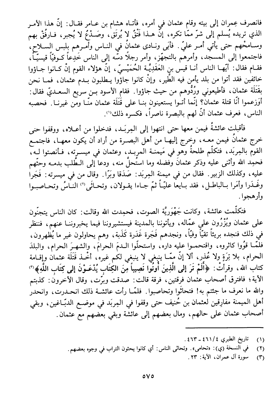 فَتَكَلَّمَتْ عَائِشَةُ، وَكَانَتْ جَهْوَرِيَّةَ الصَّوْتِ، فَحَمِدَتِ اللَّهَ وَقَالَتْ: كَانَ النَّاسُ يَتَجَنَّوْنَ عَلَى عُثْمَانَ وَيَزْرُونَ عَلَى عُمَّالِهِ، وَيَأْتُونَنَا بِالْمَدِينَةِ فَيَسْتَشِيرُونَنَا فِيمَا يُخْبِرُونَنَا عَنْهُمْ، فَنَنْظُرُ فِي ذَلِكَ فَنَجِدُهُ بَرِيئًا تَقِيًّا وَفِيًّا، وَنَجِدُهُمْ فَجَرَةً غَدَرَةً كَذَبَةً، وَهُمْ يُحَاوِلُونَ غَيْرَ مَا يُظْهِرُونَ، فَلَمَّا قَوَوْا كَاثَرُوهُ، وَاقْتَحَمُوا عَلَيْهِ دَارَهُ، وَاسْتَحَلُّوا الدَّمَ الْحَرَامَ، وَالشَّهْرَ الْحَرَامَ، وَالْبَلَدَ الْحَرَامَ، بِلَا تِرَةٍ وَلَا عُذْرٍ، أَلَا إِنَّ مِمَّا يَنْبَغِي لَا يَنْبَغِي لَكُمْ غَيْرُهُ، أَخْذُ قَتَلَةِ عُثْمَانَ وَإِقَامَةُ كِتَابِ اللَّهِ، وَقَرَأَتْ: {أَلَمْ تَرَ إِلَى الَّذِينَ أُوتُوا نَصِيبًا مِنَ الْكِتَابِ يُدْعَوْنَ إِلَى كِتَابِ اللَّهِ} [آل عمران: 23] الْآيَةَ، فَافْتَرَقَ أَصْحَابُ عُثْمَانَ فِرْقَتَيْنِ، فِرْقَةٌ قَالَتْ: صَدَقَتْ وَبَرَّتْ، وَقَالَ الْآخَرُونَ: كَذَبْتُمْ وَاللَّهِ مَا نَعْرِفُ مَا جِئْتُمْ بِهِ! فَتَحَاثَوْا وَتَحَاصَبُوا. فَلَمَّا رَأَتْ عَائِشَةُ ذَلِكَ انْحَدَرَتْ وَانْحَدَرَ أَهْلُ الْمَيْمَنَةِ مُفَارِقِينَ لِعُثْمَانَ بْنِ حُنَيْفٍ حَتَّى وَقَفُوا فِي الْمِرْبَدِ فِي مَوْضِعِ الدَّبَّاغِينَ، وَبَقِيَ أَصْحَابُ عُثْمَانَ عَلَى حَالِهِمْ، وَمَالَ بَعْضُهُمْ إِلَى عَائِشَةَ وَبَقِيَ بَعْضُهُمْ مَعَ عُثْمَانَ.