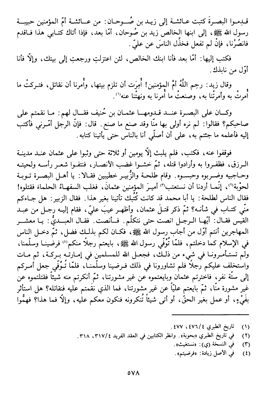 فَوَقَفُوا عَنْهُ، فَكَتَبَ، فَلَمْ يَلْبَثْ إِلَّا يَوْمَيْنِ أَوْ ثَلَاثَةً حَتَّى وَثَبُوا عَلَى عُثْمَانَ عِنْدَ مَدِينَةِ الرِّزْقِ، فَظَفِرُوا بِهِ وَأَرَادُوا قَتْلَهُ، ثُمَّ خَشُوا غَضَبَ الْأَنْصَارِ، فَنَتَفُوا شَعْرَ رَأْسِهِ وَلِحْيَتِهِ وَحَاجِبَيْهِ وَضَرَبُوهُ وَحَبَسُوهُ. وَقَامَ طَلْحَةُ وَالزُّبَيْرُ خَطِيبَيْنِ فَقَالَا: يَا أَهْلَ الْبَصْرَةِ تَوْبَةً لِحَوْبَةٍ، إِنَّمَا أَرَدْنَا أَنْ نَسْتَعْتِبَ أَمِيرَ الْمُؤْمِنِينَ عُثْمَانَ، فَغَلَبَ السُّفَهَاءُ الْحُلَمَاءَ فَقَتَلُوهُ! فَقَالَ النَّاسُ لِطَلْحَةَ: يَا أَبَا مُحَمَّدٍ قَدْ كَانَتْ كُتُبُكَ تَأْتِينَا بِغَيْرِ هَذَا. فَقَالَ الزُّبَيْرُ: هَلْ جَاءَكُمْ مِنِّي كِتَابٌ فِي شَأْنِهِ؟ ثُمَّ ذَكَرَ قَتْلَ عُثْمَانَ وَأَظْهَرَ عَيْبَ عَلِيٍّ، فَقَامَ إِلَيْهِ رَجُلٌ مِنْ عَبْدِ الْقَيْسِ فَقَالَ: أَيُّهَا الرَّجُلُ أَنْصِتْ حَتَّى نَتَكَلَّمَ. فَأَنْصَتَ. فَقَالَ الْعَبْدِيُّ: يَا مَعْشَرَ الْمُهَاجِرِينَ أَنْتُمْ أَوَّلُ مَنْ أَجَابَ رَسُولَ اللَّهِ - صَلَّى اللَّهُ عَلَيْهِ وَسَلَّمَ - فَكَانَ لَكُمْ بِذَلِكَ فَضْلٌ، ثُمَّ دَخَلَ النَّاسُ فِي الْإِسْلَامِ كَمَا دَخَلْتُمْ، فَلَمَّا تُوُفِّيَ رَسُولُ اللَّهِ - صَلَّى اللَّهُ عَلَيْهِ وَسَلَّمَ - بَايَعْتُمْ رَجُلًا مِنْكُمْ فَرَضِينَا وَسَلَّمْنَا، وَلَمْ تَسْتَأْمِرُونَا فِي شَيْءٍ مِنْ ذَلِكَ، فَجَعَلَ اللَّهُ لِلْمُسْلِمِينَ فِي إِمَارَتِهِ بَرَكَةً، ثُمَّ مَاتَ وَاسْتَخْلَفَ عَلَيْكُمْ رَجُلًا فَلَمْ تُشَاوِرُونَا فِي ذَلِكَ فَرَضِينَا وَسَلَّمْنَا، فَلَمَّا تُوُفِّيَ جَعَلَ أَمْرَكُمْ إِلَى سِتَّةِ نَفَرٍ فَاخْتَرْتُمْ عُثْمَانَ وَبَايَعْتُمُوهُ عَنْ غَيْرِ مَشُورَتِنَا، ثُمَّ أَنْكَرْتُمْ مِنْهُ شَيْئًا فَقَتَلْتُمُوهُ عَنْ غَيْرِ مَشُورَةٍ مِنَّا، ثُمَّ بَايَعْتُمْ عَلِيًّا عَنْ غَيْرِ مَشُورَةٍ مِنَّا، فَمَا الَّذِي نَقِمْتُمْ عَلَيْهِ فَنُقَاتِلُهُ؟ هَلِ اسْتَأْثَرَ بِفَيْءٍ، أَوْ عَمِلَ بِغَيْرِ الْحَقِّ، أَوْ أَتَى شَيْئًا تُنْكِرُونَهُ فَنَكُونُ مَعَكُمْ عَلَيْهِ، وَإِلَّا فَمَا هَذَا؟ فَهَمُّوا