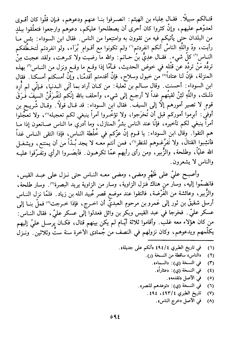 قِتَالِكُمْ سَبِيلًا. فَقَالَ عِلْبَاءُ بْنُ الْهَيْثَمِ: انْصَرِفُوا بِنَا عَنْهُمْ وَدَعُوهُمْ، فَإِنْ قَلُّوا كَانَ أَقْوَى لِعَدُوِّهِمْ عَلَيْهِمْ، وَإِنْ كَثُرُوا أَحْرَى أَنْ يَصْطَلِحُوا عَلَيْكُمْ، دَعُوهُمْ وَارْجِعُوا فَتَعَلَّقُوا بِبَلَدٍ مِنَ الْبُلْدَانِ حَتَّى يَأْتِيَكُمْ فِيهِ مَنْ تَقْوُونَ بِهِ وَامْتَنِعُوا مِنَ النَّاسِ. فَقَالَ ابْنُ السَّوْدَاءِ: بِئْسَ مَا رَأَيْتَ، وَدَّ وَاللَّهِ النَّاسُ أَنَّكُمُ انْفَرَدْتُمْ وَلَمْ تَكُونُوا مَعَ أَقْوَامٍ بُرَآءَ، وَلَوِ انْفَرَدْتُمْ لَتَخَطَّفَكُمُ النَّاسُ كُلَّ شَيْءٍ. فَقَالَ عَدِيُّ بْنُ حَاتِمٍ: وَاللَّهِ مَا رَضِيتُ وَلَا كَرِهْتُ، وَلَقَدْ عَجِبْتُ مِنْ تَرَدُّدِ مَنْ تَرَدَّدَ عَنْ قَتْلِهِ فِي خَوْضِ الْحَدِيثِ، فَأَمَّا إِذَا وَقَعَ مَا وَقَعَ وَنَزَلَ مِنَ النَّاسِ بِهَذِهِ الْمَنْزِلَةِ، فَإِنَّ لَنَا عَتَادًا مِنْ خُيُولٍ وَسِلَاحٍ، فَإِنْ أَقْدَمْتُمْ أَقْدَمْنَا وَإِنْ أَمْسَكْتُمْ أَمْسَكْنَا. فَقَالَ ابْنُ السَّوْدَاءِ: أَحْسَنْتَ. وَقَالَ سَالِمُ بْنُ ثَعْلَبَةَ: مَنْ كَانَ أَرَادَ بِمَا أَتَى الدُّنْيَا، فَإِنِّي لَمْ أُرِدْ ذَلِكَ، وَاللَّهِ لَئِنْ لَقِيتُهُمْ غَدًا لَا أَرْجِعُ إِلَى شَيْءٍ، أَحْلِفُ بِاللَّهِ إِنَّكُمْ لَتَفْرَقُنَّ السَّيْفَ فَرْقَ قَوْمٍ لَا تَصِيرُ أُمُورُهُمْ إِلَّا إِلَى السَّيْفِ. فَقَالَ ابْنُ السَّوْدَاءِ: قَدْ قَالَ قَوْلًا. وَقَالَ شُرَيْحُ بْنُ أَوْفَى: أَبْرِمُوا أُمُورَكُمْ قَبْلَ أَنْ تَخْرُجُوا، وَلَا تُؤَخِّرُوا أَمْرًا يَنْبَغِي لَكُمْ تَعْجِيلُهُ، وَلَا تُعَجِّلُوا أَمْرًا يَنْبَغِي لَكُمْ تَأْخِيرُهُ، فَإِنَّا عِنْدَ النَّاسِ بِشَرِّ الْمَنَازِلِ، وَمَا أَدْرِي مَا النَّاسُ صَانِعُونَ إِذَا مَا هُمُ الْتَقَوْا. وَقَالَ ابْنُ السَّوْدَاءِ: يَا قَوْمُ إِنَّ عَزَّكُمْ فِي خُلْطَةِ النَّاسِ، فَإِذَا الْتَقَى النَّاسُ غَدًا فَأَنْشِبُوا الْقِتَالَ، وَلَا تُفَرِّغُوهُمْ لِلنَّظَرِ، فَمَنْ أَنْتُمْ مَعَهُ لَا يَجِدُ بُدًّا مِنْ أَنْ يَمْتَنِعَ، وَيَشْغَلَ اللَّهُ عَلِيًّا، وَطَلْحَةَ، وَالزُّبَيْرَ، وَمَنْ رَأَى رَأْيَهُمْ عَمَّا تَكْرَهُونَ. فَأَبْصَرُوا الرَّأْيَ وَتَفَرَّقُوا عَلَيْهِ وَالنَّاسُ لَا يَشْعُرُونَ.