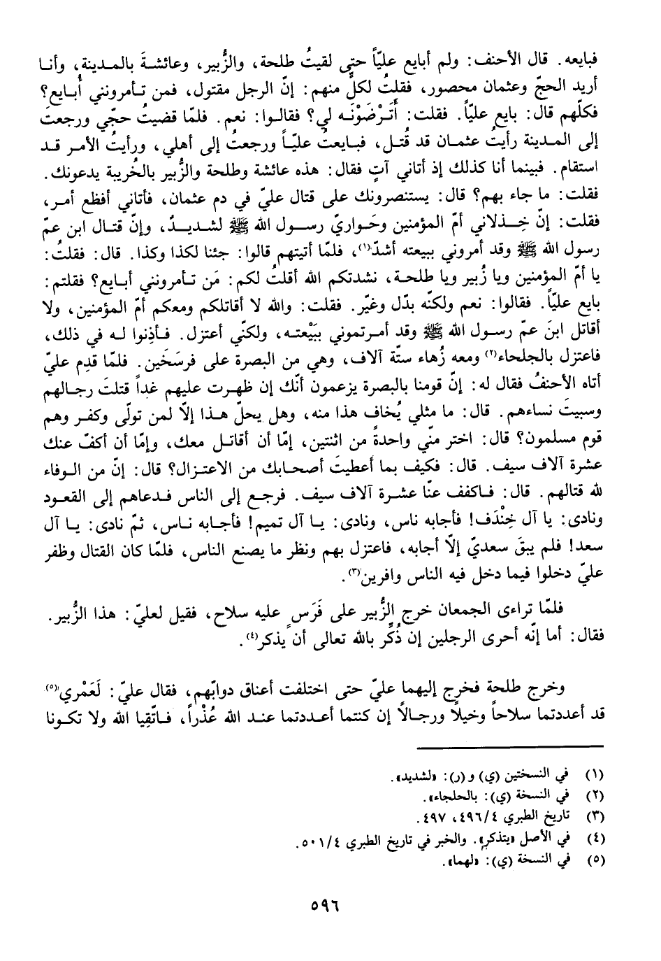 فَبَايَعَهُ. قَالَ الْأَحْنَفُ: وَلَمْ أُبَايِعْ عَلِيًّا حَتَّى لَقِيتُ طَلْحَةَ، وَالزُّبَيْرَ، وَعَائِشَةَ، بِالْمَدِينَةِ وَأَنَا أُرِيدُ الْحَجَّ وَعُثْمَانُ مَحْصُورٌ، فَقُلْتُ لِكُلٍّ مِنْهُمْ: إِنَّ الرَّجُلَ مَقْتُولٌ، فَمَنْ تَأْمُرُونَنِي أُبَايِعُ؟ فَكُلُّهُمْ قَالَ: بَايِعْ عَلِيًّا. فَقُلْتُ: أَتَرْضَوْنَهُ لِي؟ فَقَالُوا: نَعَمْ. فَلَمَّا قَضَيْتُ حَجِّي وَرَجَعْتُ إِلَى الْمَدِينَةِ رَأَيْتُ عُثْمَانَ قَدْ قُتِلَ، فَبَايَعْتُ عَلِيًّا وَرَجَعْتُ إِلَى أَهْلِي، وَرَأَيْتُ الْأَمْرَ قَدِ اسْتَقَامَ. فَبَيْنَمَا أَنَا كَذَلِكَ إِذْ أَتَانِي آتٍ فَقَالَ: هَذِهِ عَائِشَةُ وَطَلْحَةُ وَالزُّبَيْرُ بِالْخُرَيْبَةِ يَدْعُونَكَ. فَقُلْتُ: مَا جَاءَ بِهِمْ؟ قَالَ: يَسْتَنْصِرُونَكَ عَلَى قِتَالِ عَلِيٍّ فِي دَمِ عُثْمَانَ، فَأَتَانِي أَفْظَعُ أَمْرٍ، فَقُلْتُ: إِنَّ خِذْلَانِي أُمَّ الْمُؤْمِنِينَ وَحَوَارِيَّ رَسُولِ اللَّهِ - صَلَّى اللَّهُ عَلَيْهِ وَسَلَّمَ - لَشَدِيدٌ، وَإِنَّ قِتَالَ ابْنِ عَمِّ رَسُولِ اللَّهِ - صَلَّى اللَّهُ عَلَيْهِ وَسَلَّمَ - وَقَدْ أَمَرُونِي بِبَيْعَتِهِ أَشَدُّ، فَلَمَّا أَتَيْتُهُمْ قَالُوا: جِئْنَا لِكَذَا وَكَذَا. قَالَ: فَقُلْتُ: يَا أُمَّ الْمُؤْمِنِينَ وَيَا زُبَيْرُ وَيَا طَلْحَةُ، نَشَدْتُكُمُ اللَّهَ أَقُلْتُ لَكُمْ: مَنْ تَأْمُرُونَنِي أُبَايِعُ؟ فَقُلْتُمْ: بَايِعْ عَلِيًّا. فَقَالُوا: نَعَمْ وَلَكِنَّهُ بَدَّلَ وَغَيَّرَ. فَقُلْتُ: وَاللَّهِ لَا أُقَاتِلُكُمْ وَمَعَكُمْ أُمُّ الْمُؤْمِنِينَ، وَلَا أُقَاتِلُ ابْنَ عَمِّ رَسُولِ اللَّهِ - صَلَّى اللَّهُ عَلَيْهِ وَسَلَّمَ - وَقَدْ أَمَرْتُمُونِي بِبَيْعَتِهِ، وَلَكِنِّي أَعْتَزِلُ. فَأَذَنُوا لَهُ فِي ذَلِكَ، فَاعْتَزَلَ بِالْجَلْحَاءِ وَمَعَهُ زُهَاءُ سِتَّةِ آلَافٍ، وَهِيَ مِنَ الْبَصْرَةِ عَلَى فَرْسَخَيْنِ. فَلَمَّا قَدِمَ عَلِيٌّ أَتَاهُ الْأَحْنَفُ فَقَالَ لَهُ: إِنَّ قَوْمَنَا بِالْبَصْرَةِ يَزْعُمُونَ أَنَّكَ إِنْ ظَهَرْتَ عَلَيْهِمْ غَدًا قَتَلْتَ رِجَالَهُمْ وَسَبَيْتَ نِسَاءَهُمْ. قَالَ: مَا مِثْلِي يُخَافُ هَذَا مِنْهُ، وَهَلْ يَحِلُّ هَذَا إِلَّا لِمَنْ تَوَلَّى وَكَفَرَ وَهُمْ قَوْمٌ مُسْلِمُونَ؟ قَالَ: اخْتَرْ مِنِّي وَاحِدَةً مِنَ اثْنَتَيْنِ، إِمَّا أَنْ أُقَاتِلَ مَعَكَ، وَإِمَّا أَنَّ أَكُفَّ عَنْكَ عَشَرَةَ آلَافِ سَيْفٍ. قَالَ: فَكَيْفَ بِمَا أَعْطَيْتَ أَصْحَابَكَ مِنْ الِاعْتِزَالِ؟ قَالَ: إِنَّ مِنَ الْوَفَاءِ لِلَّهِ قِتَالَهُمْ. قَالَ: فَاكْفُفْ عَنَّا عَشَرَةَ آلَافِ سَيْفٍ. فَرَجَعَ إِلَى النَّاسِ فَدَعَاهُمْ إِلَى الْقُعُودِ وَنَادَى: يَا آلَ خِنْدِفٍ! فَأَجَابَهُ نَاسٌ، وَنَادَى: يَا آلَ تَمِيمٍ! فَأَجَابَهُ نَاسٌ، ثُمَّ نَادَى: يَا آلَ سَعْدٍ! فَلَمْ يَبْقَ سَعْدِيٌّ إِلَّا أَجَابَهُ، فَاعْتَزَلَ بِهِمْ وَنَظَرَ مَا يَصْنَعُ النَّاسُ، فَلَمَّا كَانَ الْقِتَالُ وَظَفِرَ عَلِيٌّ دَخَلُوا فِيمَا دَخَلَ فِيهِ النَّاسُ وَافْرِينَ.