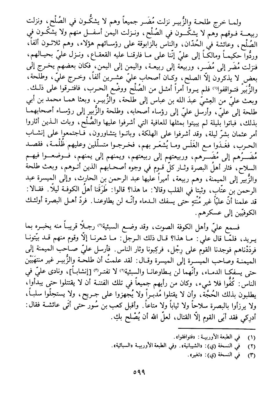 وَلِمَا خَرَجَ طَلْحَةُ وَالزُّبَيْرُ نَزَلَتْ مُضَرُ جَمِيعًا وَهُمْ لَا يَشُكُّونَ فِي الصُّلْحِ، وَنَزَلَتْ رَبِيعَةُ فَوْقَهُمْ وَهُمْ لَا يَشُكُّونَ فِي الصُّلْحِ، وَنَزَلَتِ الْيَمَنُ أَسْفَلَ مِنْهُمْ وَلَا يَشُكُّونَ فِي الصُّلْحِ، وَعَائِشَةُ فِي الْحَدَّانِ، وَالنَّاسُ بِالزَّابُوقَةِ عَلَى رُؤَسَائِهِمْ هَؤُلَاءِ، وَهُمْ ثَلَاثُونَ أَلْفًا، وَرَدُّوا حُكَيْمًا وَمَالِكًا إِلَى عَلِيٍّ إِنَّنَا عَلَى مَا فَارَقْنَا عَلَيْهِ الْقَعْقَاعَ، وَنَزَلَ عَلِيٌّ بِحِيَالِهِمْ، فَنَزَلَتْ مُضَرُ إِلَى مُضَرَ، وَرَبِيعَةُ إِلَى رَبِيعَةَ، وَالْيَمَنُ إِلَى الْيَمَنِ، فَكَانَ بَعْضُهُمْ يَخْرُجُ إِلَى بَعْضٍ لَا يَذْكُرُونَ إِلَّا الصُّلْحَ، وَكَانَ أَصْحَابُ عَلِيٍّ عِشْرِينَ أَلْفًا، وَخَرَجَ عَلِيٌّ، وَطَلْحَةُ، وَالزُّبَيْرُ فَتَوَاقَفُوا فَلَمْ يَرَوْا أَمْرًا أَمْثَلَ مِنَ الصُّلْحِ وَوَضْعِ الْحَرْبِ، فَافْتَرَقُوا عَلَى ذَلِكَ. وَبَعَثَ عَلِيٌّ مِنَ الْعَشِيِّ عَبْدَ اللَّهِ بْنَ عَبَّاسٍ إِلَى طَلْحَةَ، وَالزُّبَيْرِ، وَبَعَثَا هُمَا مُحَمَّدَ بْنَ أَبِي طَلْحَةَ إِلَى عَلِيٍّ، وَأَرْسَلَ عَلِيٌّ إِلَى رُؤَسَاءِ أَصْحَابِهِ، وَطَلْحَةُ وَالزُّبَيْرُ إِلَى رُؤَسَاءِ أَصْحَابِهِمَا بِذَلِكَ، فَبَاتُوا بِلَيْلَةٍ لَمْ يَبِيتُوا بِمِثْلِهَا لِلْعَافِيَةِ الَّتِي أَشْرَفُوا عَلَيْهَا وَالصُّلْحِ، وَبَاتَ الَّذِينَ أَثَارُوا أَمْرَ عُثْمَانَ بِشَرٍّ لَيْلَةً وَقَدْ أَشْرَفُوا عَلَى الْهَلَكَةِ، وَبَاتُوا يَتَشَاوَرُونَ، فَاجْتَمَعُوا عَلَى إِنْشَابِ الْحَرْبِ، فَغَدَوَا مَعَ الْغَلَسِ وَمَا يَشْعُرُ بِهِمْ، فَخَرَجُوا مُتَسَلِّلِينَ وَعَلَيْهِمْ ظُلْمَةٌ، فَقَصَدَ مُضَرُهُمْ إِلَى مُضَرِهِمْ، وَرَبِيعَتُهُمْ إِلَى رَبِيعَتِهِمْ، وَيَمَنُهُمْ إِلَى يَمَنِهِمْ، فَوَضَعُوا فِيهِمُ السِّلَاحَ، فَثَارَ أَهْلُ الْبَصْرَةِ وَثَارَ كُلُّ قَوْمٍ فِي وُجُوهِ أَصْحَابِهِمُ الَّذِينَ أَتَوْهُمْ، وَبَعَثَ طَلْحَةُ وَالزُّبَيْرُ إِلَى الْمَيْمَنَةِ، وَهُمْ رَبِيعَةُ، أَمِيرًا عَلَيْهَا عَبْدَ الرَّحْمَنِ بْنَ الْحَرْثِ، وَإِلَى الْمَيْسَرَةِ عَبْدَ الرَّحْمَنِ بْنَ عَتَّابٍ، وَثَبَتَا فِي الْقَلْبِ وَقَالَا: مَا هَذَا؟ قَالُوا: طَرَقَنَا أَهْلُ الْكُوفَةِ لَيْلًا. فَقَالَا: قَدْ عَلِمْنَا أَنَّ عَلِيًّا غَيْرَ مُنْتَهٍ حَتَّى يَسْفِكَ الدِّمَاءَ وَأَنَّهُ لَنْ يُطَاوِعَنَا. فَرَدَّ أَهْلُ الْبَصْرَةِ أُولَئِكَ الْكُوفِيِّينَ إِلَى عَسْكَرِهِمْ.