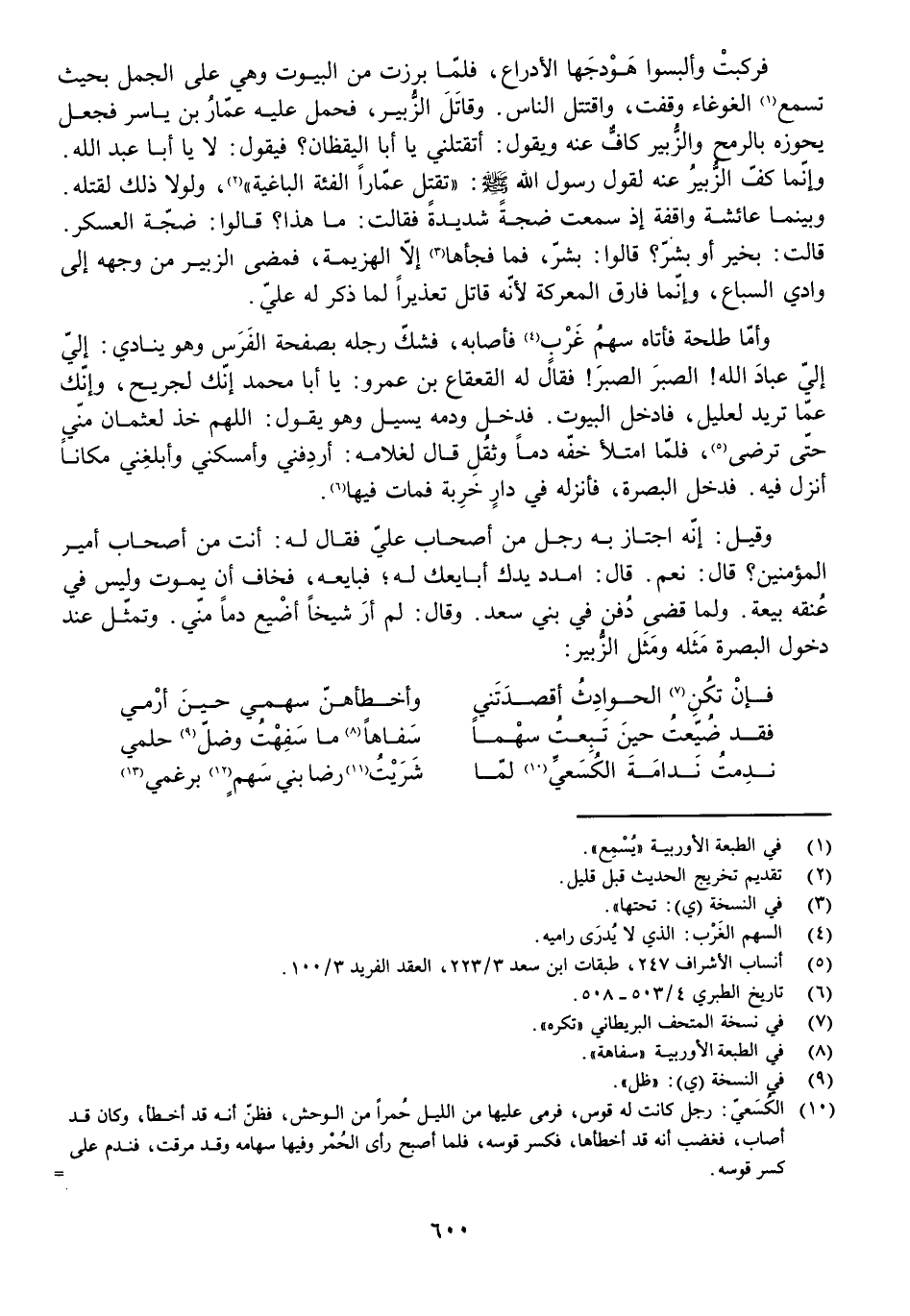 فَرَكِبَتْ وَأَلْبَسُوا هَوْدَجَهَا الْأَدْرَاعَ، فَلَمَّا بَرَزَتْ مِنَ الْبُيُوتِ وَهِيَ عَلَى الْجَمَلِ بِحَيْثُ تَسْمَعُ الْغَوْغَاءَ وَقَفَتْ، وَاقْتَتَلَ النَّاسُ. وَقَاتَلَ الزُّبَيْرُ، فَحَمَلَ عَلَيْهِ عَمَّارُ بْنُ يَاسِرٍ فَجَعَلَ يَحُوزُهُ بِالرُّمْحِ وَالزُّبَيْرُ كَافٌّ عَنْهُ وَيَقُولُ: أَتَقْتُلُنِي يَا أَبَا الْيَقْظَانِ؟ فَيَقُولُ: لَا يَا أَبَا عَبْدِ اللَّهِ. وَإِنَّمَا كَفَّ الزُّبَيْرُ عَنْهُ لِقَوْلِ رَسُولِ اللَّهِ - صَلَّى اللَّهُ عَلَيْهِ وَسَلَّمَ -: " «تَقْتُلُ عَمَّارًا الْفِئَةُ الْبَاغِيَةُ» "، وَلَوْلَا ذَلِكَ لَقَتَلَهُ. وَبَيْنَمَا عَائِشَةُ وَاقِفَةٌ إِذْ سَمِعْتُ ضَجَّةً شَدِيدَةً فَقَالَتْ: مَا هَذَا؟ قَالُوا: ضَجَّةُ الْعَسْكَرِ. قَالَتْ: بِخَيْرٍ أَوْ بِشَرٍّ؟ قَالُوا: بِشَرٍّ، فَمَا فَجَأَهَا إِلَّا الْهَزِيمَةُ، فَمَضَى الزُّبَيْرُ مِنْ وَجْهِهِ إِلَى وَادِي السِّبَاعِ، وَإِنَّمَا فَارَقَ الْمَعْرَكَةَ لِأَنَّهُ قَاتَلَ تَعْذِيرًا لِمَا ذَكَرَ لَهُ عَلِيٌّ.
