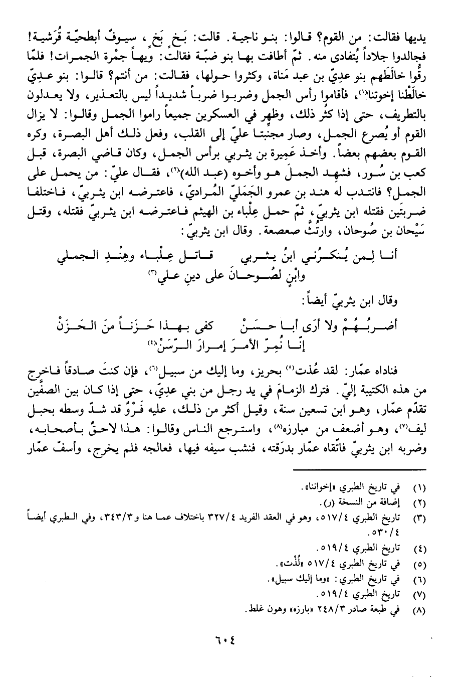 يَدَيْهَا فَقَالَتْ: مَنِ الْقَوْمُ؟ قَالُوا: بَنُو نَاجِيَةَ. قَالَتْ: بَخٍ بَخٍ، سُيُوفٌ أَبْطَحِيَّةٌ قُرَشِيَّةٌ! فَجَالَدُوا جِلَادًا يُتَفَادَى مِنْهُ. ثُمَّ أَطَافَتْ بِهَا بَنُو ضَبَّةَ فَقَالَتْ: وَيْهًا جَمْرَةَ الْجَمَرَاتِ! فَلَمَّا رَقُّوا خَالَطَهُمْ بَنُو عَدِيِّ بْنِ عَبْدِ مَنَاةَ، وَكَثُرُوا حَوْلَهَا، فَقَالَتْ: مَنْ أَنْتُمْ؟ قَالُوا: بَنُو عَدِيٍّ خَالَطْنَا إِخْوَتَنَا، فَأَقَامُوا رَأْسَ الْجَمَلِ وَضَرَبُوا ضَرْبًا شَدِيدًا لَيْسَ بِالتَّعْذِيرِ، وَلَا يَعْدِلُونَ بِالتَّطْرِيفِ، حَتَّى إِذَا كَثُرَ ذَلِكَ، وَظَهَرَ فِي الْعَسْكَرَيْنِ جَمِيعًا رَامُوا الْجَمَلَ وَقَالُوا: لَا يَزَالُ الْقَوْمُ أَوْ يُصْرَعُ الْجَمَلُ، وَصَارَ مُجَنِّبَتَا عَلِيٍّ إِلَى الْقَلْبِ، وَفَعَلَ ذَلِكَ أَهْلُ الْبَصْرَةِ، وَكَرِهَ الْقَوْمُ بَعْضُهُمْ بَعْضًا. وَأَخَذَ عَمِيرَةُ بْنُ يَثْرِبِيٍّ بِرَأْسِ الْجَمَلِ، وَكَانَ قَاضِي الْبَصْرَةِ، قَبْلَ كَعْبِ بْنِ سُورٍ، فَشَهِدَ الْجَمَلَ هُوَ وَأَخُوهُ (عَبْدُ اللَّهِ) ، فَقَالَ عَلِيٌّ: مَنْ يَحْمِلُ عَلَى الْجَمَلِ؟ فَانْتَدَبَ لَهُ هِنْدُ بْنُ عَمْرٍو الْجَمَلِيُّ الْمُرَادِيُّ، فَاعْتَرَضَهُ ابْنُ يَثْرِبِيٍّ فَاخْتَلَفَا ضَرْبَتَيْنِ فَقَتَلَهُ ابْنُ يَثْرِبِيٍّ، ثُمَّ حَمَلَ عِلْبَاءُ بْنُ الْهَيْثَمِ فَاعْتَرَضَهُ ابْنُ يَثْرِبِيٍّ فَقَتَلَهُ، وَقَتَلَ سَيْحَانَ بْنَ صُوحَانَ، وَارْتُثَّ صَعْصَعَةُ، وَقَالَ ابْنُ يَثْرِبِيٍّ: