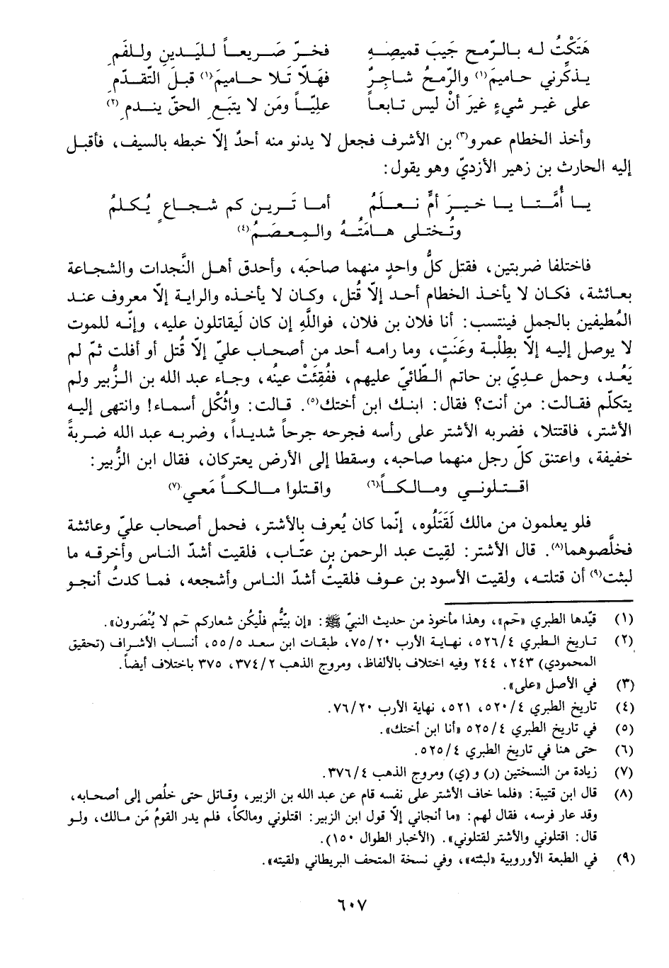 فَاخْتَلَفَا ضَرْبَتَيْنِ، فَقَتَلَ كُلٌّ وَاحِدٌ مِنْهُمَا صَاحَبَهُ، وَأَحْدَقَ أَهْلُ النَّجْدَاتِ وَالشَّجَاعَةِ بِعَائِشَةَ، فَكَانَ لَا يَأْخُذُ الْخِطَامَ أَحَدٌ إِلَّا قُتِلَ، وَكَانَ لَا يَأْخُذُهُ وَالرَّايَةَ إِلَّا مَعْرُوفٌ عِنْدَ الْمُطِيفِينَ بِالْجَمَلِ فَيَنْتَسِبُ: أَنَا فُلَانُ بْنُ فُلَانٍ، فَوَاللَّهِ إِنْ كَانَ لَيُقَاتِلُونِ عَلَيْهِ، وَإِنَّهُ لَلْمَوْتُ لَا يُوَصَّلُ إِلَيْهِ إِلَّا بِطِلْبَةٍ وَعَنَتٍ، وَمَا رَامَهُ أَحَدٌ مِنْ أَصْحَابِ عَلِيٍّ إِلَّا قُتِلَ أَوْ أَفْلَتَ ثُمَّ لَمْ يَعُدْ، وَحَمَلَ عَدِيُّ بْنُ حَاتِمٍ الطَّائِيُّ عَلَيْهِمْ، فَفُقِئَتْ عَيْنُهُ، وَجَاءَ عَبْدُ اللَّهِ بْنُ الزُّبَيْرِ وَلَمْ يَتَكَلَّمْ فَقَالَتْ: مَنْ أَنْتَ؟ فَقَالَ: ابْنُكِ ابْنُ أُخْتِكِ. قَالَتْ: وَاثُكْلَ أَسْمَاءَ! وَانْتَهَى إِلَيْهِ الْأَشْتَرُ، فَاقْتَتَلَا، فَضَرْبَهُ الْأَشْتَرُ عَلَى رَأْسِهِ فَجَرَحَهُ جُرْحًا شَدِيدًا، وَضَرْبَهُ عَبْدُ اللَّهِ ضَرْبَةً خَفِيفَةً، وَاعْتَنَقَ كُلُّ رَجُلٍ مِنْهُمَا صَاحَبَهُ وَسَقَطَا إِلَى الْأَرْضِ يَعْتَرِكَانِ، فَقَالَ ابْنُ الزُّبَيْرِ: