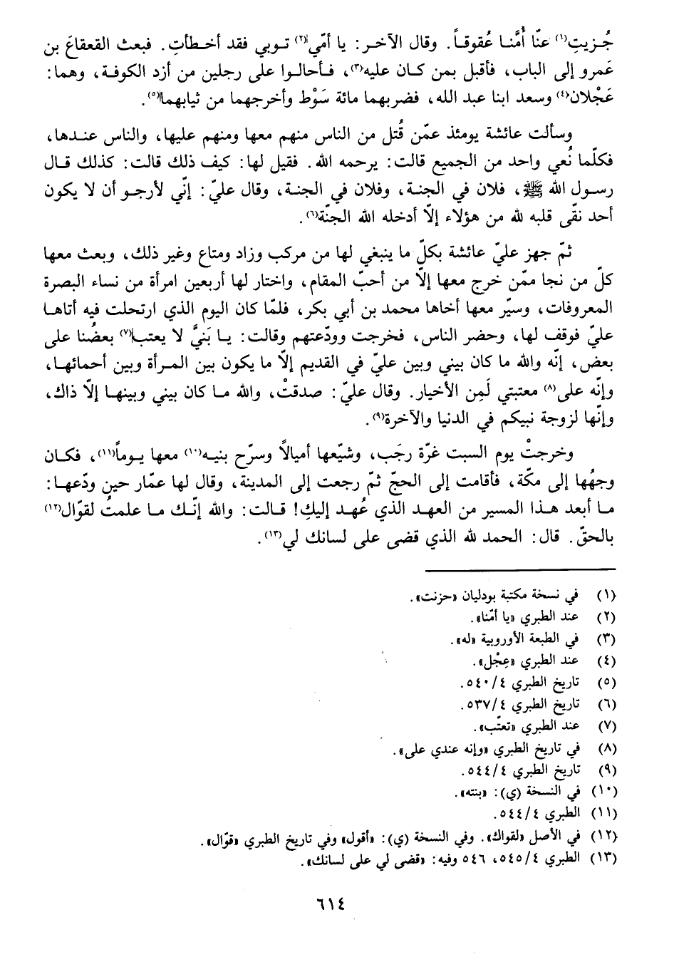 ثُمَّ جَهَّزَ عَلِيٌّ عَائِشَةَ بِكُلِّ مَا يَنْبَغِي لَهَا مِنْ مَرْكَبٍ وَزَادٍ وَمَتَاعٍ وَغَيْرِ ذَلِكَ، وَبَعَثَ مَعَهَا كُلَّ مَنْ نَجَا مِمَّنْ خَرَجَ مَعَهَا إِلَّا مَنْ أَحَبَّ الْمُقَامَ، وَاخْتَارَ لَهَا أَرْبَعِينَ امْرَأَةً مِنْ نِسَاءِ الْبَصْرَةِ الْمَعْرُوفَاتِ، وَسَيَّرَ مَعَهَا أَخَاهَا مُحَمَّدَ بْنَ أَبِي بَكْرٍ، فَلَمَّا كَانَ الْيَوْمُ الَّذِي ارْتَحَلَتْ فِيهِ أَتَاهَا عَلِيٌّ فَوَقَفَ لَهَا، وَحَضَرَ النَّاسُ، فَخَرَجَتْ وَوَدَّعَتْهُمْ وَقَالَتْ: يَا بُنَيَّ لَا يَعْتِبْ بَعْضُنَا عَلَى بَعْضٍ، إِنَّهُ وَاللَّهِ مَا كَانَ بَيْنِي وَبَيْنَ عَلِيٍّ فِي الْقَدِيمِ إِلَّا مَا يَكُونُ بَيْنَ الْمَرْأَةِ وَبَيْنَ أَحْمَائِهَا، وَإِنَّهُ عَلَى مَعْتَبَتِي لَمِنَ الْأَخْيَارِ. وَقَالَ عَلِيٌّ: صَدَقْتِ، وَاللَّهِ مَا كَانَ بَيْنِي وَبَيْنَهَا إِلَّا ذَاكَ، وَإِنَّهَا لَزَوْجَةُ نَبِيِّكُمْ فِي الدُّنْيَا وَالْآخِرَةِ.