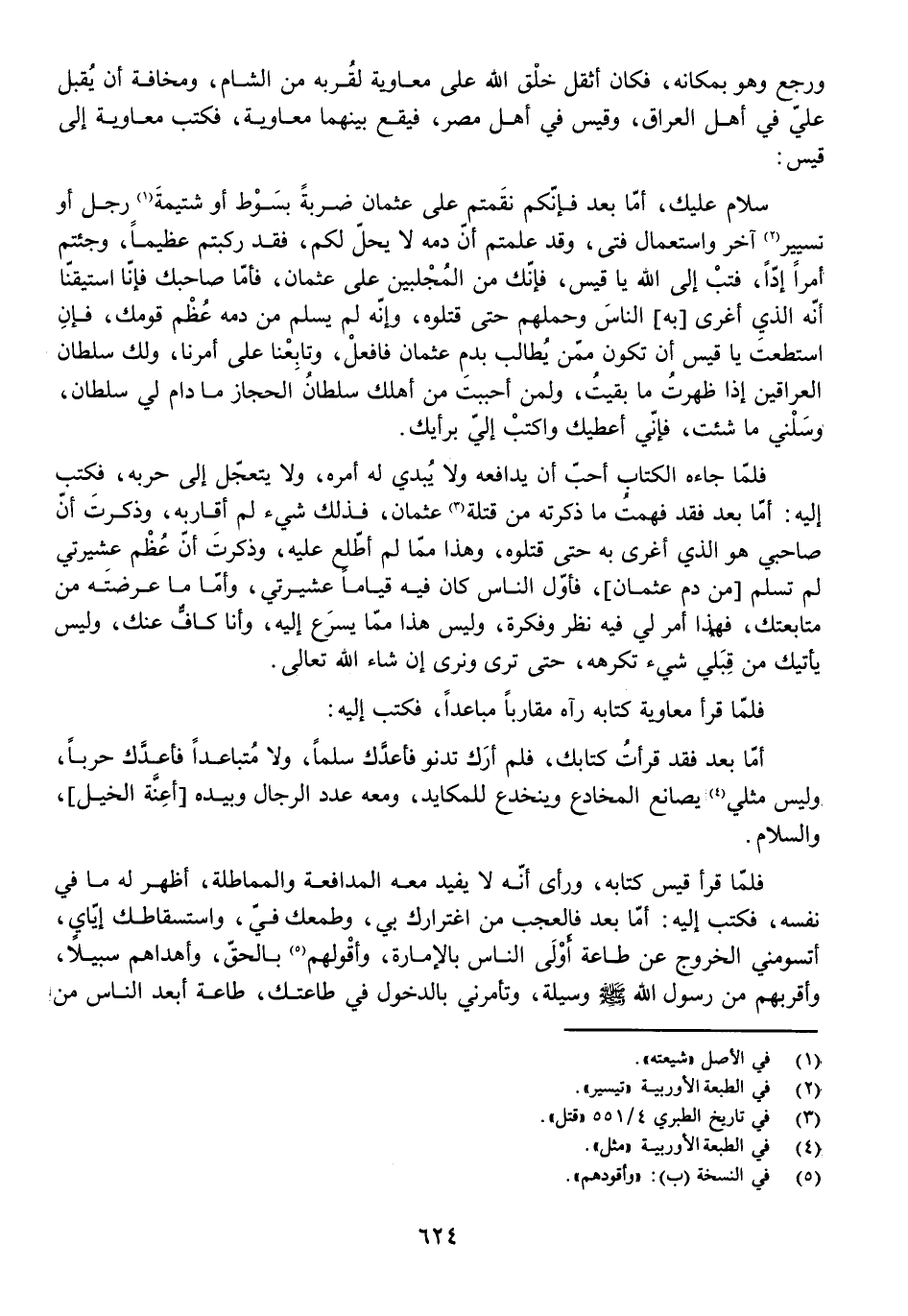 سَلَامٌ عَلَيْكَ، أَمَّا بَعْدُ فَإِنَّكُمْ نَقَمْتُمْ عَلَى عُثْمَانَ ضَرْبَةً بِسَوْطٍ أَوْ شَتِيمَةَ رَجُلٍ أَوْ تَسْيِيرَ آخَرَ وَاسْتِعْمَالَ فَتًى، وَقَدْ عَلِمْتُمْ أَنَّ دَمَهُ لَا يَحِلُّ لَكُمْ، فَقَدْ رَكِبْتُمْ عَظَيِمًا، وَجِئْتُمْ أَمْرًا إِدًّا، فَتُبْ إِلَى اللَّهِ يَا قَيْسُ، فَإِنَّكَ مِنَ الْمُجْلِبِينِ عَلَى عُثْمَانَ، فَأَمَّا صَاحِبُكَ فَإِنَّا اسْتَيْقَنَا أَنَّهُ الَّذِي أَغْرَى [بِهِ] النَّاسَ وَحَمَلَهُمْ حَتَّى قَتَلُوهُ، وَإِنَّهُ لَمْ يَسْلَمْ مِنْ دَمِهِ عُظْمَ قَوْمِكَ، فَإِنِ اسْتَطَعْتَ يَا قَيْسُ أَنْ تَكُونَ مِمَّنْ يُطَالِبُ بِدَمِ عُثْمَانَ فَافْعَلْ، وَتَابِعْنَا عَلَى أَمْرِنَا، وَلَكَ سُلْطَانُ الْعِرَاقَيْنِ إِذَا ظَهَرْتُ مَا بَقِيتُ، وَلِمَنْ أَحْبَبْتَ مِنْ أَهْلِكَ سُلْطَانُ الْحِجَازِ مَا دَامَ لِي سُلْطَانٌ، وَسَلْنِي مَا شِئْتَ، فَإِنِّي أُعْطِيكَ وَاكْتُبْ إِلَيَّ بِرَأْيِكَ.