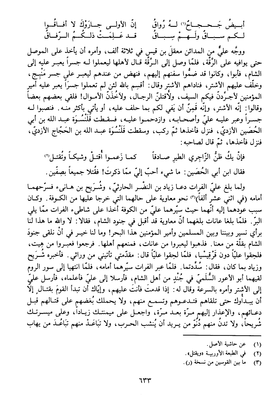 وَوَجَّهَ عَلِيٌّ مِنَ الْمَدَائِنِ مَعْقِلَ بْنَ قَيْسٍ فِي ثَلَاثَةِ آلَافٍ، وَأَمْرَهُ أَنْ يَأْخُذَ عَلَى الْمَوْصِلِ حَتَّى يُوَافِيَهُ عَلَى الرَّقَّةِ، فَلَمَّا وَصَلَ إِلَى الرَّقَّةِ قَالَ لِأَهْلِهَا لِيَعْمَلُوا لَهُ جِسْرًا يَعْبُرُ عَلَيْهِ إِلَى الشَّامِ، فَأَبَوْا، وَكَانُوا قَدْ ضَمُّوا سُفُنَهُمْ إِلَيْهِمْ، فَنَهَضَ مَنْ عِنْدِهِمْ لِيَعْبُرَ عَلَى جِسْرِ مَنْبِجَ، وَخَلَّفَ عَلَيْهِمُ الْأَشْتَرَ، فَنَادَاهُمُ الْأَشْتَرُ وَقَالَ: أُقْسِمُ بِاللَّهِ لَئِنْ لَمْ تَعْمَلُوا جِسْرًا يَعْبُرُ عَلَيْهِ أَمِيرُ الْمُؤْمِنِينَ لِأُجَرِّدَنَّ فِيكُمُ السَّيْفَ، وَلَأَقْتُلَنَّ الرِّجَالَ، وَلَآخُذَنَّ الْأَمْوَالَ! فَلَقِيَ بَعْضُهُمْ بَعْضًا وَقَالُوا: إِنَّهُ الْأَشْتَرُ، وَإِنَّهُ قَمِنٌ أَنْ يَفِيَ لَكُمْ بِمَا حَلَفَ عَلَيْهِ، أَوْ يَأْتِي بِأَكْثَرَ مِنْهُ. فَنَصَبُوا لَهُ جِسْرًا وَعَبَرَ عَلَيْهِ عَلِيٌّ وَأَصْحَابُهُ، وَازْدَحَمُوا عَلَيْهِ، فَسَقَطَتْ قَلَنْسُوَةُ عَبْدِ اللَّهِ بْنِ أَبِي الْحُصَيْنِ الْأَزْدِيِّ، فَنَزَلَ فَأَخَذَهَا، ثُمَّ رَكِبَ، وَسَقَطَتْ قَلَنْسُوَةُ عَبْدِ اللَّهِ بْنِ الْحَجَّاجِ الْأَزْدِيِّ، فَنَزَلَ فَأَخَذَهَا، ثُمَّ قَالَ لِصَاحِبِهِ: