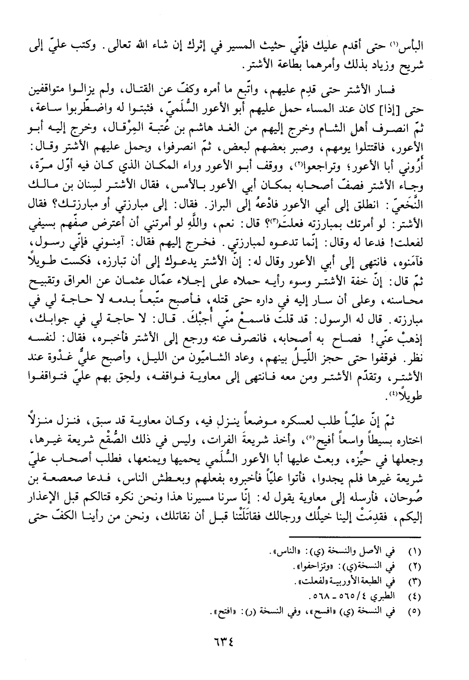 فَسَارَ الْأَشْتَرُ حَتَّى قَدِمَ عَلَيْهِمْ، وَاتَّبَعَ مَا أَمَرَهُ وَكَفَّ عَنِ الْقِتَالِ، وَلَمْ يَزَالُوا مُتَوَاقِفِينَ حَتَّى [إِذَا] كَانَ عِنْدَ الْمَسَاءِ حَمَلَ عَلَيْهِمْ أَبُو الْأَعْوَرِ السُّلَمِيُّ، فَثَبَتُوا لَهُ وَاضْطَرَبُوا سَاعَةً، ثُمَّ انْصَرَفَ أَهْلُ الشَّامِ وَخَرَجَ إِلَيْهِمْ مِنَ الْغَدِ هَاشِمُ بْنُ عُتْبَةَ الْمِرْقَالُ، وَخَرَجَ إِلَيْهِ أَبُو الْأَعْوَرِ، فَاقْتَتَلُوا يَوْمَهُمْ، وَصَبَرَ بَعْضُهُمْ لِبَعْضٍ، ثُمَّ انْصَرَفُوا، وَخَرَجَ عَلَيْهِمُ الْأَشْتَرُ وَقَالَ: أَرَوْنِي أَبَا الْأَعْوَرِ، وَتَرَاجَعُوا، وَوَقَفَ أَبُو الْأَعْوَرِ وَرَاءَ الْمَكَانِ الَّذِي كَانَ فِيهِ أَوَّلَ مَرَّةٍ، وَجَاءَ الْأَشْتَرُ فَصَفَّ أَصْحَابَهُ بِمَكَانِ أَبِي الْأَعْوَرِ بِالْأَمْسِ، فَقَالَ الْأَشْتَرُ لِسِنَانِ بْنِ مَالِكٍ النَّخَعِيِّ: انْطَلِقْ إِلَى أَبِي الْأَعْوَرِ فَادْعُهُ إِلَى الْبِرَازِ. فَقَالَ: إِلَى مُبَارَزَتِي أَوْ مُبَارَزَتِكَ؟ فَقَالَ الْأَشْتَرُ: لَوْ أَمَرْتُكَ بِمُبَارَزَتِهِ فَعَلْتَ؟ قَالَ: نَعَمْ، وَاللَّهِ لَوْ أَمَرْتَنِي أَنْ أَعْتَرِضَ صَفَّهُمْ بِسَيْفِي لَفَعَلْتُ! فَدَعَا لَهُ وَقَالَ: إِنَّمَا تَدْعُوهُ لِمُبَارَزَتِي. فَخَرَجَ إِلَيْهِمْ فَقَالَ: آمِنُونِي فَإِنِّي رَسُولٌ، فَآمَنُوهُ، فَانْتَهَى إِلَى أَبِي الْأَعْوَرِ وَقَالَ لَهُ: إِنَّ الْأَشْتَرَ يَدْعُوكَ إِلَى أَنْ تُبَارِزَهُ، فَسَكَتَ طَوِيلًا ثُمَّ قَالَ: إِنَّ خِفَّةَ الْأَشْتَرِ وَسُوءَ رَأْيِهِ حَمَلَاهُ عَلَى إِجْلَاءِ عُمَّالِ عُثْمَانَ عَنِ الْعِرَاقِ وَتَقْبِيحِ مَحَاسِنِهِ، وَعَلَى أَنْ سَارَ إِلَيْهِ فِي دَارِهِ حَتَّى قَتَلَهُ، فَأَصْبَحَ مُتَّبَعًا بِدَمِهِ لَا حَاجَةَ لِي فِي مُبَارَزَتِهِ. قَالَ لَهُ الرَّسُولُ: قَدْ قُلْتُ فَاسْمَعْ مِنِّي أُجِبْكَ. قَالَ: لَا حَاجَةَ لِي فِي جَوَابِكَ، اذْهَبْ عَنِّي! فَصَاحَ بِهِ أَصْحَابُهُ، فَانْصَرَفَ عَنْهُ وَرَجَعَ إِلَى الْأَشْتَرِ فَأَخْبَرَهُ، فَقَالَ: لِنَفْسِهِ نَظَرَ. فَوَقَفُوا حَتَّى حَجَزَ اللَّيْلُ بَيْنَهُمْ، وَعَادَ الشَّامِيُّونَ مِنَ اللَّيْلِ، وَأَصْبَحَ عَلِيٌّ غَدْوَةً عِنْدَ الْأَشْتَرِ، وَتَقَدَّمَ الْأَشْتَرُ وَمَنْ مَعَهُ فَانْتَهَى إِلَى مُعَاوِيَةَ فَوَاقَفَهُ، وَلَحِقَ بِهِمْ عَلِيٌّ فَتَوَاقَفُوا طَوِيلًا.