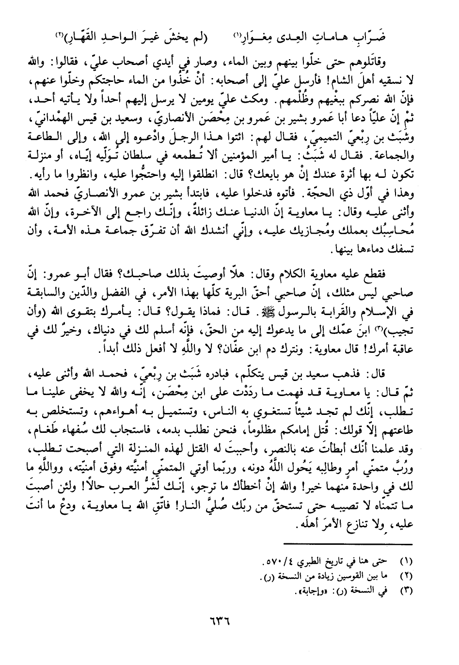 وَقَاتَلُوهُمْ حَتَّى خَلَّوْا بَيْنَهُمْ وَبَيْنَ الْمَاءِ، وَصَارَ فِي أَيْدِي أَصْحَابِ عَلِيٍّ، فَقَالُوا: وَاللَّهِ لَا نُسْقِيهِ أَهْلَ الشَّامِ! فَأَرْسَلَ عَلِيٌّ إِلَى أَصْحَابِهِ: أَنْ خُذُوا مِنَ الْمَاءِ حَاجَتَكُمْ وَخَلُّوا عَنْهُمْ، فَإِنَّ اللَّهَ نَصَرَكُمْ بِبَغْيِهِمْ وَظُلْمِهِمْ. وَمَكَثَ عَلِيٌّ يَوْمَيْنِ لَا يُرْسِلُ إِلَيْهِمْ أَحَدًا وَلَا يَأْتِيهِ أَحَدٌ، ثُمَّ إِنَّ عَلِيًّا دَعَا أَبَا عَمْرٍو بَشِيرَ بْنَ عَمْرِو بْنِ مِحْصَنٍ الْأَنْصَارِيَّ، وَسَعِيدَ بْنَ قَيْسٍ الْهَمْدَانِيَّ، وَشَبَثَ بْنَ رِبْعِيٍّ التَّمِيمِيَّ، فَقَالَ لَهُمْ: ائْتُوا هَذَا الرَّجُلَ وَادْعُوهُ إِلَى اللَّهِ، وَإِلَى الطَّاعَةِ وَالْجَمَاعَةِ. فَقَالَ لَهُ شَبَثٌ: يَا أَمِيرَ الْمُؤْمِنِينَ أَلَا تُطْمِعُهُ فِي سُلْطَانٍ تَوَلِّيهِ إِيَّاهُ، أَوْ مَنْزِلَةٍ تَكُونُ لَهُ بِهَا أَثَرَةٌ عِنْدِكَ إِنْ هُوَ بَايَعَكَ؟ قَالَ: انْطَلِقُوا إِلَيْهِ وَاحْتَجُّوا عَلَيْهِ، وَانْظُرُوا مَا رَأْيُهُ. وَهَذَا فِي أَوَّلِ ذِي الْحِجَّةِ. فَأَتَوْهُ فَدَخَلُوا عَلَيْهِ، فَابْتَدَأَ بَشِيرُ بْنُ عَمْرٍو الْأَنْصَارِيُّ فَحَمِدَ اللَّهَ وَأَثْنَى عَلَيْهِ وَقَالَ: يَا مُعَاوِيَةَ إِنَّ الدُّنْيَا عَنْكَ زَائِلَةٌ، وَإِنَّكَ رَاجِعٌ إِلَى الْآخِرَةِ، وَإِنَّ اللَّهَ مُحَاسِبُكَ بِعَمَلِكَ وَمُجَازِيكَ عَلَيْهِ، وَإِنِّي أَنْشُدُكَ اللَّهَ أَنْ تُفَرِّقُ جَمَاعَةَ هَذِهِ الْأُمَّةَ وَأَنْ تَسْفِكَ دِمَاءَهَا بَيْنَهَا.