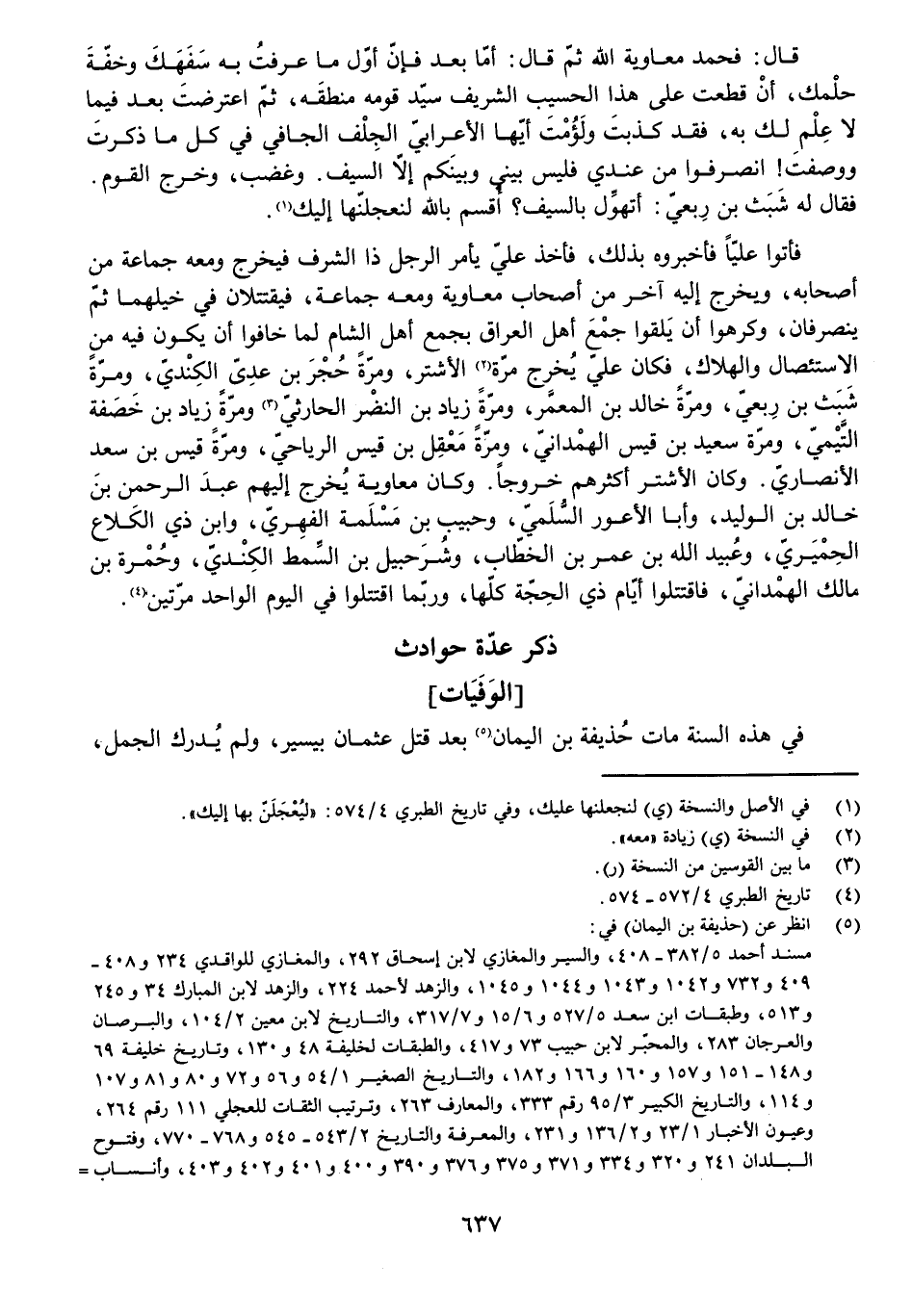 قَالَ: فَحَمِدَ مُعَاوِيَةُ اللَّهَ ثُمَّ قَالَ: أَمَّا بَعْدُ فَإِنَّ أَوَّلَ مَا عَرَفْتُ بِهِ سَفَهَكَ وَخِفَّةَ حِلْمِكَ، أَنْ قَطَعْتَ عَلَى هَذَا الْحَسِيبِ الشَّرِيفِ سَيِّدِ قَوْمِهِ مَنْطِقَهُ، ثُمَّ اعْتَرَضْتَ بَعْدُ فِيمَا لَا عِلْمَ لَكَ بِهِ، فَقَدْ كَذَبْتَ وَلَؤُمْتَ أَيُّهَا الْأَعْرَابِيُّ الْجِلْفُ الْجَافِي فِي كُلِّ مَا ذَكَرْتَ وَوَصَفْتَ! انْصَرِفُوا مِنْ عِنْدِي فَلَيْسَ بَيْنِي وَبَيْنَكُمْ إِلَّا السَّيْفَ. وَغَضِبَ، وَخَرَجَ الْقَوْمُ. فَقَالَ لَهُ شَبَثُ بْنُ رِبْعِيٍّ: أَتُهَوِّلُ بِالسَّيْفِ؟ أُقْسِمُ بِاللَّهِ لَنُعَجِّلَنَّهَا إِلَيْكَ.