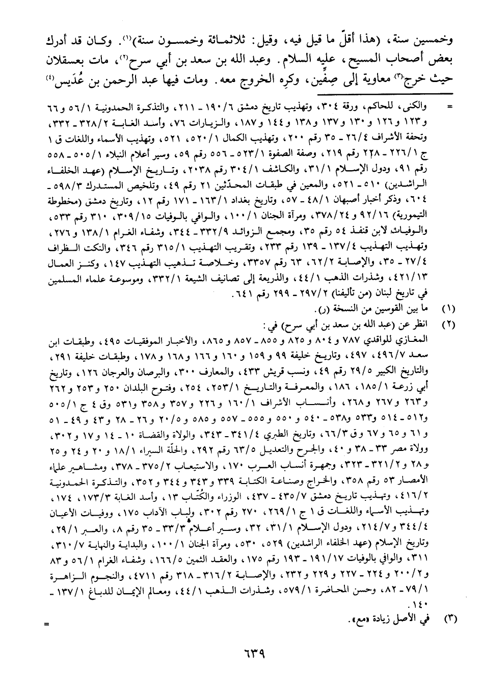 وَخَمْسِينَ سَنَةً، (هَذَا أَقَلُّ مَا قِيلَ فِيهِ، وَقِيلَ: ثَلَثُمِائَةٍ وَخَمْسُونَ سَنَةً) . وَكَانَ قَدْ أَدْرَكَ بَعْضَ أَصْحَابِ الْمَسِيحِ - عَلَيْهِ السَّلَامُ -. وَعَبْدُ اللَّهِ بْنُ سَعْدِ بْنِ أَبِي سَرْحٍ، مَاتَ بِعَسْقَلَانَ حَيْثُ خَرَجَ مُعَاوِيَةُ إِلَى صِفِّينَ، وَكَرِهَ الْخُرُوجَ مَعَهُ. وَمَاتَ فِيهَا عَبْدُ الرَّحْمَنِ بْنُ عُدَيْسٍ
