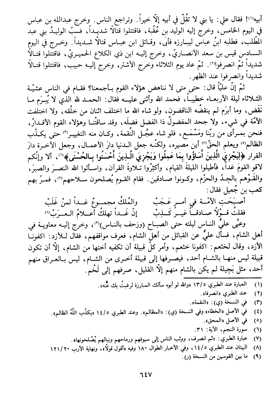 ثُمَّ إِنَّ عَلِيًّا قَالَ: حَتَّى مَتَى لَا نُنَاهِضُ الْقَوْمَ بِأَجْمَعِنَا؟ فَقَامَ فِي النَّاسِ عَشِيَّةَ الثُّلَاثَاءِ لَيْلَةَ الْأَرْبِعَاءِ خَطِيبًا، فَحَمِدَ اللَّهَ وَأَثْنَى عَلَيْهِ فَقَالَ: الْحَمْدُ لِلَّهِ الَّذِي لَا يُبْرَمُ مَا نَقَضَ، وَمَا أَبْرَمَ لَمْ يَنْقُضْهُ النَّاقِضُونَ، وَلَوْ شَاءَ اللَّهُ مَا اخْتَلَفَ اثْنَانِ مِنْ خَلْقِهِ، وَلَا اخْتَلَفَتِ الْأُمَّةُ فِي شَيْءٍ، وَلَا جَحَدَ الْمَفْضُولُ ذَا الْفَضْلِ فَضْلَهُ، وَقَدْ سَاقَتْنَا وَهَؤُلَاءِ الْقَوْمَ الْأَقْدَارُ، فَنَحْنُ بِمَرْأَى مِنْ رَبِّنَا وَمَسْمَعٍ، فَلَوْ شَاءَ عَجَّلَ النِّقْمَةَ، وَكَانَ مِنْهُ التَّغْيِيرُ حَتَّى يُكَذَّبَ الظَّالِمُ وَيَعْلَمَ الْحَقُّ أَيْنَ مَصِيرُهُ، وَلَكِنَّهُ جَعَلَ الدُّنْيَا دَارَ الْأَعْمَالِ، وَجَعَلَ الْآخِرَةَ دَارَ الْقَرَارِ {لِيَجْزِيَ الَّذِينَ أَسَاءُوا بِمَا عَمِلُوا وَيَجْزِيَ الَّذِينَ أَحْسَنُوا بِالْحُسْنَى} [النجم: 31] ، أَلَا وَإِنَّكُمْ لَاقُو الْقَوْمِ غَدًا، فَأَطِيلُوا اللَّيْلَةَ الْقِيَامَ، وَأَكْثِرُوا تِلَاوَةَ الْقُرْآنِ، وَاسْأَلُوا اللَّهَ النَّصْرَ وَالصَّبْرَ، وَالْقَوْهُمْ بِالْجِدِّ وَالْحَزْمِ، وَكُونُوا صَادِقِينَ. فَقَامَ الْقَوْمُ يُصْلِحُونَ سِلَاحَهُمْ، فَمَرَّ بِهِمْ كَعْبُ بْنُ جُعَيْلٍ فَقَالَ: