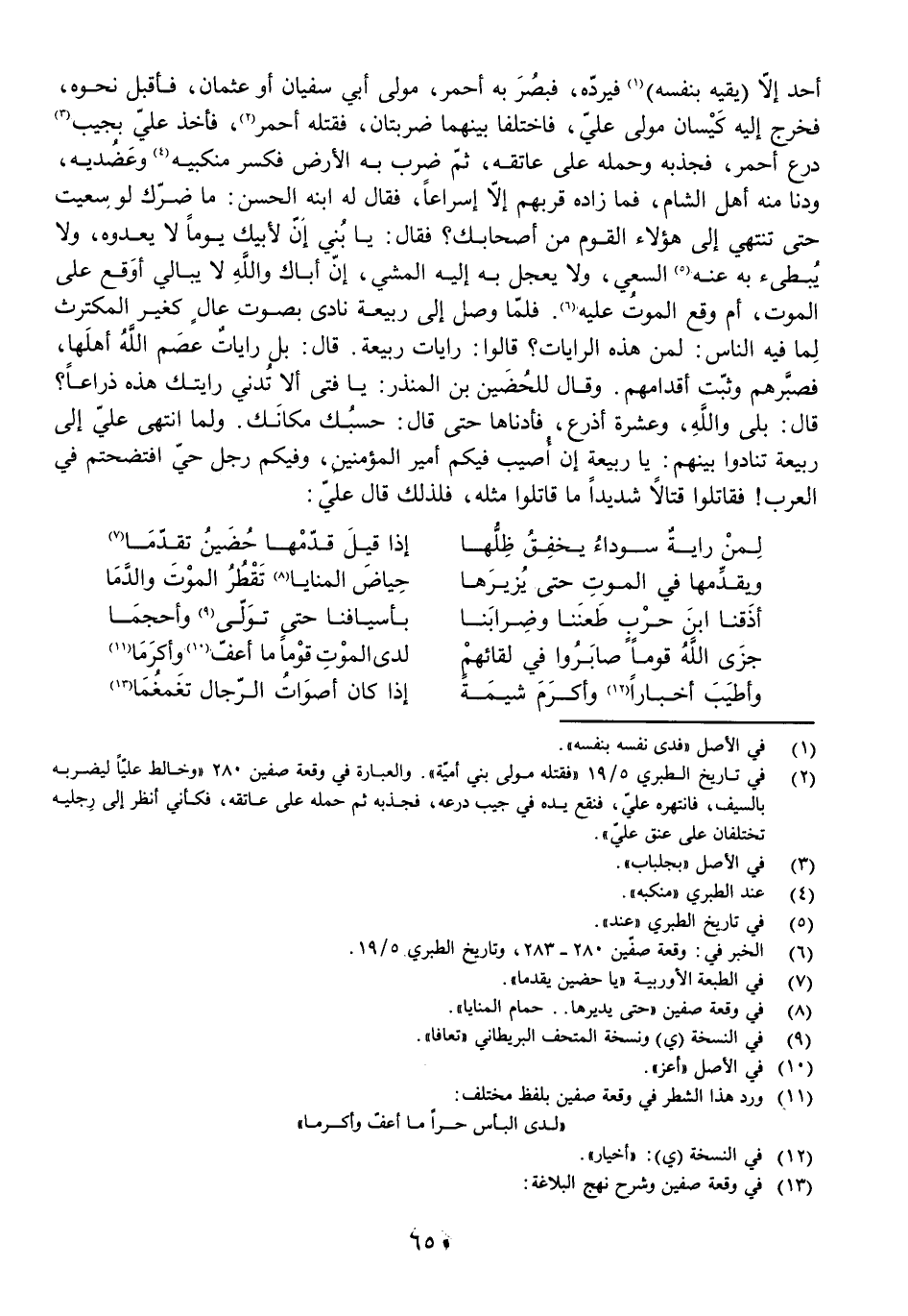 أَحَدٌ إِلَّا (يَقِيهِ بِنَفْسِهِ) فَيَرُدُّهُ، فَبَصُرَ بِهِ أَحْمَرُ مَوْلَى أَبِي سُفْيَانَ أَوْ عُثْمَانَ، فَأَقْبَلَ نَحْوَهُ، فَخَرَجَ إِلَيْهِ كَيْسَانُ مَوْلَى عَلِيٍّ، فَاخْتَلَفَا بَيْنَهُمَا ضَرْبَتَانِ، فَقَتَلَهُ أَحْمَرُ، فَأَخَذَ عَلِيٌّ بِجَيْبِ دِرْعِ أَحْمَرَ، فَجَذَبَهُ وَحَمَلَهُ عَلَى عَاتِقِهِ، ثُمَّ ضَرَبَ بِهِ الْأَرْضَ فَكَسَرَ مَنْكِبَيْهِ وَعَضُدَيْهِ، وَدَنَا مِنْهُ أَهْلُ الشَّامِ، فَمَا زَادَهُ قُرْبُهُمْ إِلَّا إِسْرَاعًا، فَقَالَ لَهُ ابْنُهُ الْحَسَنُ: مَا ضَرَّكَ لَوْ سَعَيْتَ حَتَّى تَنْتَهِيَ إِلَى هَؤُلَاءِ الْقَوْمِ مِنْ أَصْحَابِكَ؟ فَقَالَ: يَا بُنَيَّ إِنَّ لِأَبِيكَ يَوْمًا لَا يَعْدُوهُ، وَلَا يُبْطِئُ بِهِ عَنْهُ السَّعْيُ، وَلَا يُعَجِّلُ بِهِ إِلَيْهِ الْمَشْيُ، إِنَّ أَبَاكَ وَاللَّهِ لَا يُبَالِي أَوَقَعَ عَلَى الْمَوْتِ، أَمْ وَقَعَ الْمَوْتُ عَلَيْهِ. فَلَمَّا وَصَلَ إِلَى رَبِيعَةَ نَادَى بِصَوْتٍ عَالٍ كَغَيْرِ الْمُكْتَرِثِ لِمَا فِيهِ النَّاسِ: لِمَنْ هَذِهِ الرَّايَاتُ؟ قَالُوا: رَايَاتُ رَبِيعَةَ. قَالَ: بَلْ رَايَاتٌ عَصَمَ اللَّهُ أَهْلَهَا، فَصَبَّرَهُمْ وَثَبَّتَ أَقْدَامَهُمْ. وَقَالَ لِلْحُضَيْنِ بْنِ الْمُنْذِرِ: يَا فَتَى أَلَا تُدْنِي رَايَتَكَ هَذِهِ ذِرَاعًا؟ قَالَ: بَلَى وَاللَّهِ، وَعَشَرَةَ أَذْرُعٍ، فَأَدْنَاهَا حَتَّى قَالَ: حَسْبُكَ مَكَانَكَ. وَلَمَّا انْتَهَى عَلِيٌّ إِلَى رَبِيعَةَ تَنَادَوْا بَيْنَهُمْ: يَا رَبِيعَةَ إِنْ أُصِيبَ فِيكُمْ أَمِيرُ الْمُؤْمِنِينَ، وَفِيكُمْ رَجُلٌ حَيٌّ افْتَضَحْتُمْ فِي الْعَرَبِ! فَقَاتَلُوا قِتَالًا شَدِيدًا مَا قَاتَلُوا مِثْلَهُ، فَلِذَلِكَ قَالَ عَلِيٌّ: