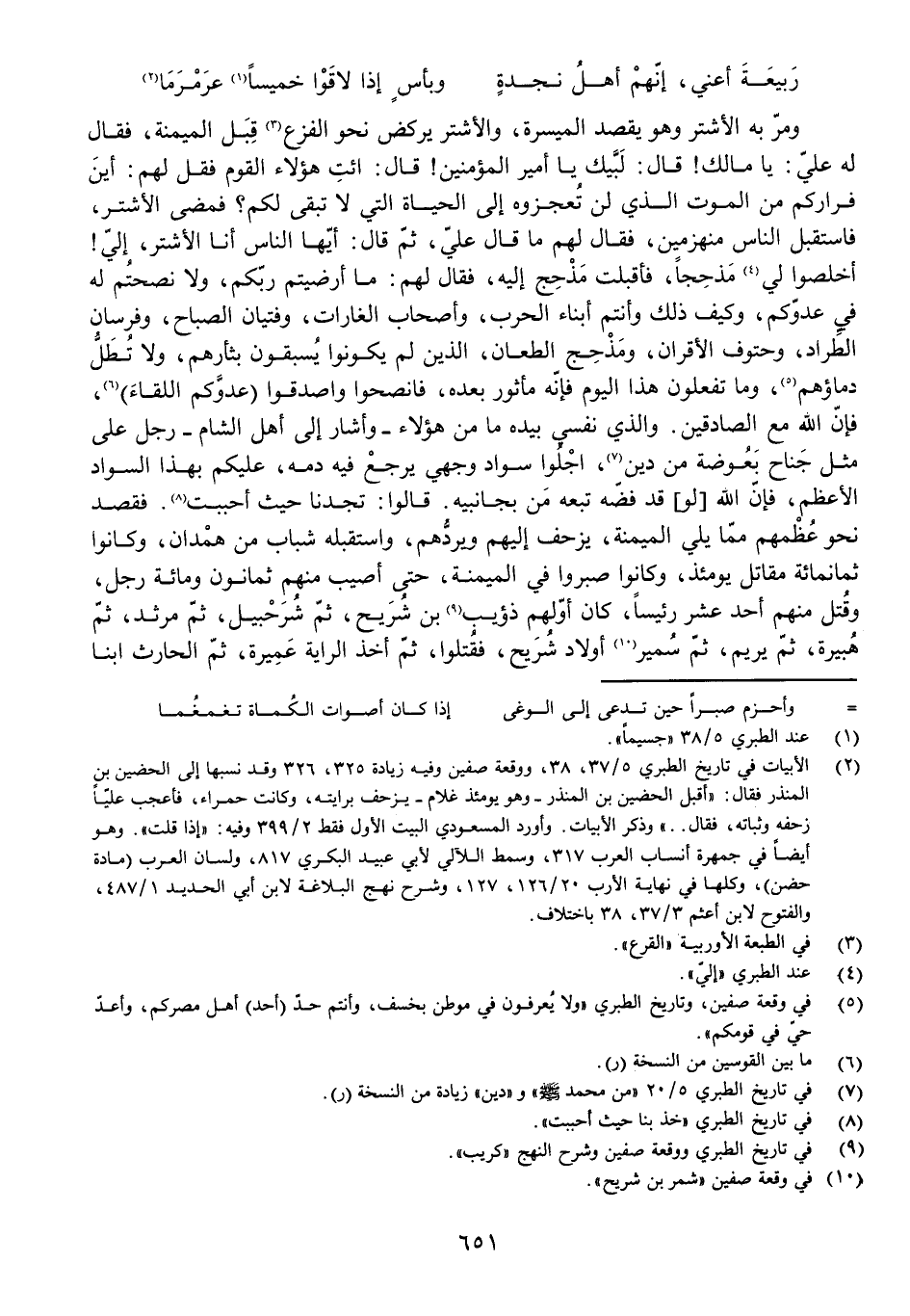 وَمَرَّ بِهِ الْأَشْتَرُ وَهُوَ يَقْصِدُ الْمَيْسَرَةَ، وَالْأَشْتَرُ يَرْكُضُ نَحْوَ الْفَزَعِ قِبَلَ الْمَيْمَنَةِ، فَقَالَ لَهُ عَلِيٌّ: يَا مَالِكُ! قَالَ: لَبَّيْكَ يَا أَمِيرَ الْمُؤْمِنِينَ! قَالَ: ائْتِ هَؤُلَاءِ الْقَوْمَ فَقُلْ لَهُمْ: أَيْنَ فِرَارُكُمْ مِنَ الْمَوْتِ الَّذِي لَنْ تُعْجِزُوهُ إِلَى الْحَيَاةِ الَّتِي لَا تَبْقَى لَكُمْ؟ فَمَضَى الْأَشْتَرُ، فَاسْتَقْبَلَ النَّاسَ مُنْهَزِمِينَ، فَقَالَ لَهُمْ مَا قَالَ عَلِيٌّ، ثُمَّ قَالَ: أَيُّهَا النَّاسُ أَنَا الْأَشْتَرُ، إِلَيَّ! أَخْلِصُوا لِي مَذْحِجًا، فَأَقْبَلَتْ مَذْحِجٌ إِلَيْهِ، فَقَالَ لَهُمْ: مَا أَرْضَيْتُمْ رَبَّكُمْ، وَلَا نَصَحْتُمْ لَهُ فِي عَدُوِّكُمْ، وَكَيْفَ ذَلِكَ وَأَنْتُمْ أَبْنَاءُ الْحَرْبِ، وَأَصْحَابُ الْغَارَاتِ، وَفِتْيَانُ الصَّبَاحِ، وَفُرْسَانُ الطِّرَادِ، وَحُتُوفُ الْأَقْرَانِ، وَمَذْحِجُ الطِّعَانِ، الَّذِينَ لَمْ يَكُونُوا يُسْبَقُونَ بِثَأْرِهِمْ، وَلَا تُطَلُّ دِمَاؤُهُمْ، وَمَا تَفْعَلُونَ هَذَا الْيَوْمَ فَإِنَّهُ مَأْثُورٌ بَعْدَهُ، فَانْصَحُوا وَاصْدُقُوا (عَدُوَّكُمُ اللِّقَاءَ) ، فَإِنَّ اللَّهَ مَعَ الصَّادِقِينَ. وَالَّذِي نَفْسِي بِيَدِهِ مَا مِنْ هَؤُلَاءِ وَأَشَارَ إِلَى أَهْلِ الشَّامِ رَجُلٌ عَلَى مِثْلِ جَنَاحِ بَعُوضَةٍ مِنْ دِينٍ، اجْلُوا سَوَادَ وَجْهِي يَرْجِعْ فِيهِ دَمُهُ، عَلَيْكُمْ بِهَذَا السَّوَادِ الْأَعْظَمِ، فَإِنَّ اللَّهَ [لَوْ] قَدْ فَضَّهُ تَبِعَهُ مَنْ بِجَانِبَيْهِ. قَالُوا: تَجِدُنَا حَيْثُ أَحْبَبْتَ. فَقَصَدَ نَحْوَ عُظْمِهِمْ مِمَّا يَلِي الْمَيْمَنَةَ، يَزْحَفُ إِلَيْهِمْ وَيَرُدُّهُمْ، وَاسْتَقْبَلَهُ شَبَابٌ مِنْ هَمْدَانَ، وَكَانُوا ثَمَانِمِائَةَ مُقَاتِلٍ يَوْمَئِذٍ، وَكَانُوا صَبَرُوا فِي الْمَيْمَنَةِ، حَتَّى أُصِيبَ مِنْهُمْ ثَمَانُونَ وَمِائَةُ رَجُلٍ، وَقُتِلَ مِنْهُمْ أَحَدَ عَشَرَ رَئِيسًا، كَانَ أَوَّلُهُمْ ذُؤَيْبُ بْنُ شُرَيْحٍ، ثُمَّ شُرَحْبِيلُ، ثُمَّ مَرْثَدٌ، ثُمَّ هُبَيْرَةُ، ثُمَّ يَرِيمُ، ثُمَّ سُمَيْرٌ أَوْلَادُ شُرَيْحٍ، فَقُتِلُوا، ثُمَّ أَخَذَ الرَّايَةَ عَمِيرَةُ ثُمَّ الْحَارِثُ ابْنَا