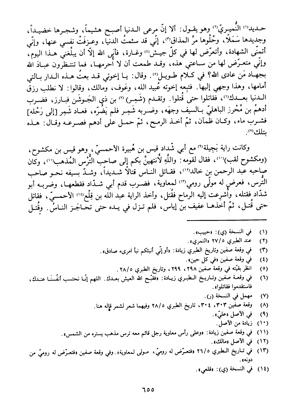 حَدِيدٍ النُّمَيْرِيُّ وَهُوَ يَقُولُ: أَلَا إِنَّ مَرْعَى الدُّنْيَا أَصْبَحَ هَشِيمًا، وَشَجَرَهَا خَضِيدًا، وَجَدِيدَهَا سَمَلًا، وَحُلْوَهَا مُرَّ الْمَذَاقِ، إِنِّي قَدْ سَئِمْتُ الدُّنْيَا، وَعَزَفْتُ نَفْسِي عَنْهَا، وَإِنِّي أَتَمَنَّى الشَّهَادَةَ، وَأَتَعَرَّضُ لَهَا فِي كُلِّ جَيْشٍ وَغَارَةٍ، فَأَبَى اللَّهُ إِلَّا أَنْ يُبَلِّغَنِي هَذَا الْيَوْمَ، وَإِنِّي مُتَعَرِّضٌ لَهَا مِنْ سَاعَتِي هَذِهِ، وَقَدْ طَمِعْتُ أَنْ لَا أُحْرَمَهَا، فَمَا تَنْتَظِرُونَ عِبَادَ اللَّهِ بِجِهَادِ مَنْ عَادَى اللَّهَ؟ فِي كَلَامٍ طَوِيلٍ. وَقَالَ: يَا إِخْوَتِي قَدْ بِعْتُ هَذِهِ الدَّارَ بِالَّتِي أَمَامَهَا، وَهَذَا وَجْهِي إِلَيْهَا. فَتَبِعَهُ إِخْوَتُهُ عُبَيْدُ اللَّهِ، وَعَوْفٌ، وَمَالِكٌ، وَقَالُوا: لَا نَطْلُبُ رِزْقَ الدُّنْيَا بَعْدَكَ، فَقَاتَلُوا حَتَّى قُتِلُوا. وَتَقَدَّمَ (شَمِرُ) بْنُ ذِي الْجَوْشَنِ فَبَارَزَ، فَضَرَبَ أَدْهَمُ بْنُ مُحْرِزٍ الْبَاهِلِيُّ بِالسَّيْفِ وَجْهَهُ، وَضَرْبَهُ شَمِرٌ فَلَمْ يَضُرَّهُ، فَعَادَ شَمِرٌ [إِلَى رَحْلِهِ] فَشَرِبَ مَاءً، وَكَانَ ظَمْآنَ، ثُمَّ أَخَذَ الرُّمْحَ ثُمَّ حَمَلَ عَلَى أَدْهَمَ فَصَرَعَهُ وَقَالَ: هَذِهِ بِتِلْكَ.