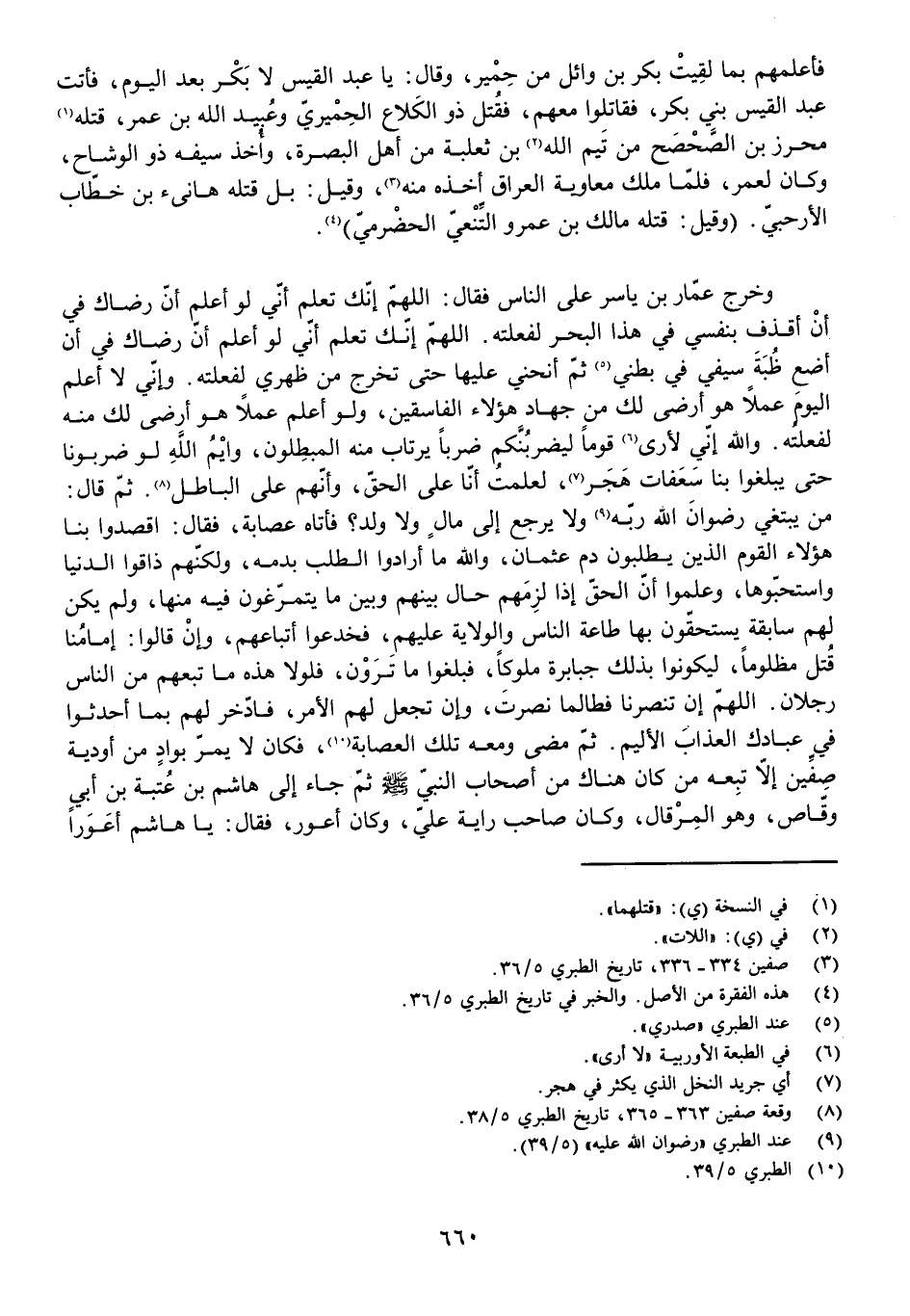 وَخَرَجَ عَمَّارُ بْنُ يَاسِرٍ عَلَى النَّاسِ فَقَالَ: اللَّهُمَّ إِنَّكَ تَعْلَمُ أَنِّي لَوْ أَعْلَمُ أَنَّ رِضَاكَ فِي أَنْ أَقْذِفَ بِنَفْسِي فِي هَذَا الْبَحْرِ لَفَعَلْتُهُ. اللَّهُمَّ إِنَّكَ تَعْلَمُ أَنِّي لَوْ أَعْلَمُ أَنَّ رِضَاكَ فِي أَنْ أَضَعَ ظُبَةَ سَيْفِي فِي بَطْنِي ثُمَّ أَنْحَنِي عَلَيْهَا حَتَّى تَخْرُجَ مِنْ ظَهْرِي لَفَعَلْتُهُ. وَإِنِّي لَا أَعْلَمُ الْيَوْمَ عَمَلًا هُوَ أَرْضَى لَكَ مِنْ جِهَادِ هَؤُلَاءِ الْفَاسِقِينَ، وَلَوْ أَعْلَمُ عَمَلًا هُوَ أَرْضَى لَكَ مِنْهُ لَفَعَلْتُهُ. وَاللَّهِ إِنِّي لَأَرَى قَوْمًا لَيَضْرِبُنَّكُمْ ضَرْبًا يَرْتَابُ مِنْهُ الْمُبْطِلُونَ، وَايْمُ اللَّهِ لَوْ ضَرَبُونَا حَتَّى يَبْلُغُوا بِنَا سَعَفَاتِ هَجَرَ، لَعَلِمْتُ أَنَّا عَلَى الْحَقِّ، وَأَنَّهُمْ عَلَى الْبَاطِلِ. ثُمَّ قَالَ: مَنْ يَبْتَغِي رِضْوَانَ اللَّهِ رَبِّهِ وَلَا يَرْجِعُ إِلَى مَالٍ وَلَا وَلَدٍ؟ فَأَتَاهُ عِصَابَةٌ، فَقَالَ: اقْصِدُوا بِنَا هَؤُلَاءِ الْقَوْمَ الَّذِينَ يَطْلُبُونَ دَمَ عُثْمَانَ، وَاللَّهِ مَا أَرَادُوا الطَّلَبَ بِدَمِهِ، وَلَكِنَّهُمْ ذَاقُوا الدُّنْيَا وَاسْتَحَبُّوهَا، وَعَلِمُوا أَنَّ الْحَقَّ إِذَا لَزِمَهُمْ حَالَ بَيْنَهُمْ وَبَيْنَ مَا يَتَمَرَّغُونَ فِيهِ مِنْهَا، وَلَمْ يَكُنْ لَهُمْ سَابِقَةٌ يَسْتَحِقُّونَ بِهَا طَاعَةَ النَّاسِ وَالْوِلَايَةَ عَلَيْهِمْ، فَخَدَعُوا أَتْبَاعَهُمْ وَإِنْ قَالُوا: إِمَامُنَا قُتِلَ مَظْلُومًا، لِيَكُونُوا بِذَلِكَ جَبَابِرَةً مُلُوكًا، فَبَلَغُوا مَا تَرَوْنَ، فَلَوْلَا هَذِهِ مَا تَبِعَهُمْ مِنَ النَّاسِ رَجُلَانِ. اللَّهُمَّ إِنْ تَنْصُرْنَا فَطَالَمَا نَصَرْتَ، وَإِنْ تَجْعَلْ لَهُمُ الْأَمْرَ فَادَّخِرْ لَهُمْ بِمَا أَحْدَثُوا فِي عِبَادِكَ الْعَذَابَ الْأَلِيمَ. ثُمَّ مَضَى وَمَعَهُ تِلْكَ الْعِصَابَةُ، فَكَانَ لَا يَمُرُّ بِوَادٍ مِنْ أَوْدِيَةِ صِفِّينَ إِلَّا تَبِعَهُ مَنْ كَانَ هُنَاكَ مِنْ أَصْحَابِ النَّبِيِّ - صَلَّى اللَّهُ عَلَيْهِ وَسَلَّمَ -، ثُمَّ جَاءَ إِلَى هَاشِمِ بْنِ عُتْبَةَ بْنِ أَبِي وَقَّاصٍ، وَهُوَ الْمِرْقَالُ، وَكَانَ صَاحِبَ رَايَةِ عَلِيٍّ، وَكَانَ أَعْوَرَ، فَقَالَ: يَا هَاشِمُ أَعَوَرًا