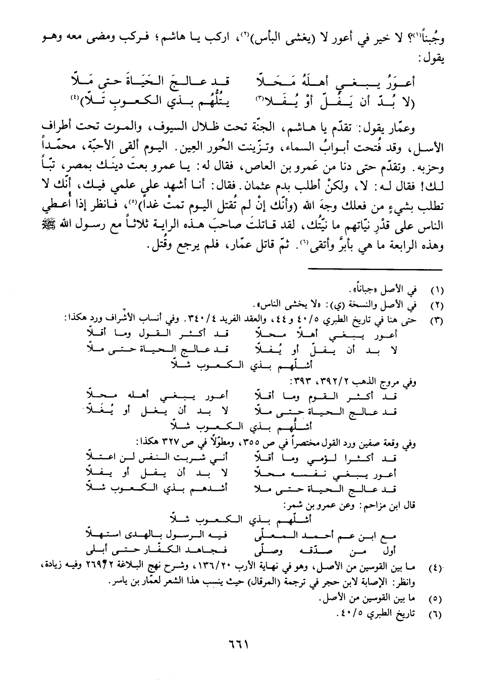 وَعَمَّارٌ يَقُولُ: تَقَدَّمْ يَا هَاشِمُ، الْجَنَّةُ تَحْتَ ظِلَالِ السُّيُوفِ، وَالْمَوْتُ تَحْتَ أَطْرَافِ الْأَسَلِ، وَقَدْ فُتِحَتْ أَبْوَابُ السَّمَاءِ وَتَزَيَّنَتِ الْحُورُ الْعِينُ. الْيَوْمَ أَلْقَى الْأَحِبَّةَ، مُحَمَّدًا وَحِزْبَهُ. وَتَقَدَّمَ حَتَّى دَنَا مِنْ عَمْرِو بْنِ الْعَاصِ فَقَالَ لَهُ: يَا عَمْرُو بِعْتَ دِينَكَ بِمِصْرَ، تَبًّا لَكَ! فَقَالَ لَهُ: لَا، وَلَكِنْ أَطْلُبُ بِدَمِ عُثْمَانَ. قَالَ: أَنَا أَشْهَدُ عَلَى عِلْمِي فِيكَ أَنَّكَ لَا تَطْلُبُ بِشَيْءٍ مِنْ فِعْلِكَ وَجْهَ اللَّهِ، (وَأَنَّكَ إِنْ لَمْ تُقْتَلِ الْيَوْمَ تَمُتْ غَدًا) ، فَانْظُرْ إِذَا أُعْطِيَ النَّاسُ عَلَى قَدْرِ نِيَّاتِهِمْ مَا نِيَّتُكَ، لَقَدْ قَاتَلْتُ صَاحِبَ هَذِهِ الرَّايَةِ ثَلَاثًا مَعَ رَسُولِ اللَّهِ - صَلَّى اللَّهُ عَلَيْهِ وَسَلَّمَ -، وَهَذِهِ الرَّابِعَةُ مَا هِيَ بِأَبَرَّ وَأَتْقَى. ثُمَّ قَاتَلَ عَمَّارٌ فَلَمْ يَرْجِعْ وَقُتِلَ.