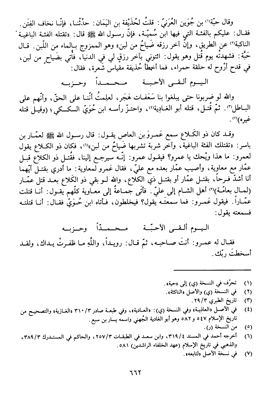 وَقَالَ حَبَّةُ بْنُ جُوَيْنٍ الْعُرَنِيُّ: «قُلْتُ لِحُذَيْفَةَ بْنِ الْيَمَانِ: حَدِّثْنَا فَإِنَّا نَخَافُ الْفِتَنَ. فَقَالَ: عَلَيْكُمْ بِالْفِئَةِ الَّتِي فِيهَا ابْنُ سُمَيَّةَ، فَإِنَّ رَسُولَ اللَّهِ - صَلَّى اللَّهُ عَلَيْهِ وَسَلَّمَ - قَالَ: " تَقْتُلُهُ الْفِئَةُ الْبَاغِيَةُ النَّاكِبَةُ عَنِ الطَّرِيقِ، وَإِنَّ آخِرَ رِزْقِهِ ضَيَاحٌ مِنْ لَبَنٍ» " - وَهُوَ الْمَمْزُوجُ بِالْمَاءِ مِنَ اللَّبَنِ -. قَالَ حَبَّةٌ: فَشَهِدْتُهُ يَوْمَ قُتِلَ وَهُوَ يَقُولُ: ائْتُونِي بِآخِرِ رِزْقٍ لِي فِي الدُّنْيَا، فَأُتِيَ بِضَيَاحٍ مِنْ لَبَنٍ، فِي قَدَحٍ أَرْوَحَ لَهُ حَلْقَةٌ حَمْرَاءُ، فَمَا أَخْطَأَ حُذَيْفَةُ مِقْيَاسَ شَعْرَةٍ، فَقَالَ:
