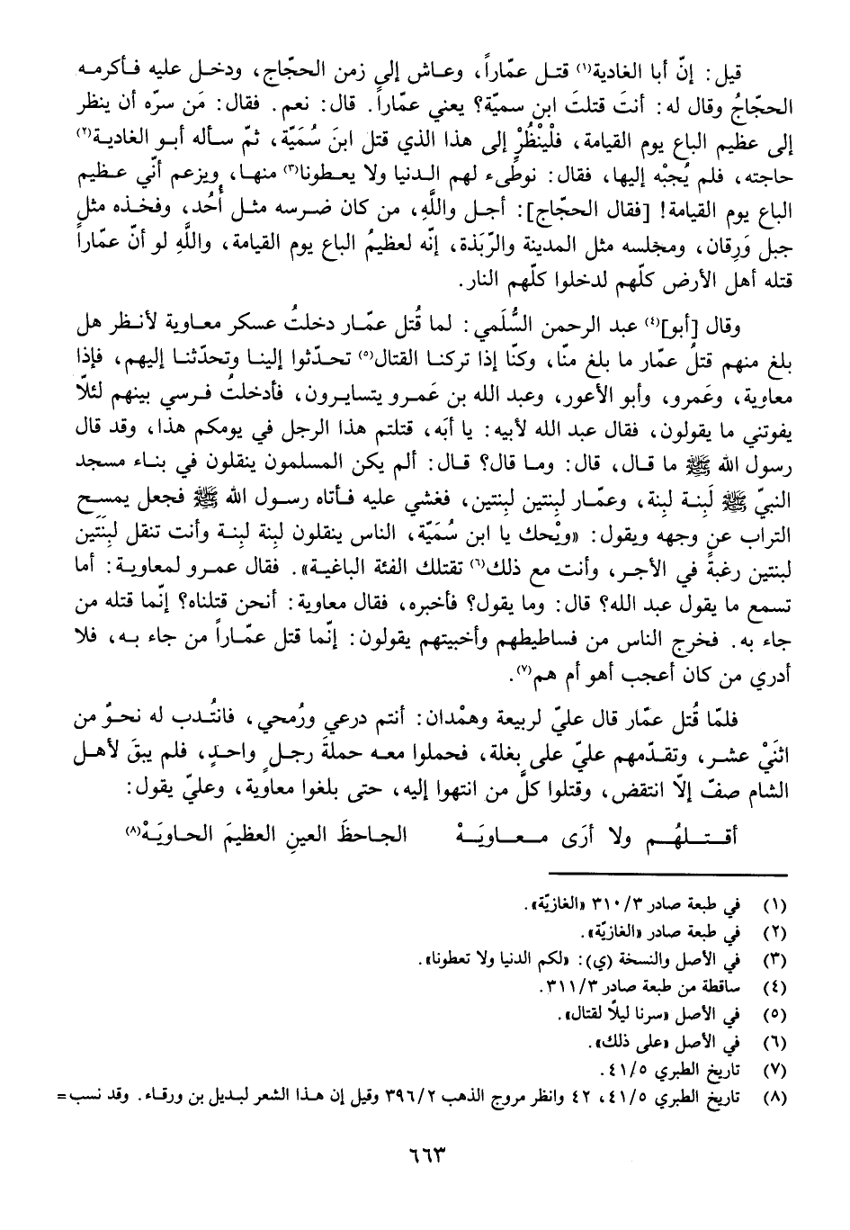 وَقَالَ [أَبُو] عَبْدِ الرَّحْمَنِ السُّلَمِيُّ: لَمَّا قُتِلَ عَمَّارٌ دَخَلْتُ عَسْكَرَ مُعَاوِيَةَ لِأَنْظُرَ هَلْ بَلَغَ مِنْهُمْ قَتْلُ عَمَّارٍ مَا بَلَغَ مِنَّا، وَكُنَّا إِذَا تَرَكْنَا الْقِتَالَ تَحَدَّثُوا إِلَيْنَا وَتَحَدَّثْنَا إِلَيْهِمْ، فَإِذَا مُعَاوِيَةُ، وَعَمْرٌو، وَأَبُو الْأَعْوَرِ، وَعَبْدُ اللَّهِ بْنُ عَمْرٍو، يَتَسَايَرُونَ، فَأَدْخَلْتُ فَرَسِي بَيْنَهُمْ لِئَلَّا يَفُوتَنِي مَا يَقُولُونَ، فَقَالَ عَبْدُ اللَّهِ لِأَبِيهِ: يَا أَبَهْ، قَتَلْتُمْ هَذَا الرَّجُلَ فِي يَوْمِكُمْ هَذَا وَقَدْ قَالَ رَسُولُ اللَّهِ - صَلَّى اللَّهُ عَلَيْهِ وَسَلَّمَ - مَا قَالَ، قَالَ: وَمَا قَالَ؟ قَالَ: «أَلَمْ يَكُنِ الْمُسْلِمُونَ يَنْقُلُونَ فِي بِنَاءِ مَسْجِدِ النَّبِيِّ - صَلَّى اللَّهُ عَلَيْهِ وَسَلَّمَ - لَبِنَةً لَبِنَةً، وَعَمَّارٌ لَبِنَتَيْنِ لَبِنَتَيْنِ، فَغُشِيَ عَلَيْهِ فَأَتَاهُ رَسُولُ اللَّهِ - صَلَّى اللَّهُ عَلَيْهِ وَسَلَّمَ - فَجَعَلَ يَمْسَحُ التُّرَابَ عَنْ وَجْهِهِ وَيَقُولُ: " وَيْحَكَ يَا ابْنَ سُمَيَّةَ، النَّاسُ يَنْقُلُونَ لَبِنَةً لَبِنَةً وَأَنْتَ تَنْقُلُ لَبِنَتَيْنِ لَبِنَتَيْنِ رَغْبَةً فِي الْأَجْرِ، وَأَنْتَ مَعَ ذَلِكَ تَقْتُلُكَ الْفِئَةُ الْبَاغِيَةُ» ". فَقَالَ عَمْرٌو لِمُعَاوِيَةَ: أَمَا تَسْمَعُ مَا يَقُولُ عَبْدُ اللَّهِ؟ قَالَ: وَمَا يَقُولُ؟ فَأَخْبَرَهُ، فَقَالَ مُعَاوِيَةُ: أَنَحْنُ قَتَلْنَاهُ؟ إِنَّمَا قَتَلَهُ مَنْ جَاءَ بِهِ، فَلَا أَدْرِي مَنْ كَانَ أَعْجَبَ أَهُوَ أَمْ هُمْ.