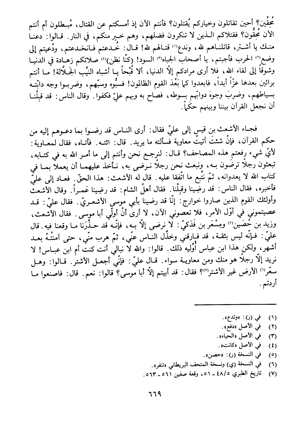 مُحِقِّينَ؟ أَحِينَ تُقَاتِلُونَ وَخِيَارُكُمْ يُقْتَلُونَ؟ فَأَنْتُمُ الْآنَ إِذْ أَمْسَكْتُمْ عَنِ الْقِتَالِ، مُبْطِلُونَ أَمْ أَنْتُمُ الْآنَ مُحِقُّونَ؟ فَقَتْلَاكُمُ الَّذِينَ لَا تُنْكِرُونَ فَضْلَهُمْ، وَهُمْ خَيْرٌ مِنْكُمْ، فِي النَّارِ. قَالُوا: دَعْنَا مِنْكَ يَا أَشْتَرُ، قَاتَلْنَاهُمْ لِلَّهِ، وَنَدَعُ قِتَالَهُمْ لِلَّهِ! قَالَ: خُدِعْتُمْ فَانْخَدَعْتُمْ، وَدُعِيتُمْ إِلَى وَضْعِ الْحَرْبِ فَأَجَبْتُمْ، يَا أَصْحَابَ الْجِبَاهِ السُّودِ! (كُنَّا نَظُنُّ) صَلَاتَكُمْ زَهَادَةً فِي الدُّنْيَا وَشَوْقًا إِلَى لِقَاءِ اللَّهِ، فَلَا أَرَى مُرَادَكُمْ إِلَّا الدُّنْيَا، أَلَا قُبْحًا يَا أَشْبَاهَ النَّيِّبِ الْجَلَّالَةِ! مَا أَنْتُمْ بِرَائِينَ بَعْدَهَا عِزًّا أَبَدًا، فَابْعُدُوا كَمَا بَعُدَ الْقَوْمُ الظَّالِمُونَ! فَسَبُّوهُ وَسَبَّهُمْ، وَضَرَبُوا وَجْهَ دَابَّتِهِ بِسِيَاطِهِمْ، وَضَرَبَ وُجُوهَ دَوَابِّهِمْ بِسَوْطِهِ، فَصَاحَ بِهِ وَبِهِمْ عَلِيٌّ فَكَفُّوا. وَقَالَ النَّاسُ: قَدْ قَبِلْنَا أَنْ نَجْعَلَ الْقُرْآنَ بَيْنَنَا وَبَيْنَهُمْ حَكَمًا.