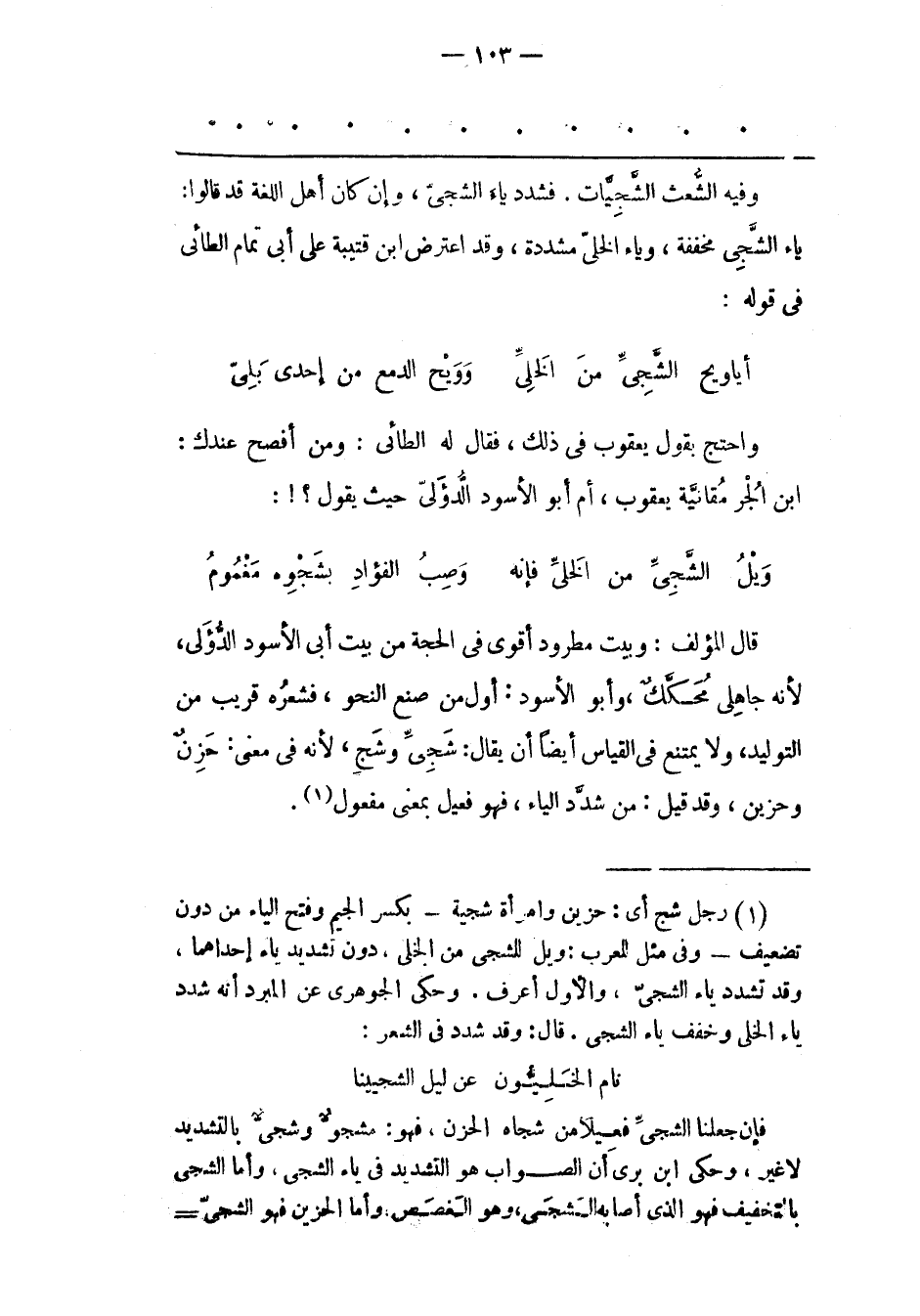 قَالَ الْمُؤَلّفُ: وَبَيْتُ مَطْرُودٍ أَقْوَى فِي الْحُجّةِ مِنْ بَيْتِ أَبِي الْأَسْوَدِ الدّؤَلِيّ، لِأَنّهُ جَاهِلِيّ مُحَكّكٌ، وَأَبُو الْأَسْوَدِ: أَوّلُ مَنْ صَنَعَ النّحْوَ، فَشِعْرُهُ قَرِيبٌ مِنْ التّوْلِيدِ، وَلَا يَمْتَنِعُ فِي الْقِيَاسِ أَيْضًا أَنْ يُقَالَ: شَجِيّ وَشَجٍ، لِأَنّهُ فِي مَعْنَى: حَزِنٌ وَحَزِينٌ، وَقَدْ قِيلَ: مَنْ شَدّدَ الْيَاءَ، فَهُوَ فَعِيلٌ بِمَعْنَى مفعول «1» .