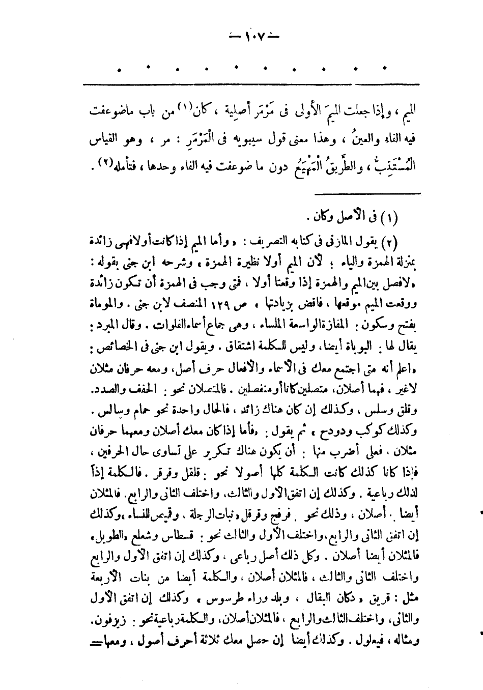 (2) يقول المازنى فى كتابه التصريف: «وأما الميم إذا كانت أولا فهى زائدة بمنزلة الهمزة والياء؛ لأن الميم أولا نظيرة الهمزة» وشرحه ابن جنى بقوله: «لا فصل بين الميم والهمزة إذا وقعتا أولا، فمتى وجب فى الهمزة أن تكون زائدة ووقعت الميم موقعها، فاقض بزيادتها» ص 129 المنصف لابن جنى. والموماة بفتح وسكون: المفازة الواسعة الملساء، وهى جماع أسماء الفلوات. وقال المبرد: يقال لها: البوباة أيضا، وليس للكلمة اشتقاق. ويقول ابن جنى فى الخصائص: «اعلم أنه متى اجتمع معك فى الأسماء والأفعال حرف أصل، ومعه حرفان مثلان لا غير، فهما أصلان، متصلين كانا أو منفصلين. فالمتصلان نحو: الحفف والصدد. وقلق وسلس، وكذلك إن كان هناك زائد، فالحال واحدة نحو حمام وسالس. وكذلك كوكب ودودح» ثم يقول: «فأما إذا كان معك أصلان ومعهما حرفان مثلان، فعلى أضرب منها: أن يكون هناك تكرير على تساوى حال الحرفين، فإذا كانا كذلك كانت الكلمة كلها أصولا نحو: قلقل وقرقر. فالكلمة إذا لذلك رباعية. وكذلك إن اتفق الأول والثالث، واختلف الثانى والرابع، فالمثلان أيضا. أصلان، وذلك نحو. فرفج وقرقل «نبات الرجلة، وقميص للنساء» وكذلك إن اتفق الثانى والرابع، واختلف الأول والثالث نحو: قسطاس وشعلع «الطويل» فالمثلان أيضا أصلان. وكل ذلك أصل رباعى، وكذلك إن اتفق الأول والرابع واختلف الثانى والثالث، فالمثلان أصلان، والكلمة أيضا من بنات الأربعة مثل: قريق «دكان البقال، وبلد وراء طرسوس» وكذلك إن اتفق الأول والثانى، واختلف الثالث والرابع، فالمثلان أصلان، والكلمة رباعية نحو: زيزفون. ومثاله، فيعلول. وكذلك أيضا إن حصل معك ثلاثة أحرف أصول، ومعها-